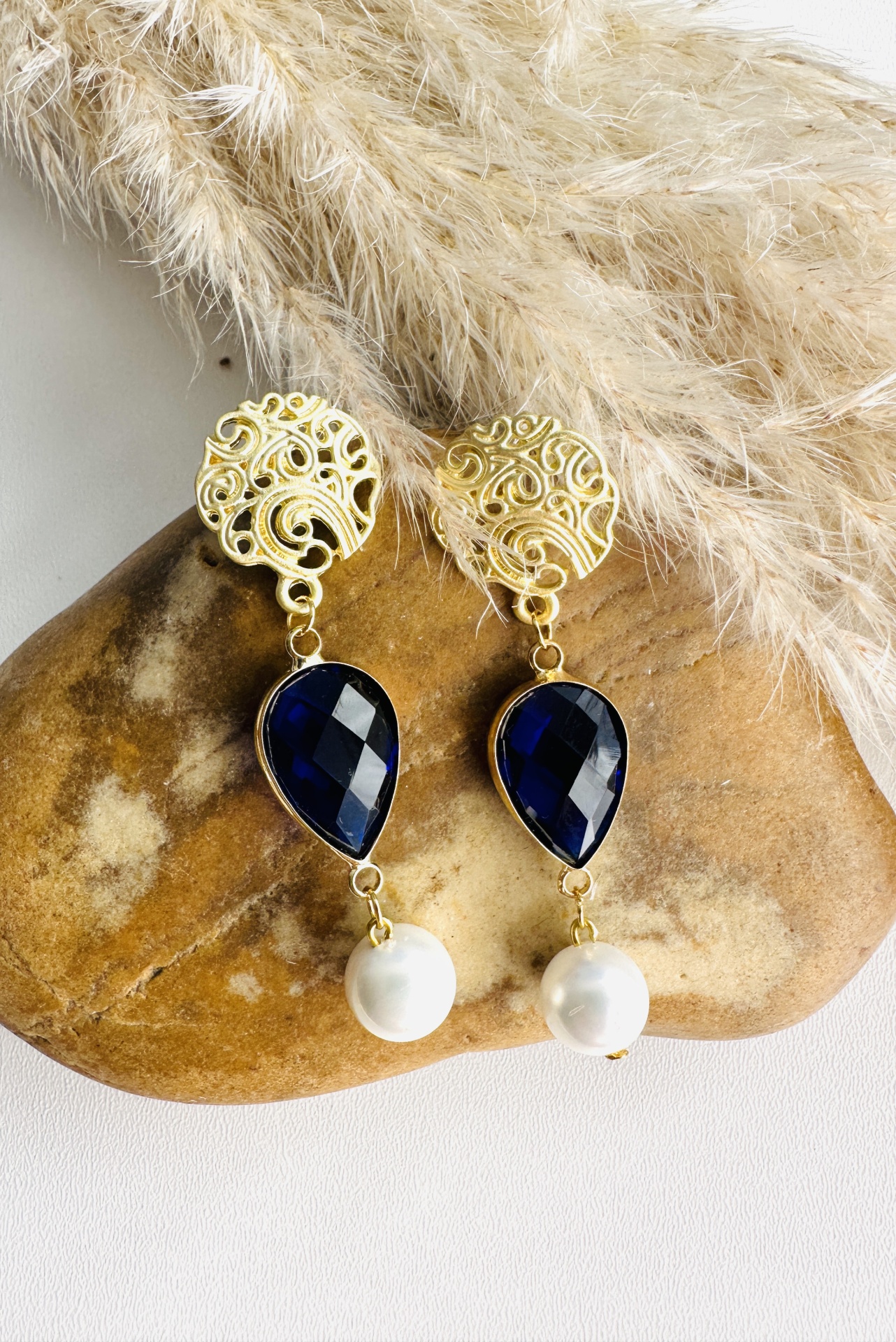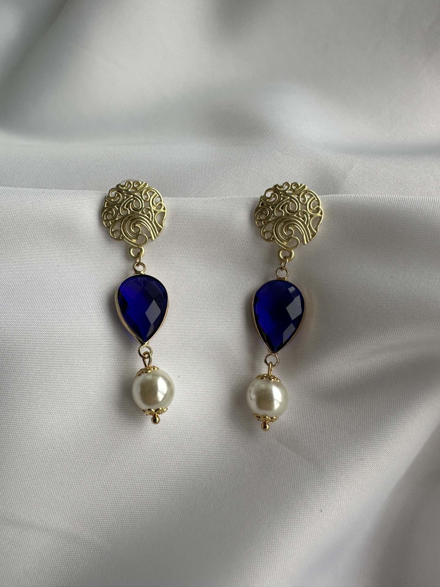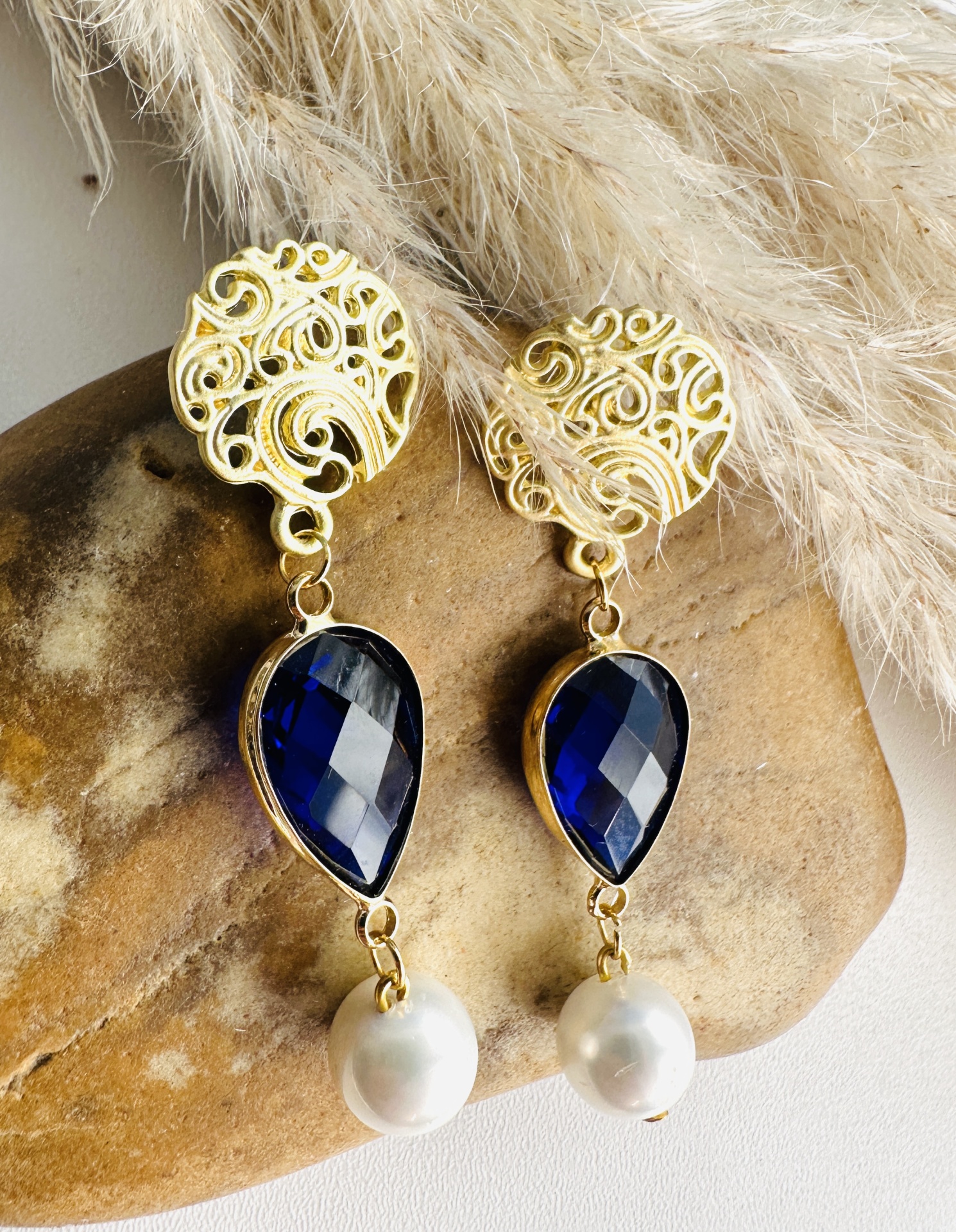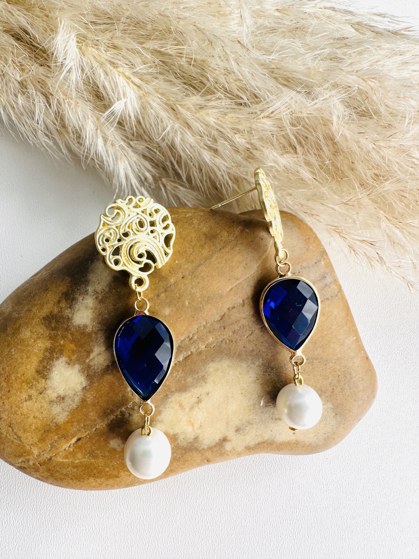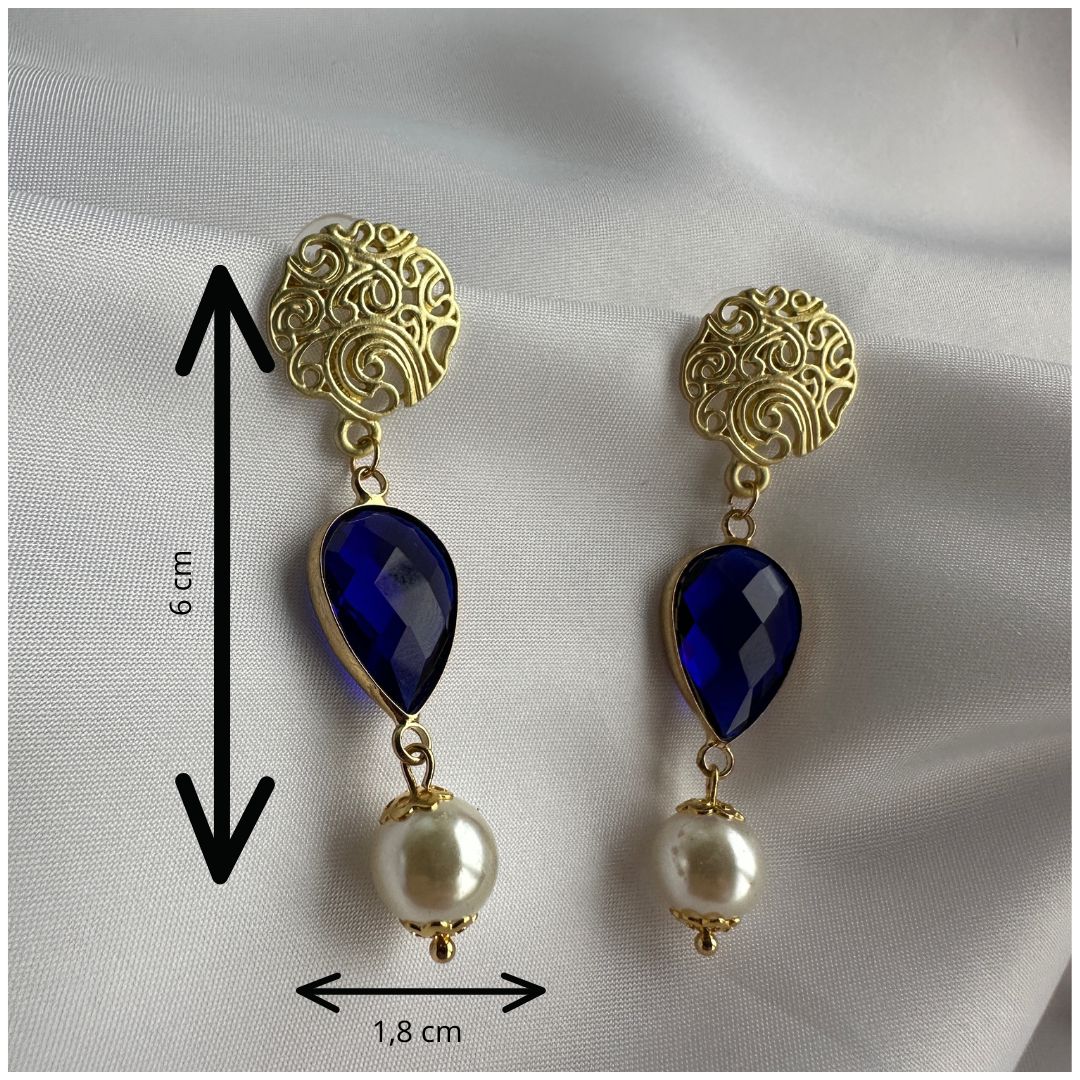 Encante-se com a beleza única destes brincos deslumbrantes! Combina cristais em tons profundos de azul com a pérola e o dourado, esta joia é perfeita para elevar qualquer visual com um toque de sofisticação e glamour.