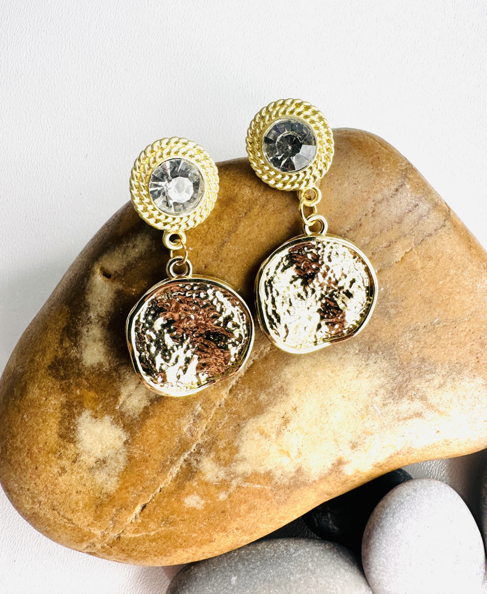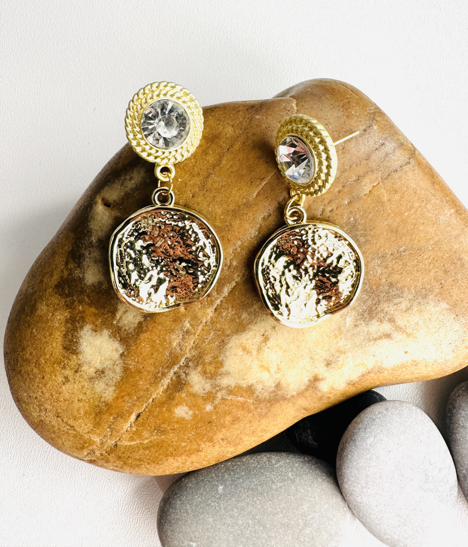Cada brinco apresenta um pêndulo redondo delicadamente martelado, criando uma textura visualmente interessante que reflete a luz de maneira única. O martelado confere uma sensação artesanal e um toque de rusticidade refinada aos brincos.