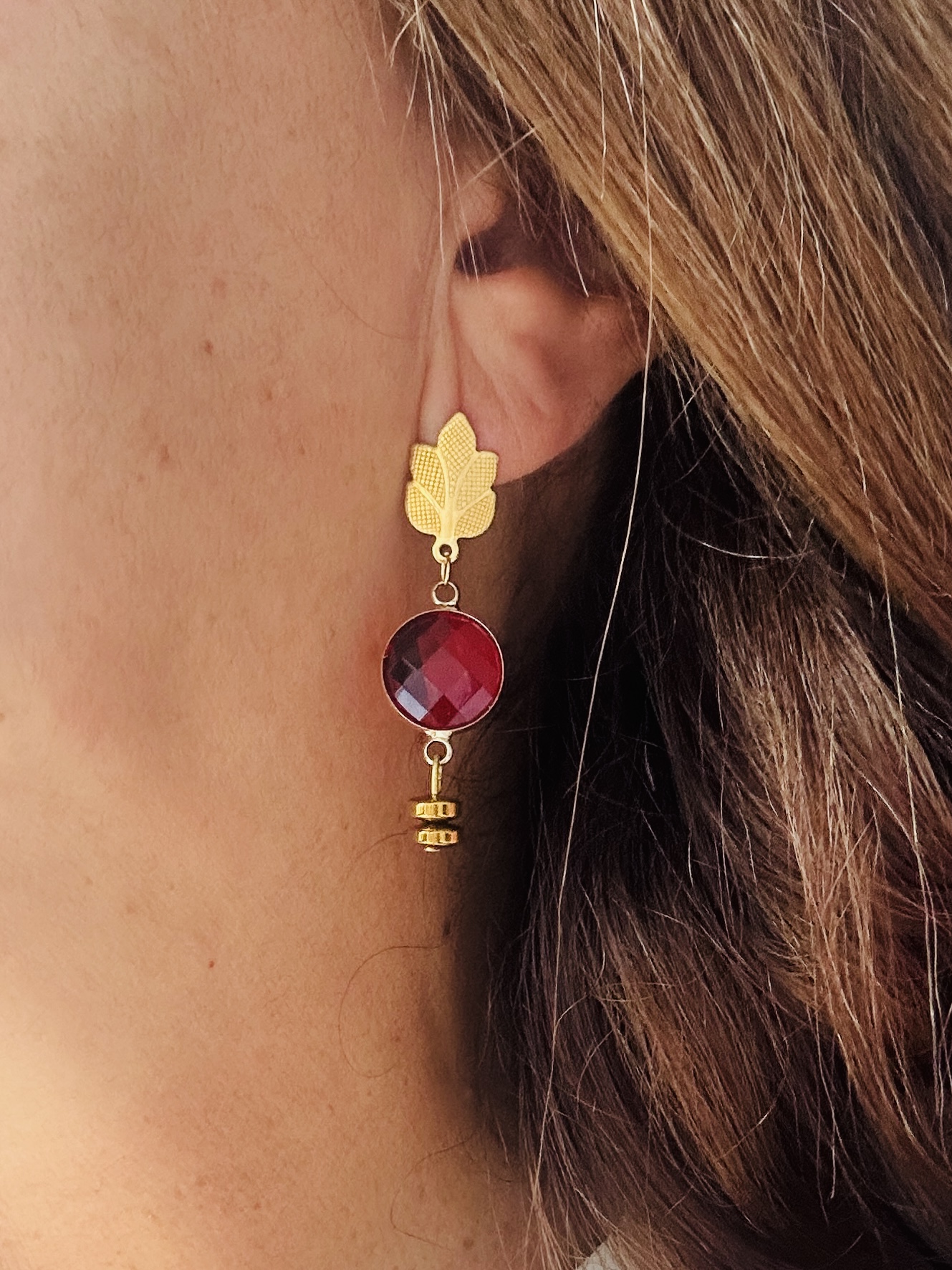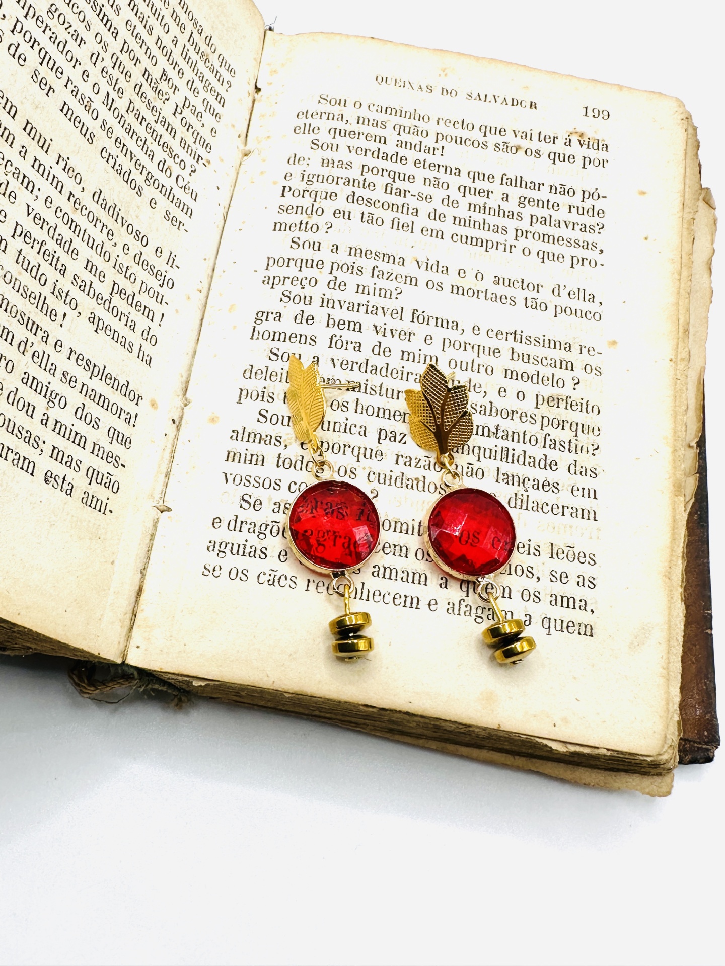 Porque cada mulher merece um adorno único, estes brincos carregam um simbolismo profundo de renovação e vida. A folha dourada no topo representa o crescimento e a ligação à natureza, enquanto a pedra vermelha central simboliza o entusiasmo, o vigor e a coragem. É um amuleto de empoderamento desenhado para ser o toque final de confiança no seu visual.
