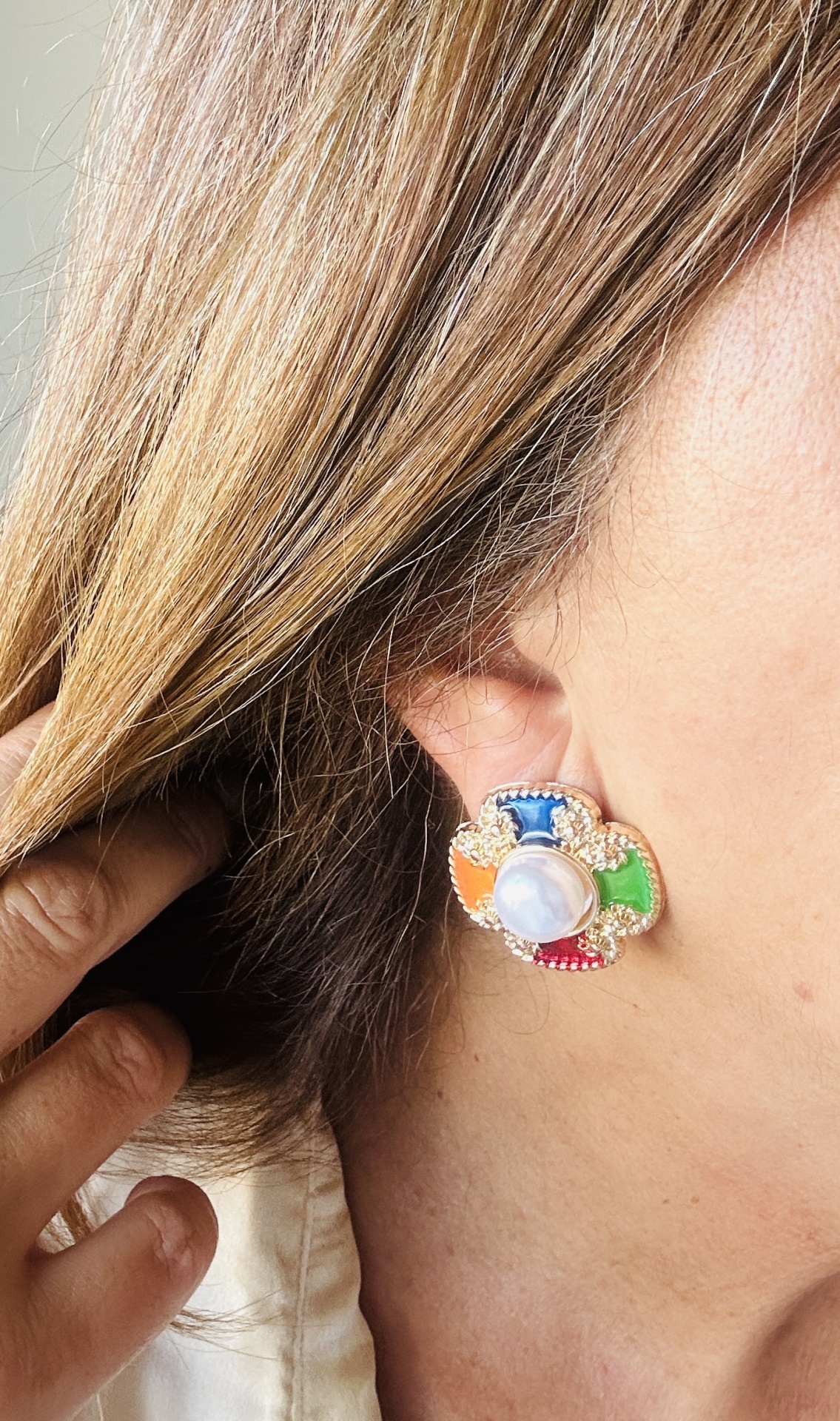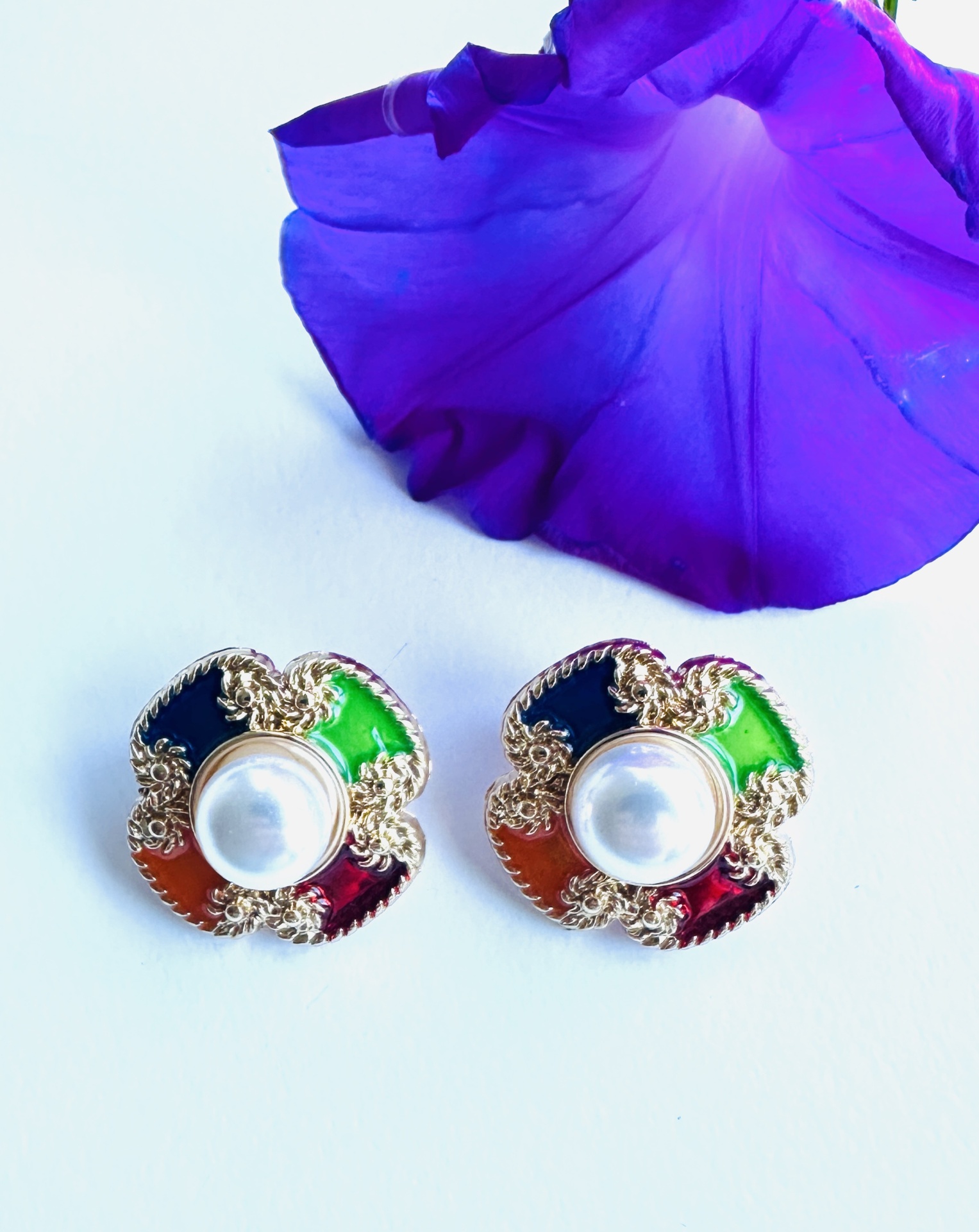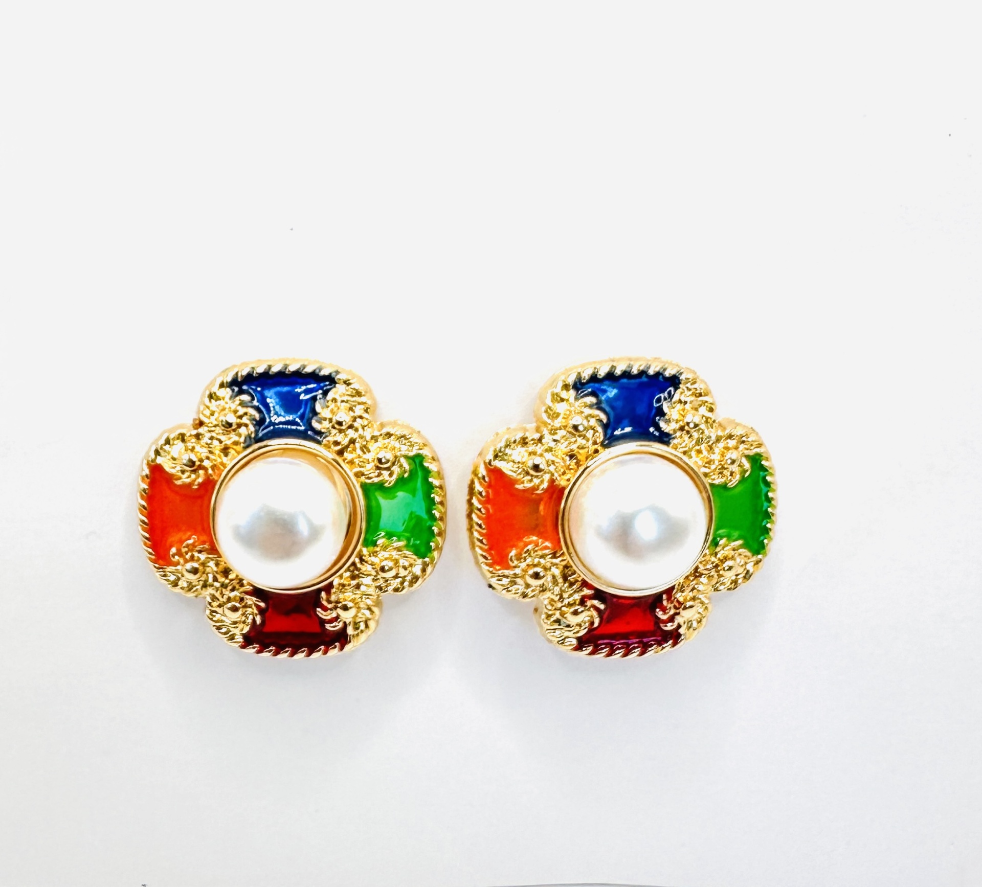 O corpo dos brincos apresenta quatro segmentos esmaltados em vermelho, azul, verde e bordeaux, emoldurados por acabamento dourado texturizado, ao centro uma pérola sintética luminosa, símbolo de feminilidade, equilíbrio e requinte. São ótimos para tapar aquele furo mais feio.