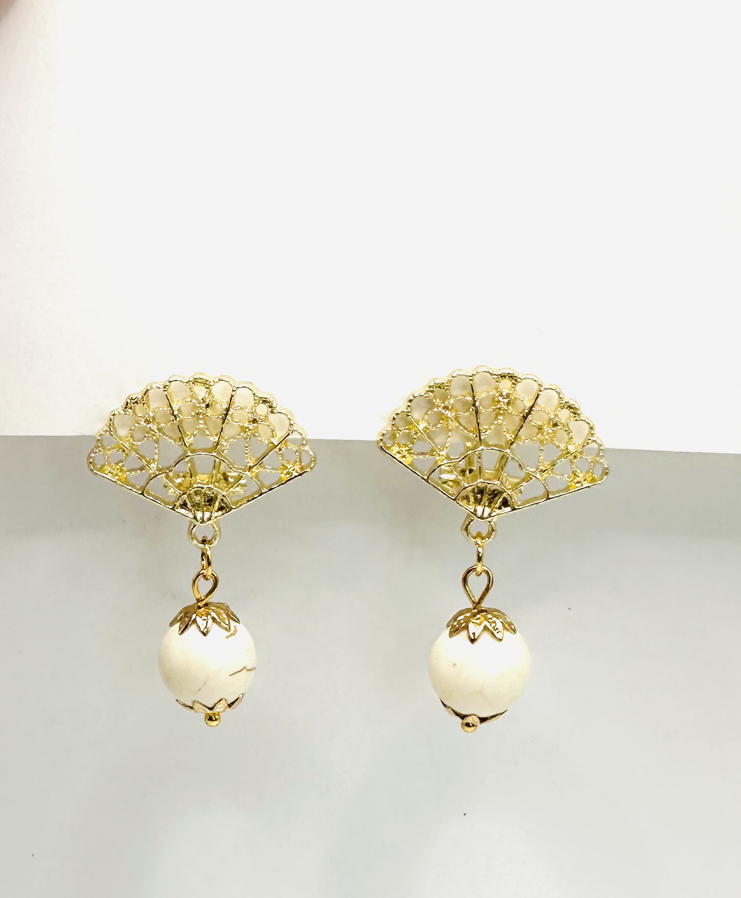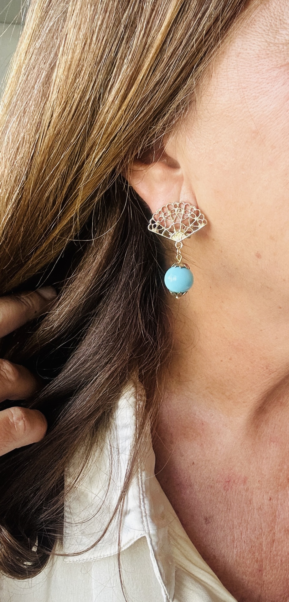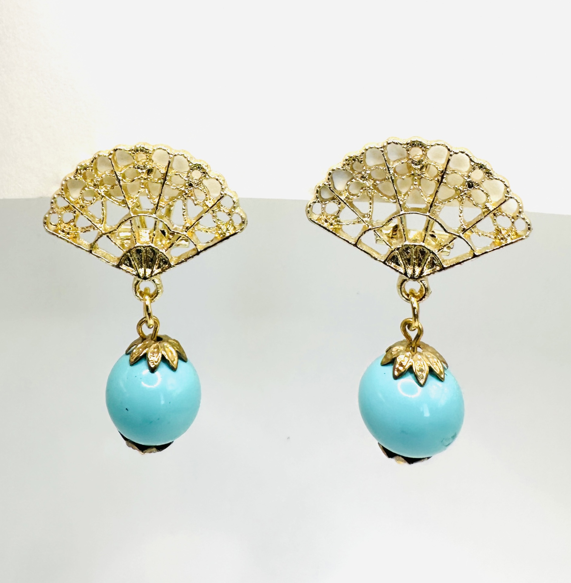 Estes brincos são uma ode à delicadeza e ao brilho. O topo, em forma de leque, é meticulosamente trabalhado em metal dourado com um design filigranado que evoca a graciosidade de peças vintage. Cada detalhe irradia sofisticação e leveza. Pendendo elegantemente de cada leque, encontra-se uma esfera de um vibrante tom de turquesa ou branca, coroada por um delicado detalhe floral em dourado, que complementa harmoniosamente o leque superior. O contraste entre o dourado cintilante e o azul turquesa ou branco vibrante cria um impacto visual imediato, capturando olhares e realçando a sua beleza natural.