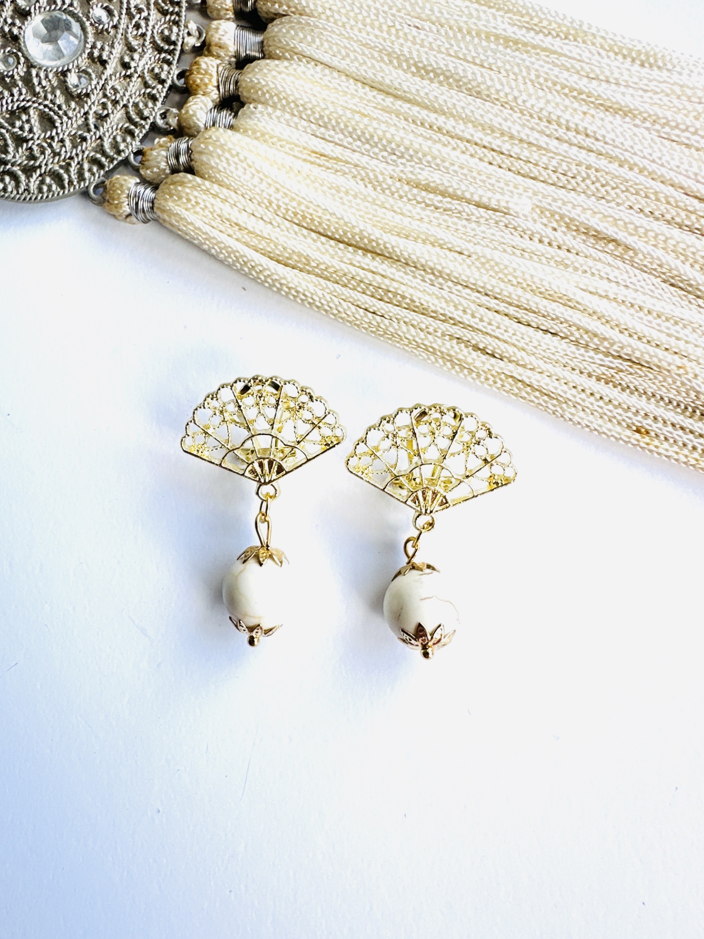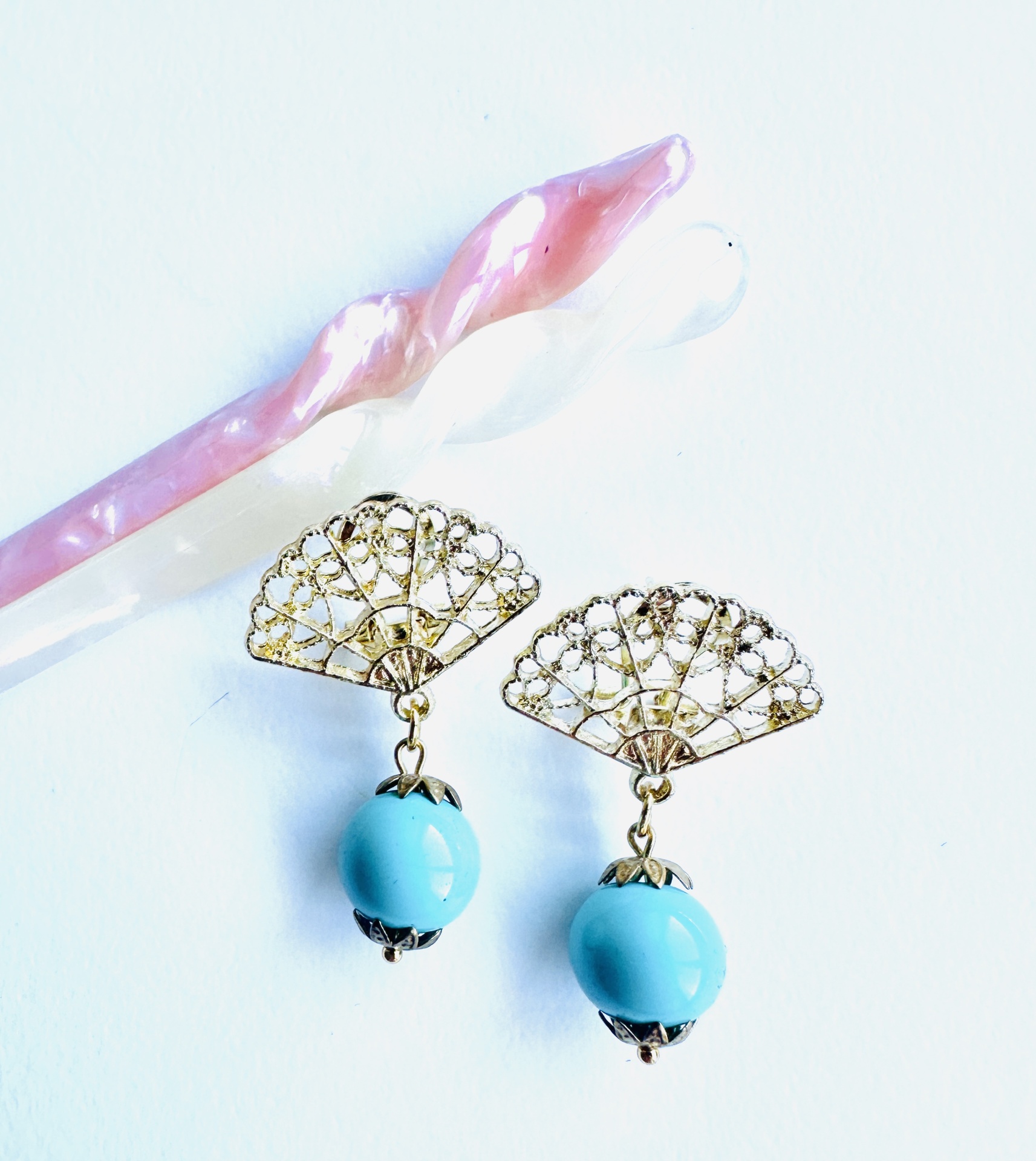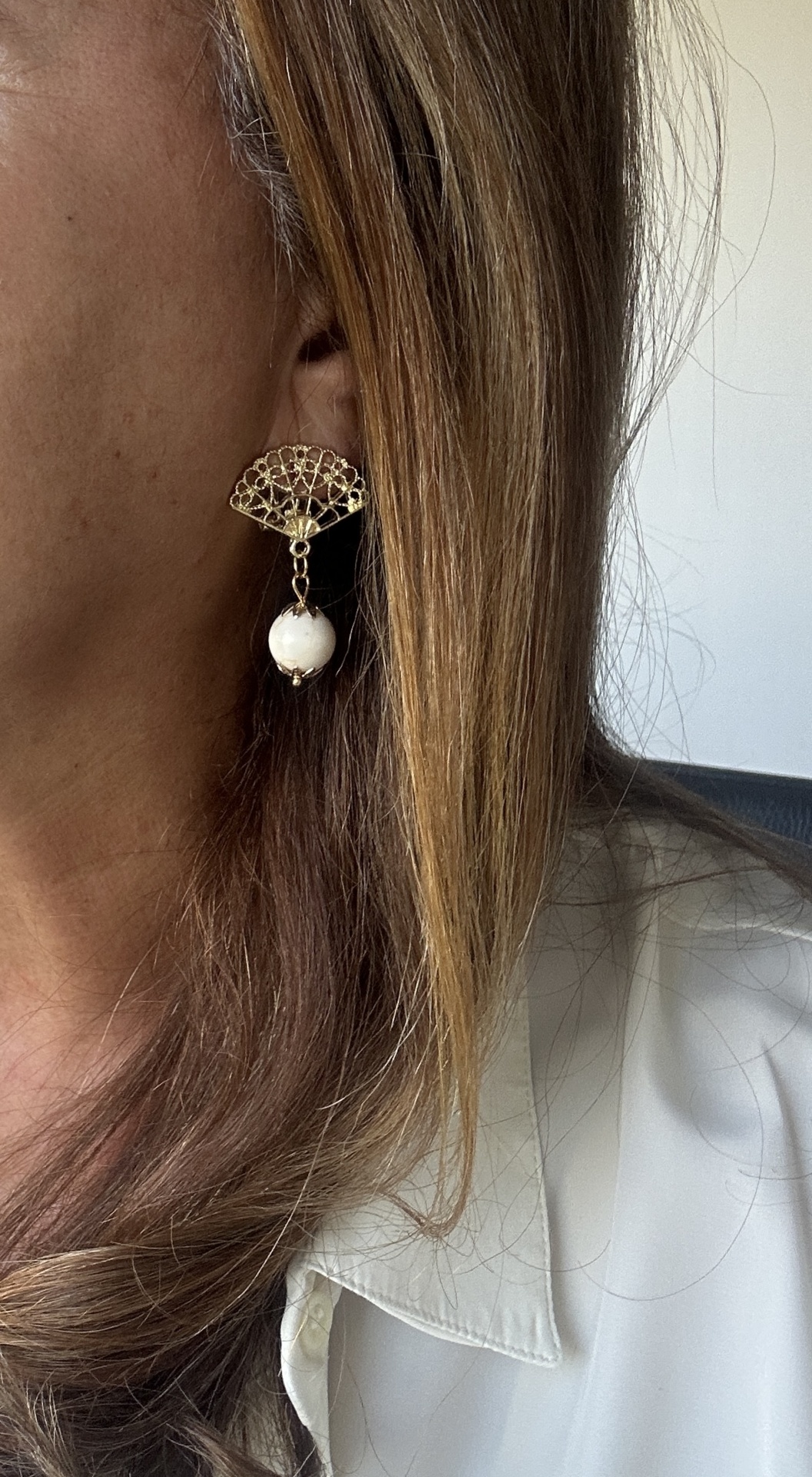 Estes brincos são uma ode à delicadeza e ao brilho. O topo, em forma de leque, é meticulosamente trabalhado em metal dourado com um design filigranado que evoca a graciosidade de peças vintage. Cada detalhe irradia sofisticação e leveza. Pendendo elegantemente de cada leque, encontra-se uma esfera de um vibrante tom de turquesa ou branca, coroada por um delicado detalhe floral em dourado, que complementa harmoniosamente o leque superior. O contraste entre o dourado cintilante e o azul turquesa ou branco vibrante cria um impacto visual imediato, capturando olhares e realçando a sua beleza natural.