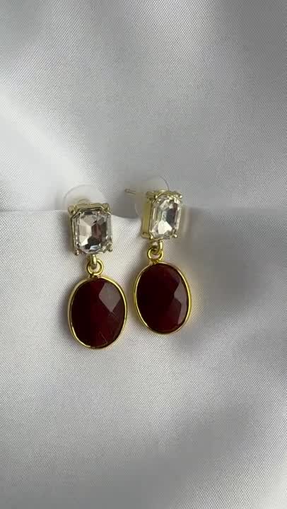Encante-se com a beleza única destes brincos deslumbrantes! Combina pedras naturais em tons profundos de rubi e cristais brilhantes, esta joia é perfeita para elevar qualquer visual com um toque de sofisticação e glamour.