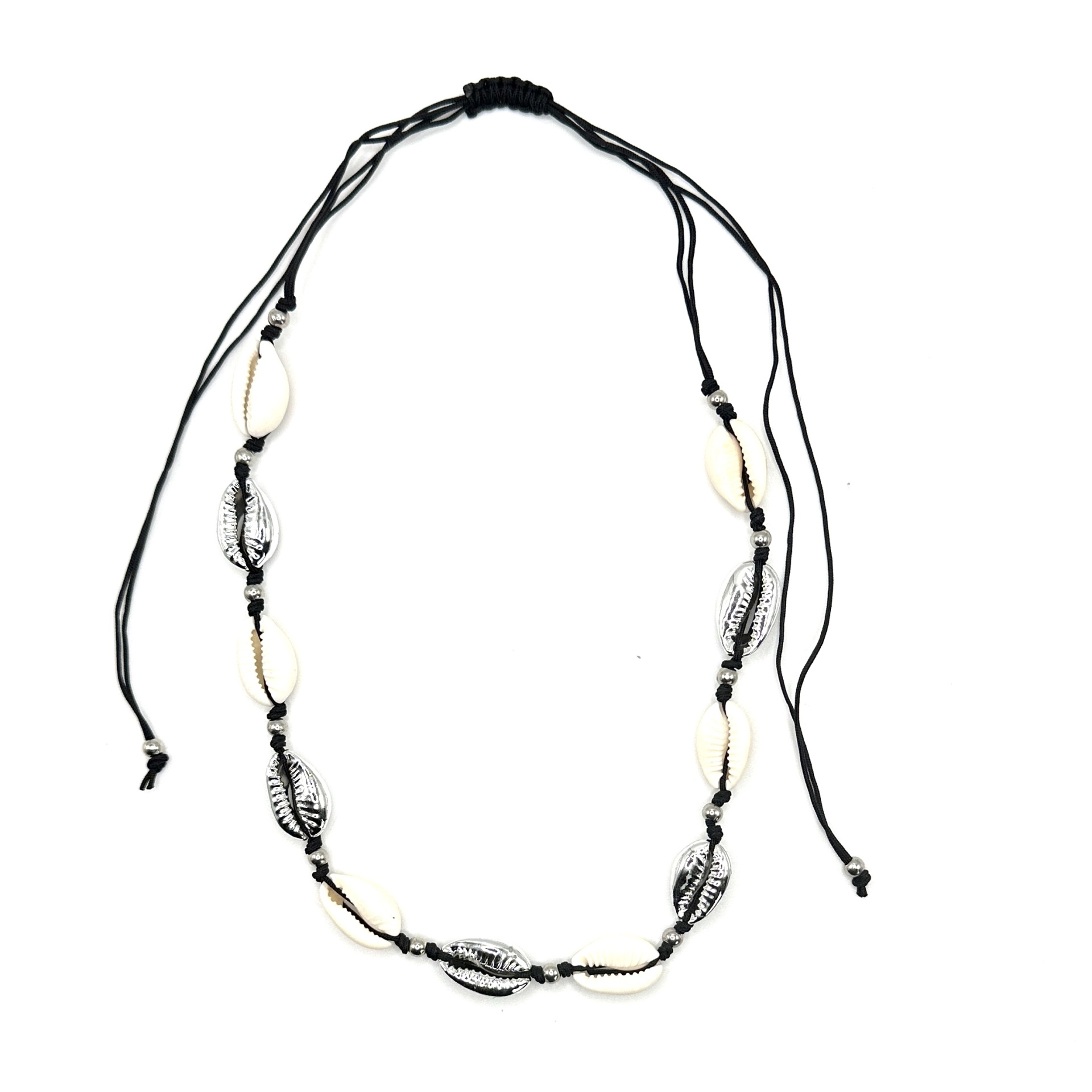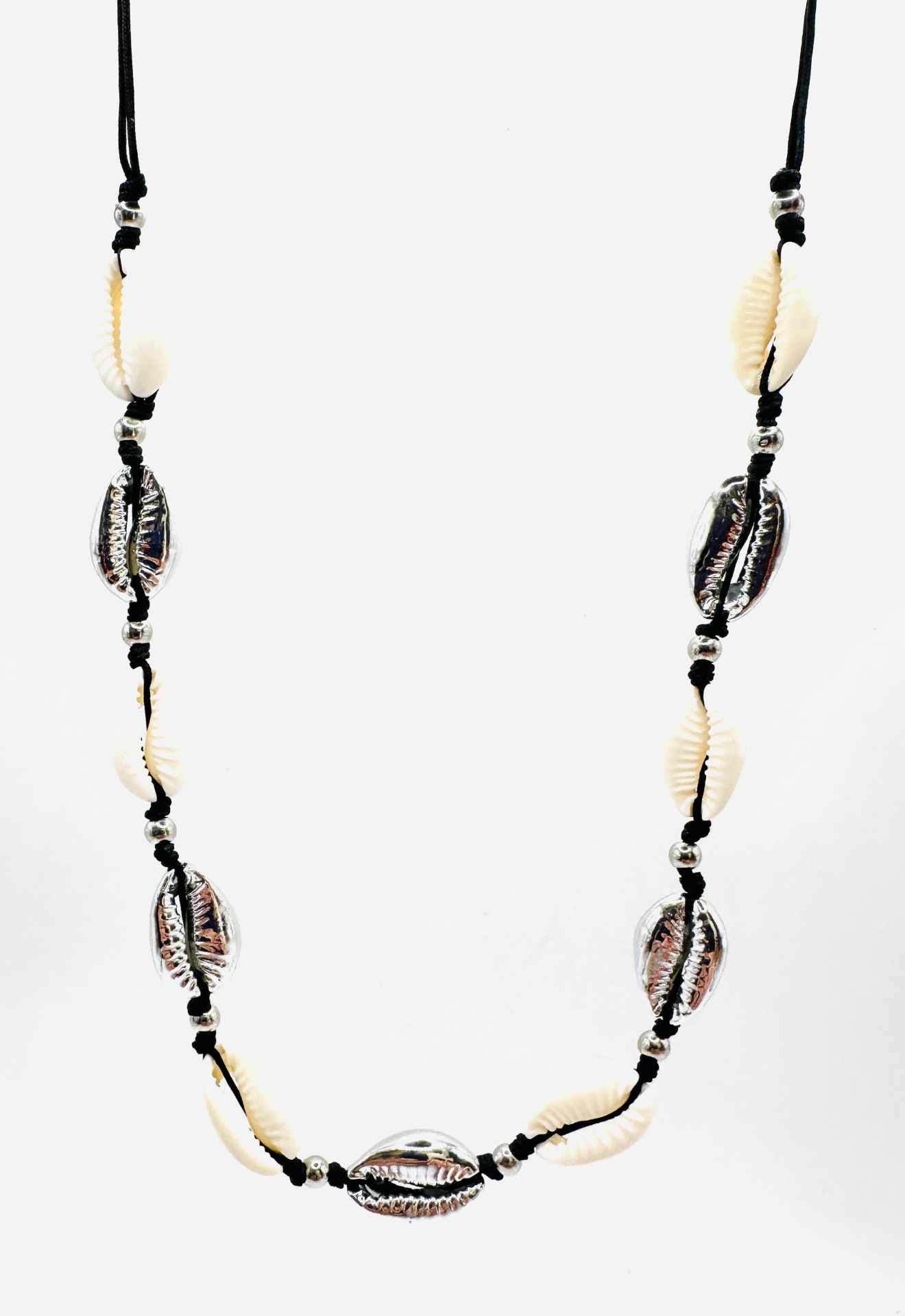 Este colar ajustável é perfeito para quem aprecia a praia e a beleza natural do mar. Feito com uma combinação de búzios naturais e búzios prateados, captura a essência do oceano de uma forma elegante e moderna.