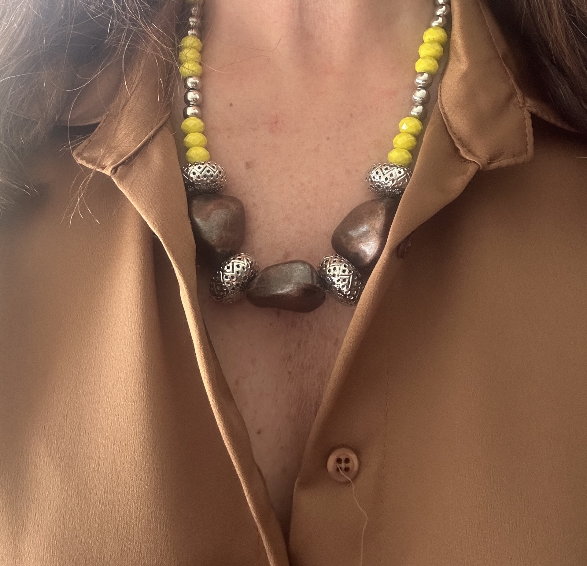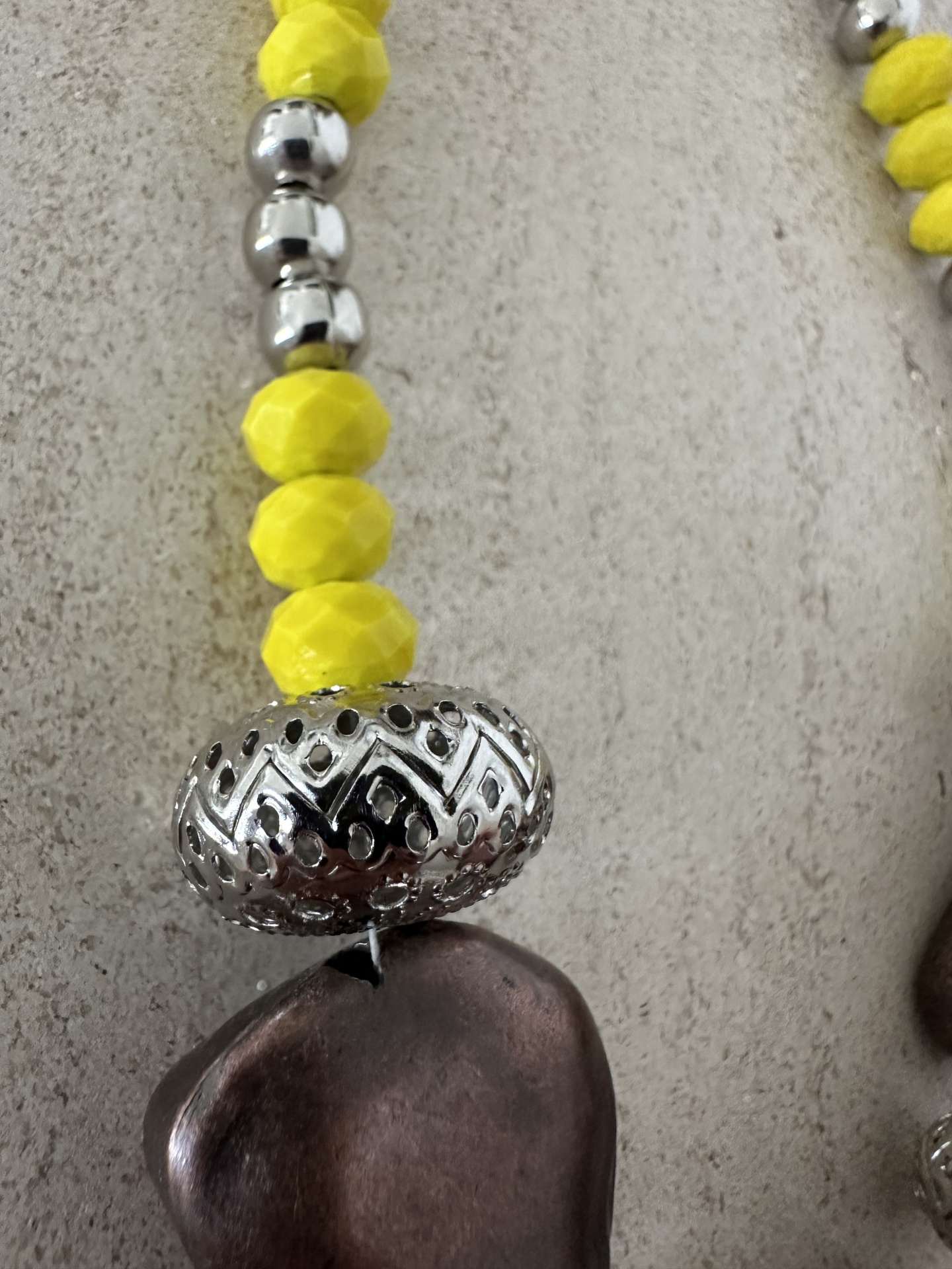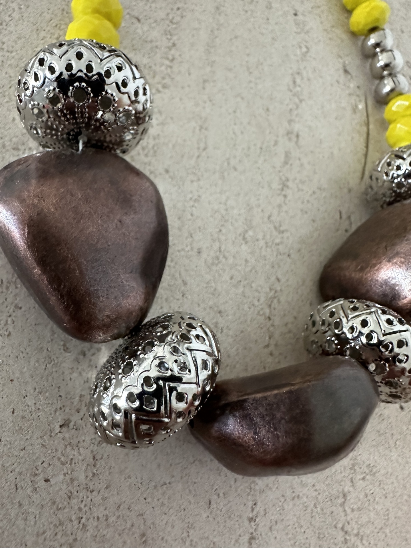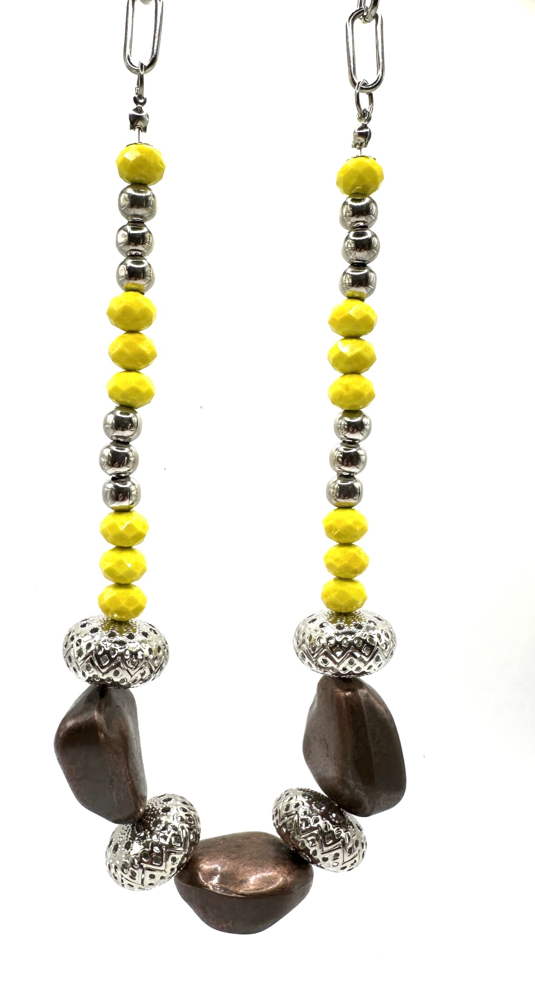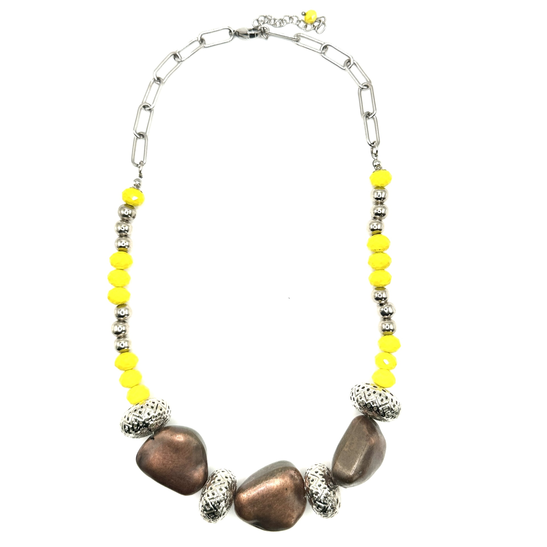 Detalhes, material e cor: Este tesouro da Rafi Store destaca-se pela sua composição rica em texturas e cores. A peça apresenta uma sequência de contas amarelas facetadas que captam a luz, intercaladas com esferas prateadas lisas. No centro, sobressaem três contas orgânicas de tom bronze metalizado, separadas por contas metálicas trabalhadas com padrões geométricos vazados, conferindo um toque de sofisticação e detalhe único.