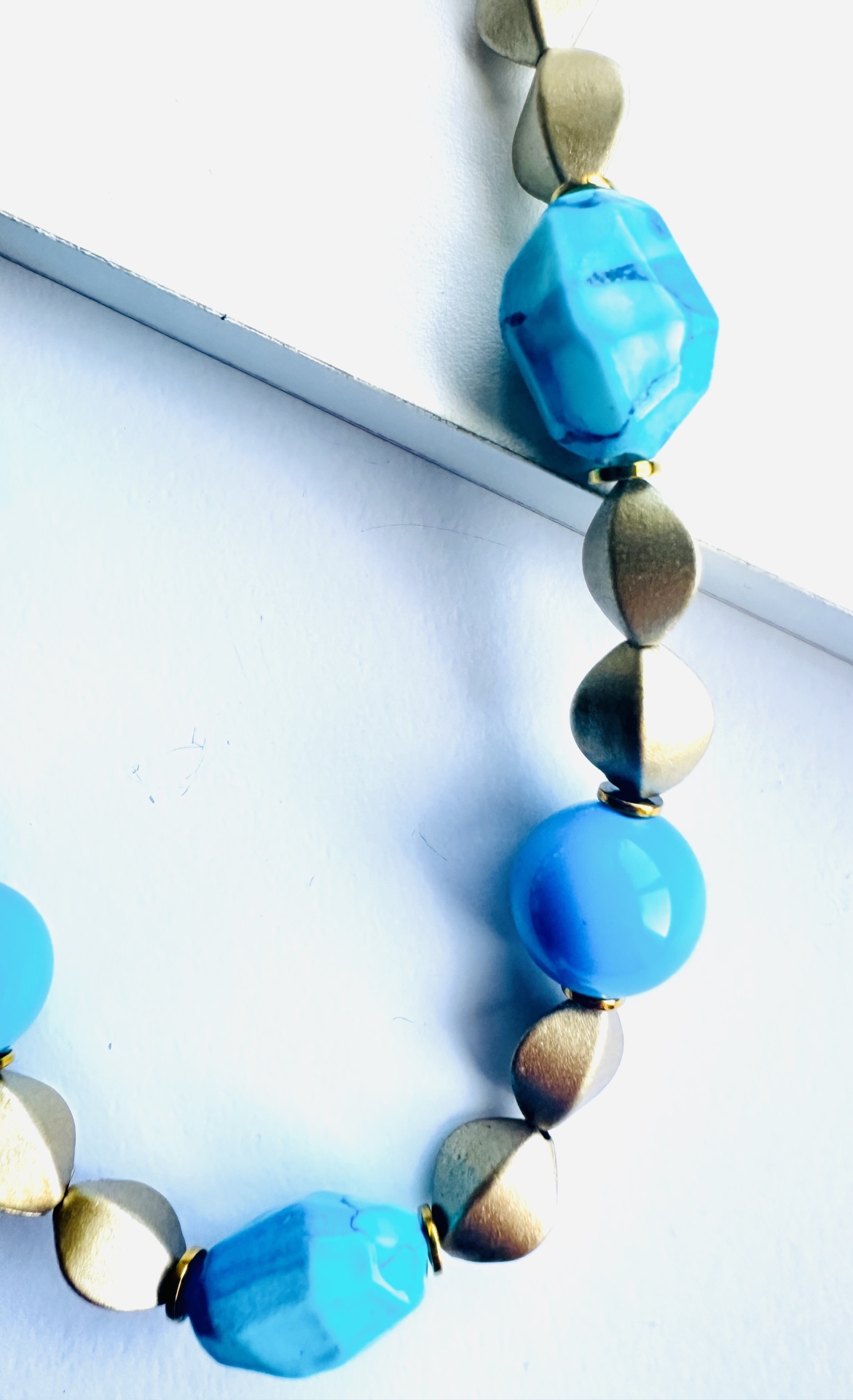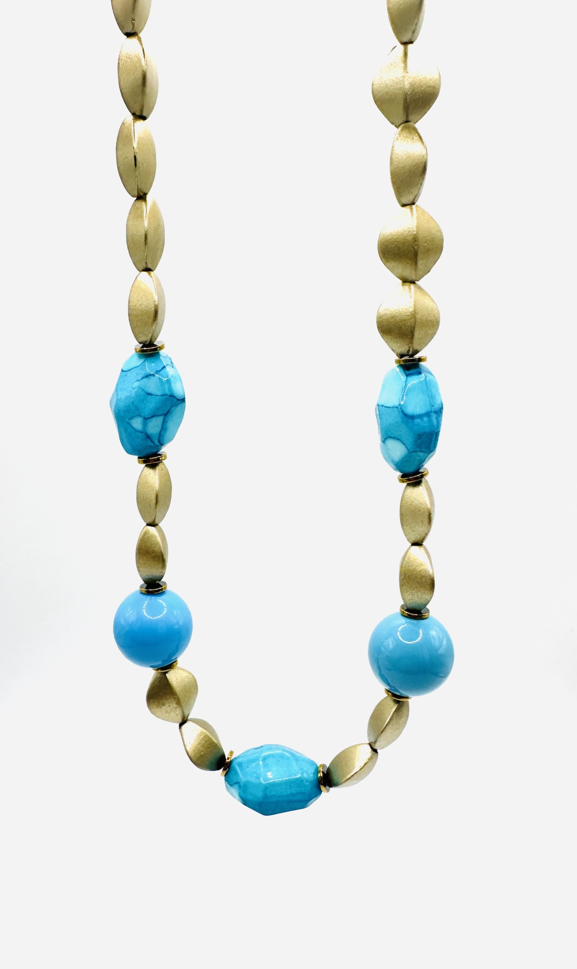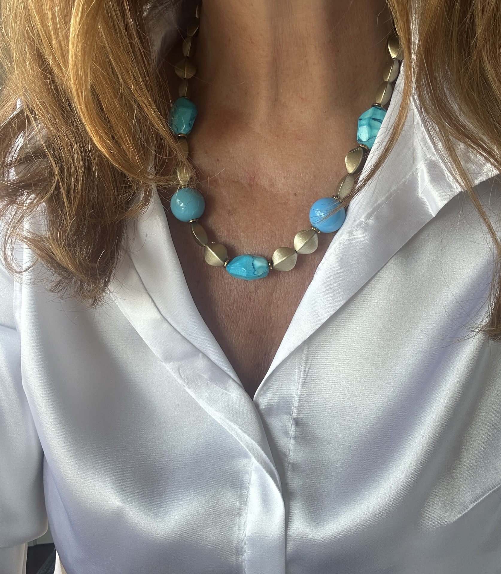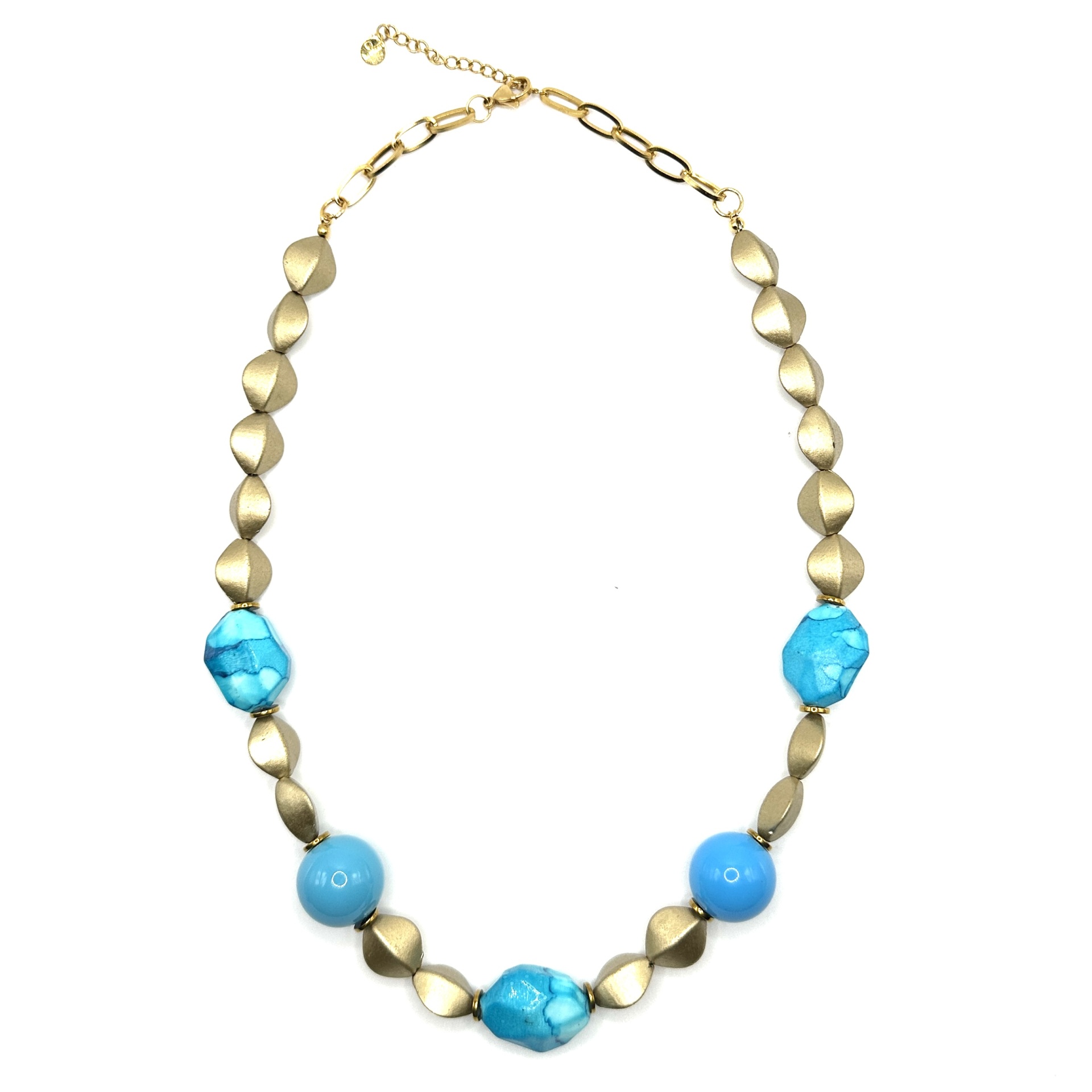 O nosso Colar Azul Turquesa e Dourado Mate, uma joia que irradia confiança, serenidade e o seu poder de auto-recompensa e empoderamento. Este colar é mais do que um acessório; é uma afirmação de estilo que combina a calma do azul com o luxo subtil do dourado. O azul vibrante evoca a tranquilidade do oceano, a inspiração e a comunicação, enquanto o dourado, com o seu acabamento mate, simboliza prosperidade, elegância discreta e calor.