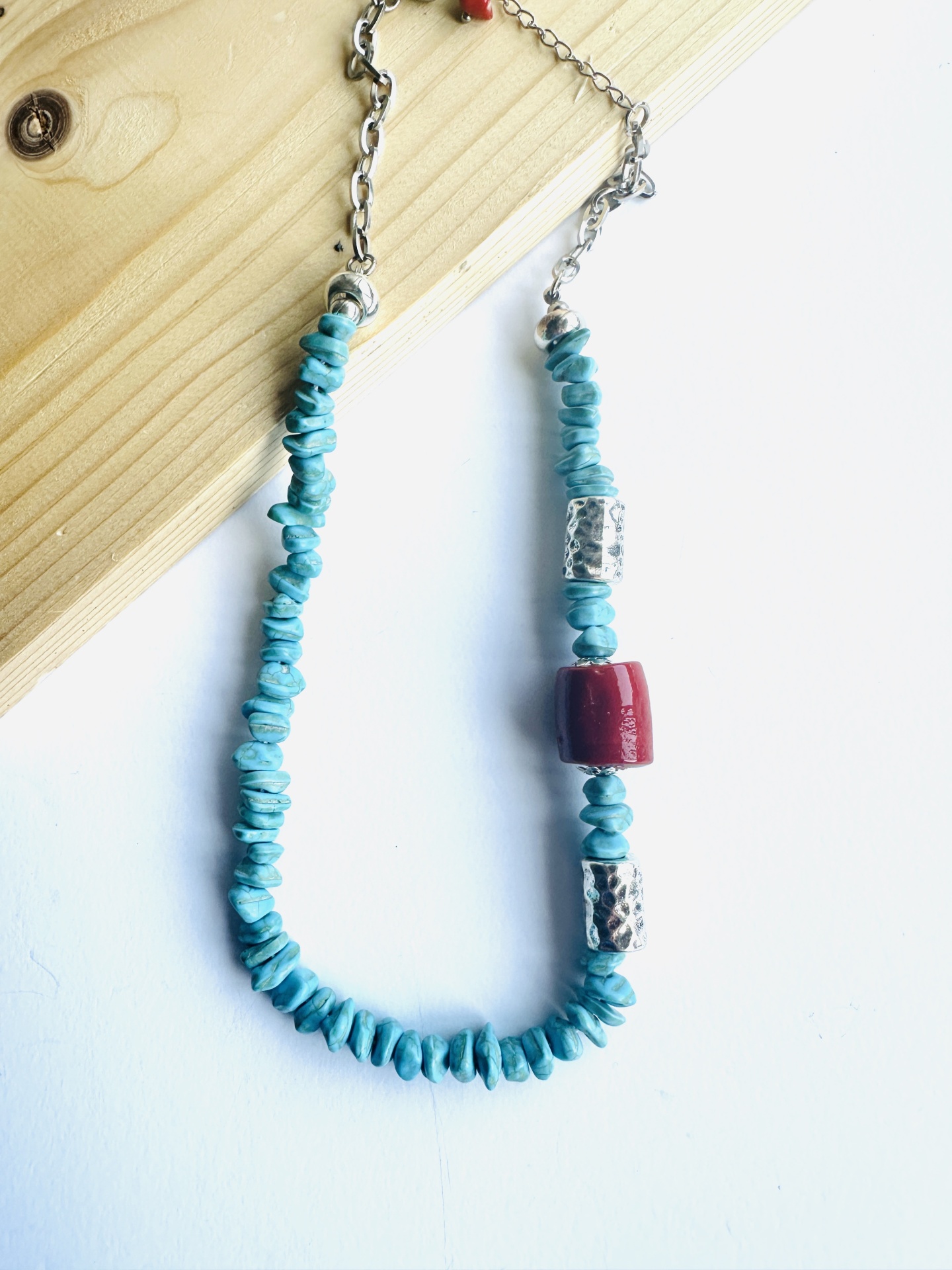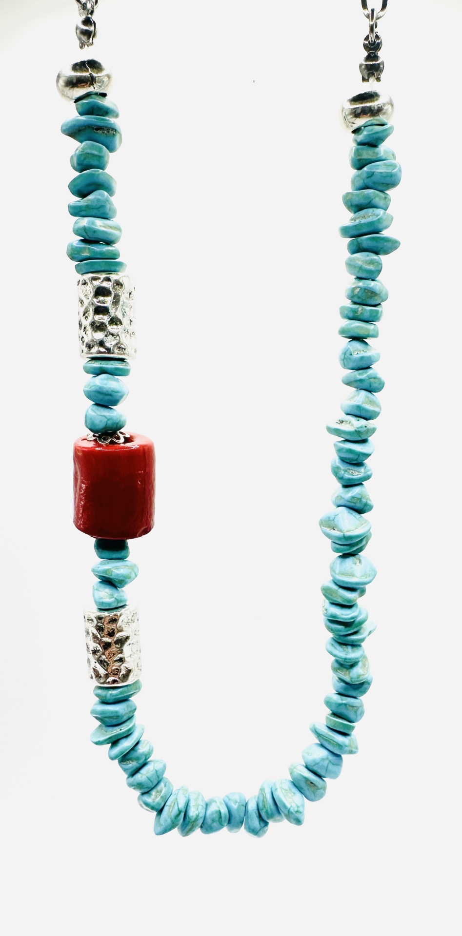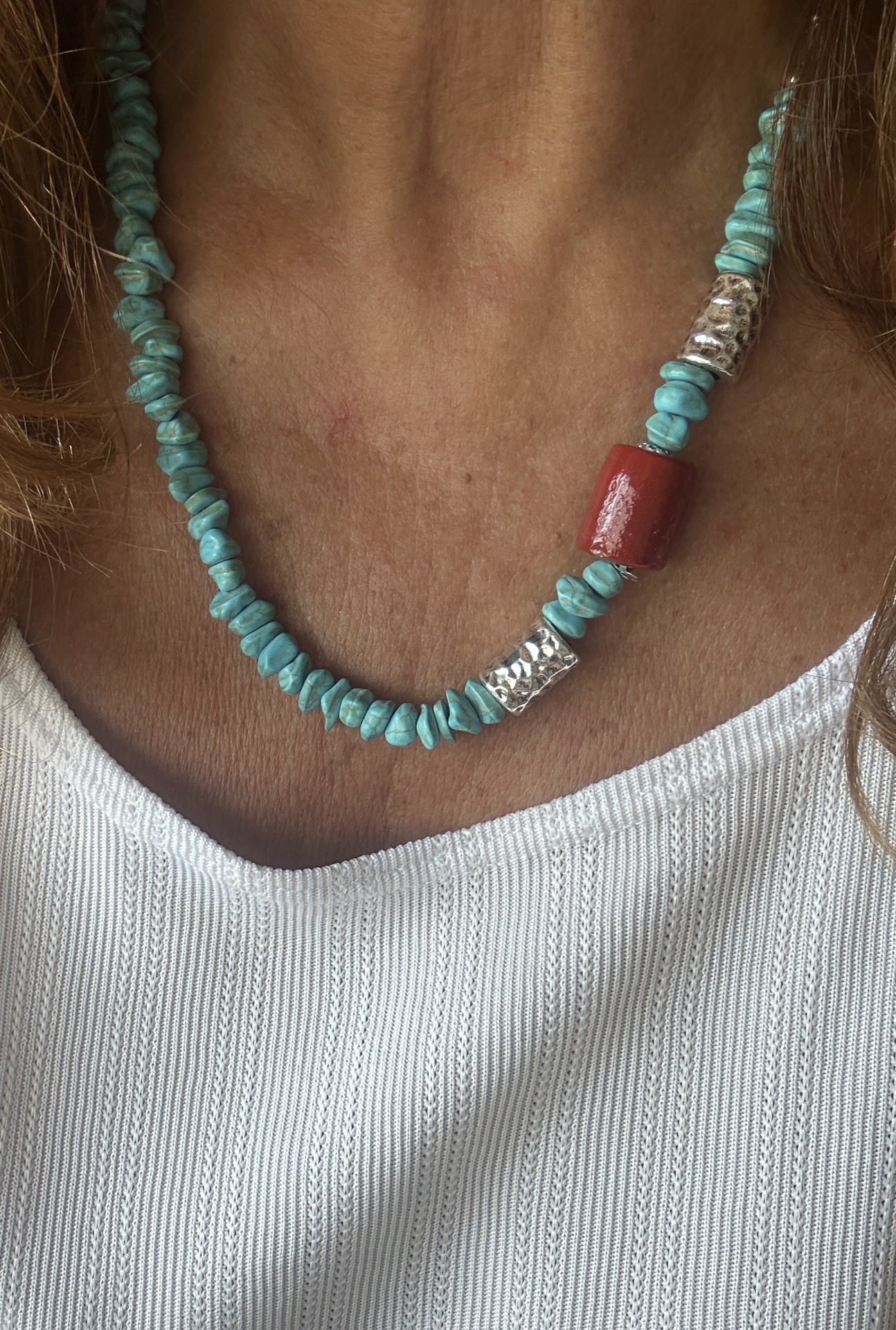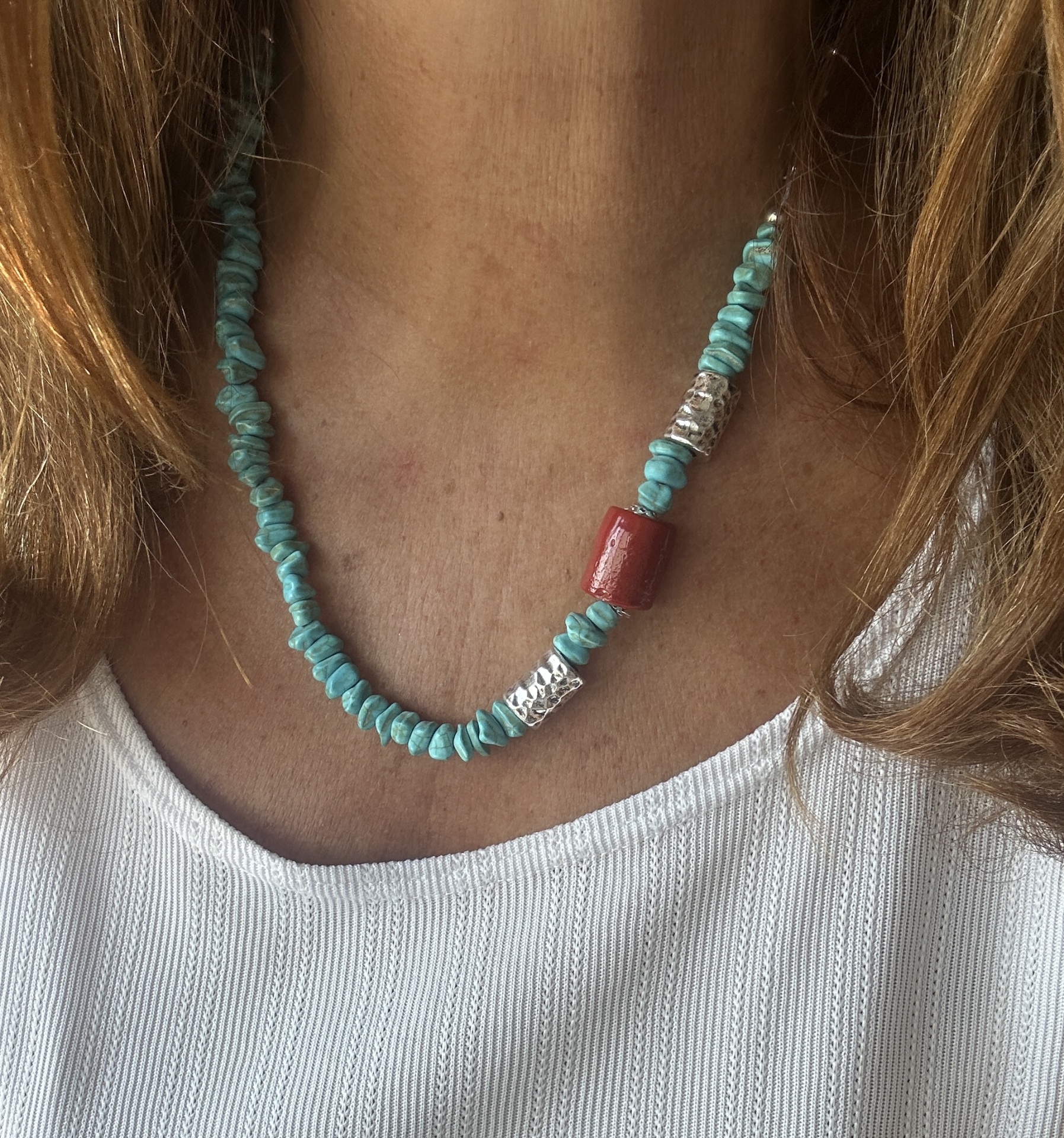 Este colar exclusivo da Rafi Store, apresenta um segmento rico de cascalho de turquesas genuínas, que oferecem uma textura orgânica e um tom azul apelativo. No centro, destaca-se uma conta retangular em tom coral intenso, ladeada por duas contas metálicas prateadas e texturadas, que adicionam um contraste elegante. O do colar de 45 cm e extensor de 5 cm tem uma corrente em aço prateado, garantindo durabilidade e um brilho que perdura. O tamanho total do fio pode ser totalmente personalizado de acordo com a sua preferência; por favor, mencione o tamanho pretendido nas observações no checkout. Possui um fecho seguro e discreto. Poderá verificar-se uma ligeira variação na tonalidade das cores das pedras devido à sua natureza e à iluminação da fotografia.
