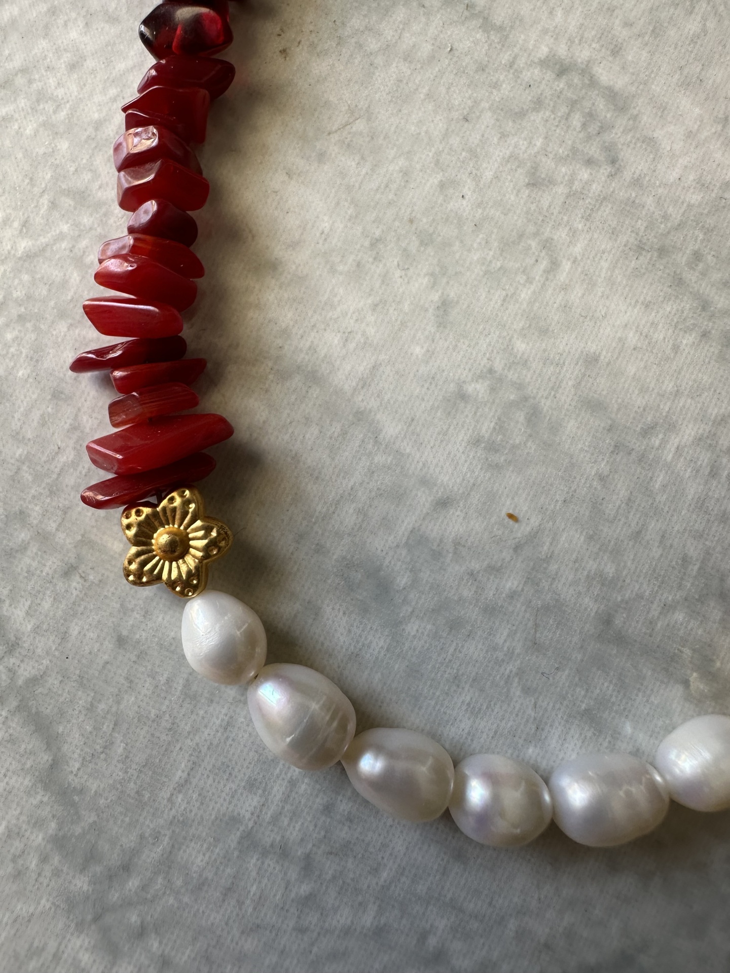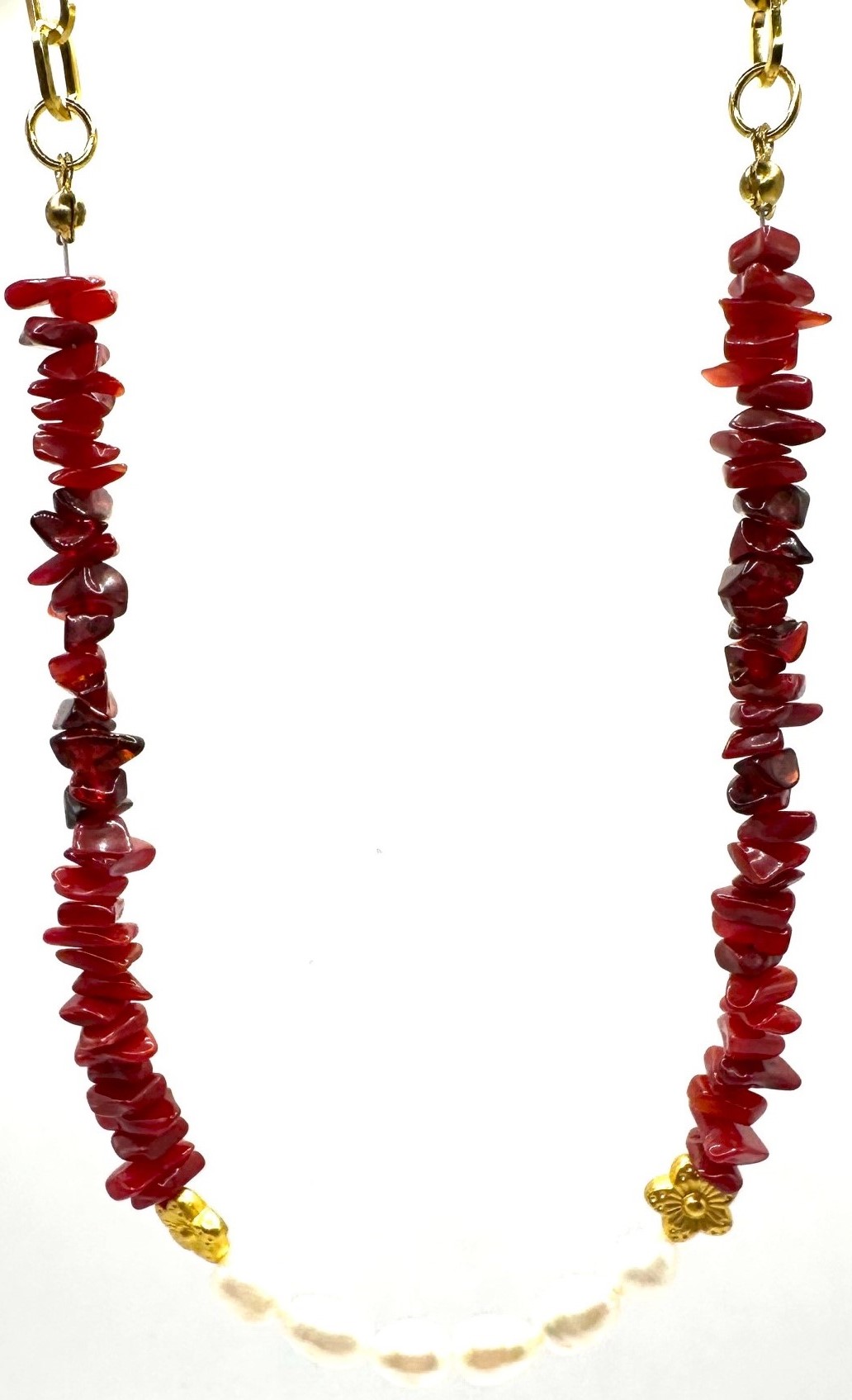 Surpreenda com Elegância: O colar que transforma o seu visual mais simples em algo surpreendente. Combina pérolas naturais e cascalho de raíz de coral, esta peça é um verdadeiro destaque em qualquer ocasião.Mais um exclusivo Rafi Store.