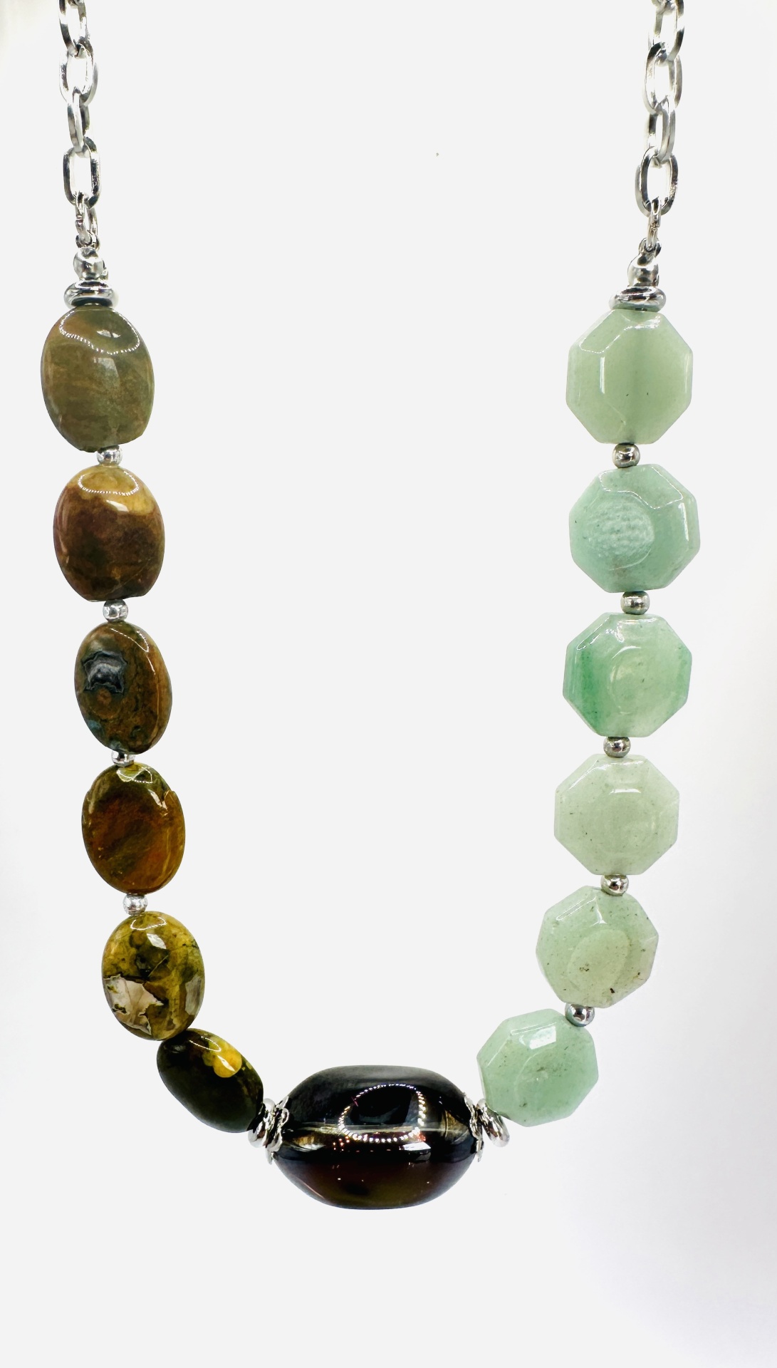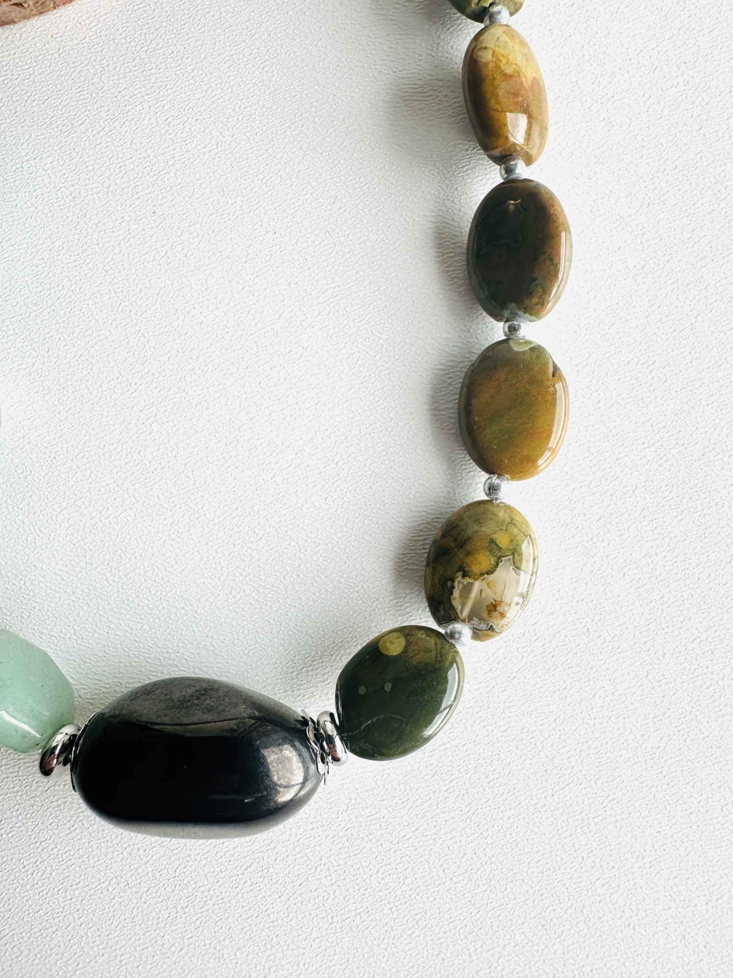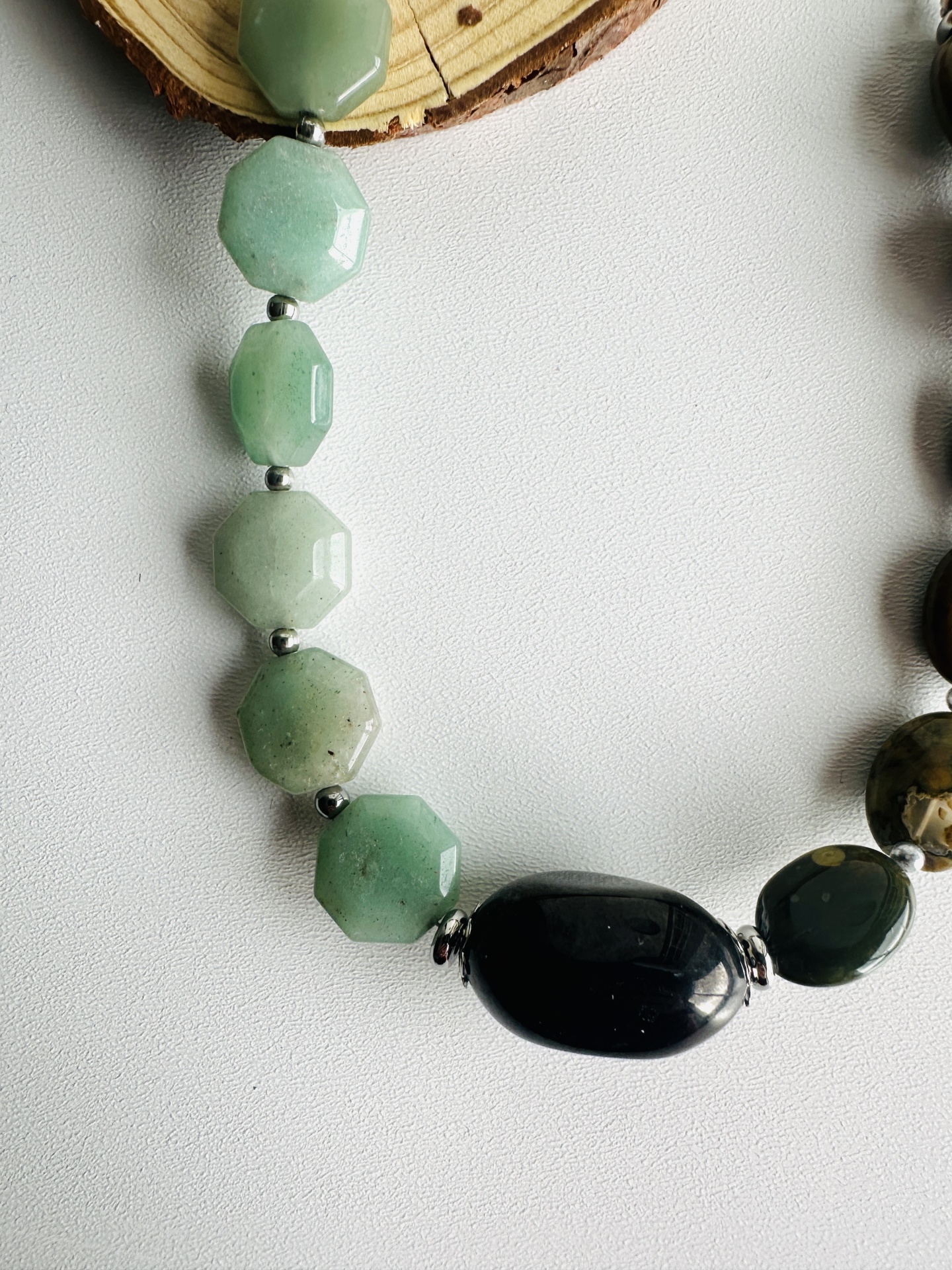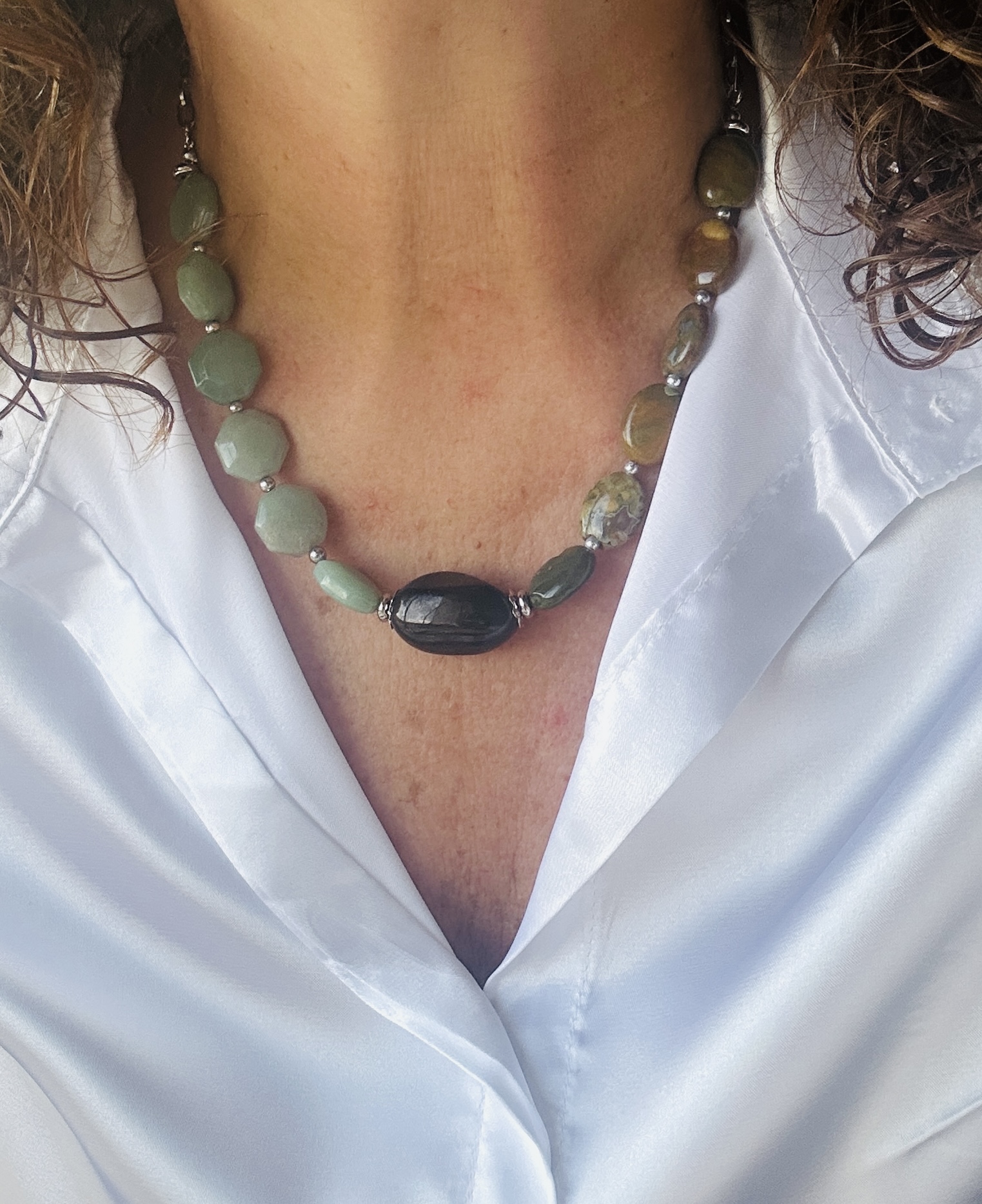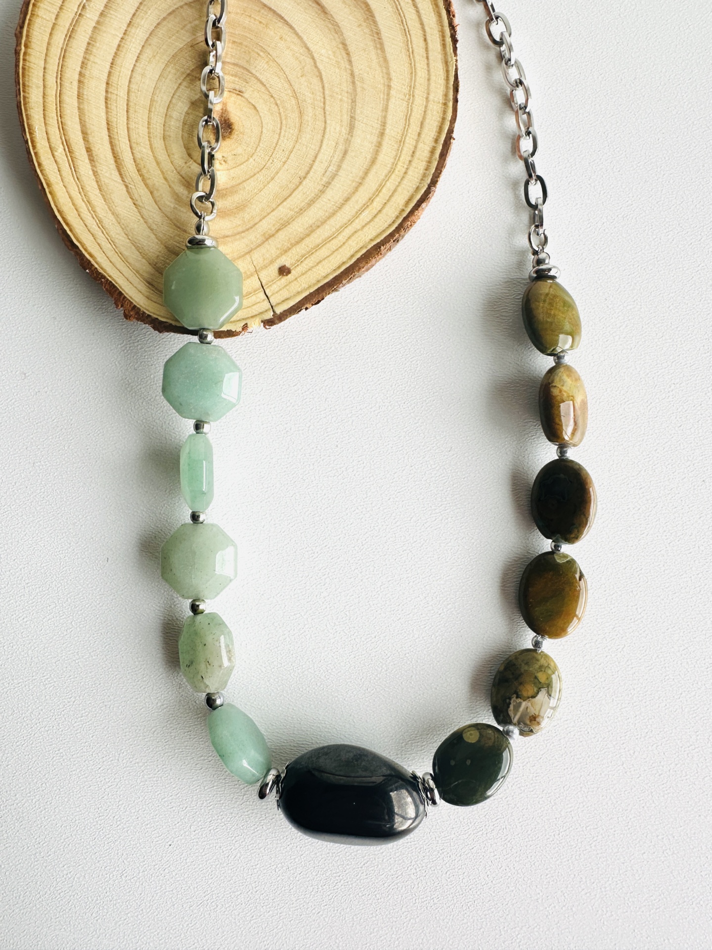 Uma peça que alia a força da natureza à sofisticação do design exclusivo da Rafi. Este colar curto, com 40 cm de comprimento + extensor de 5 cm, é uma verdadeira obra de arte criada com pedras naturais cuidadosamente selecionadas. A harmonia entre os tons verdes, castanhos e pretos faz desta joia um acessório versátil e poderoso, ideal para complementar visuais em todas as estações.