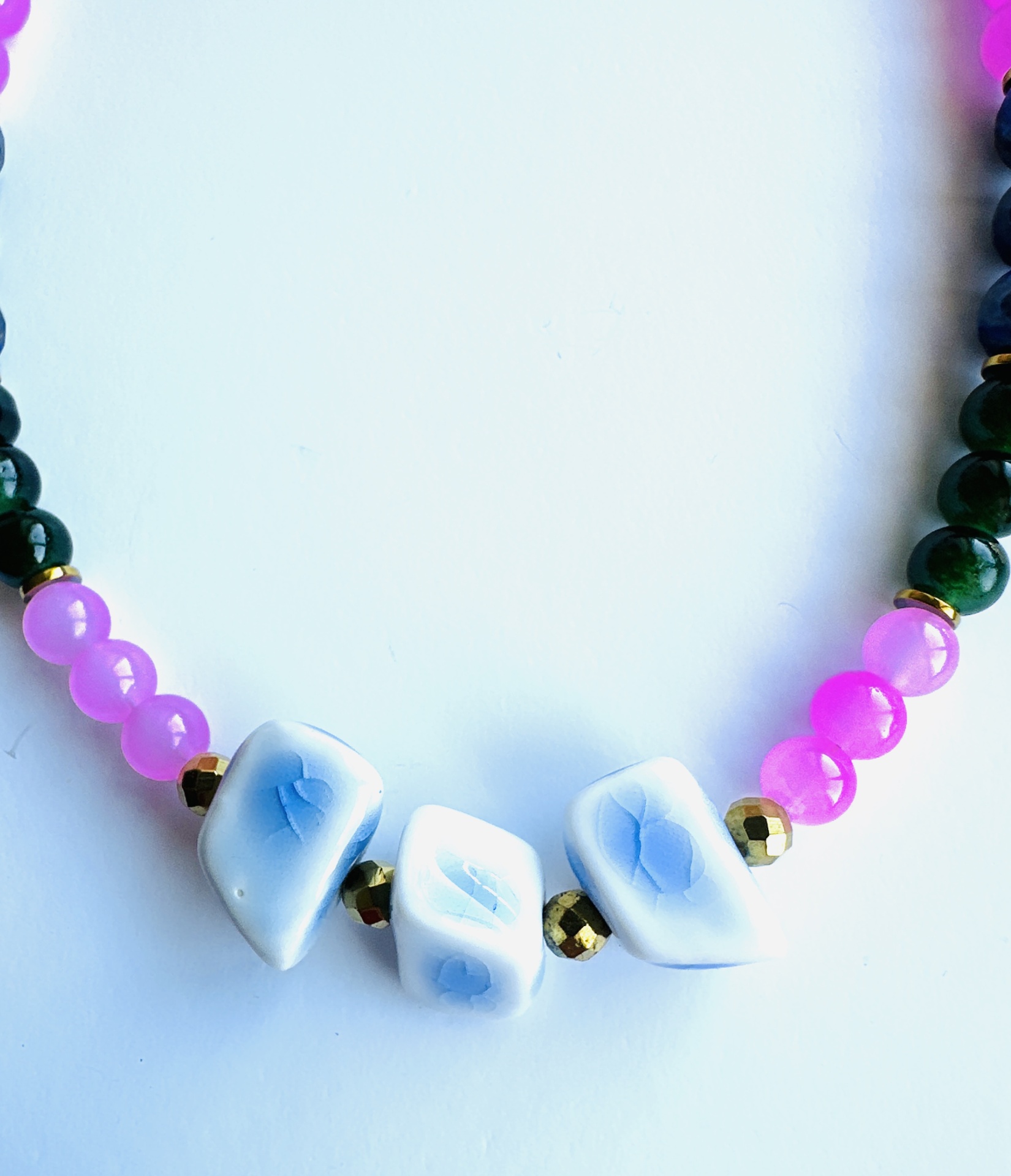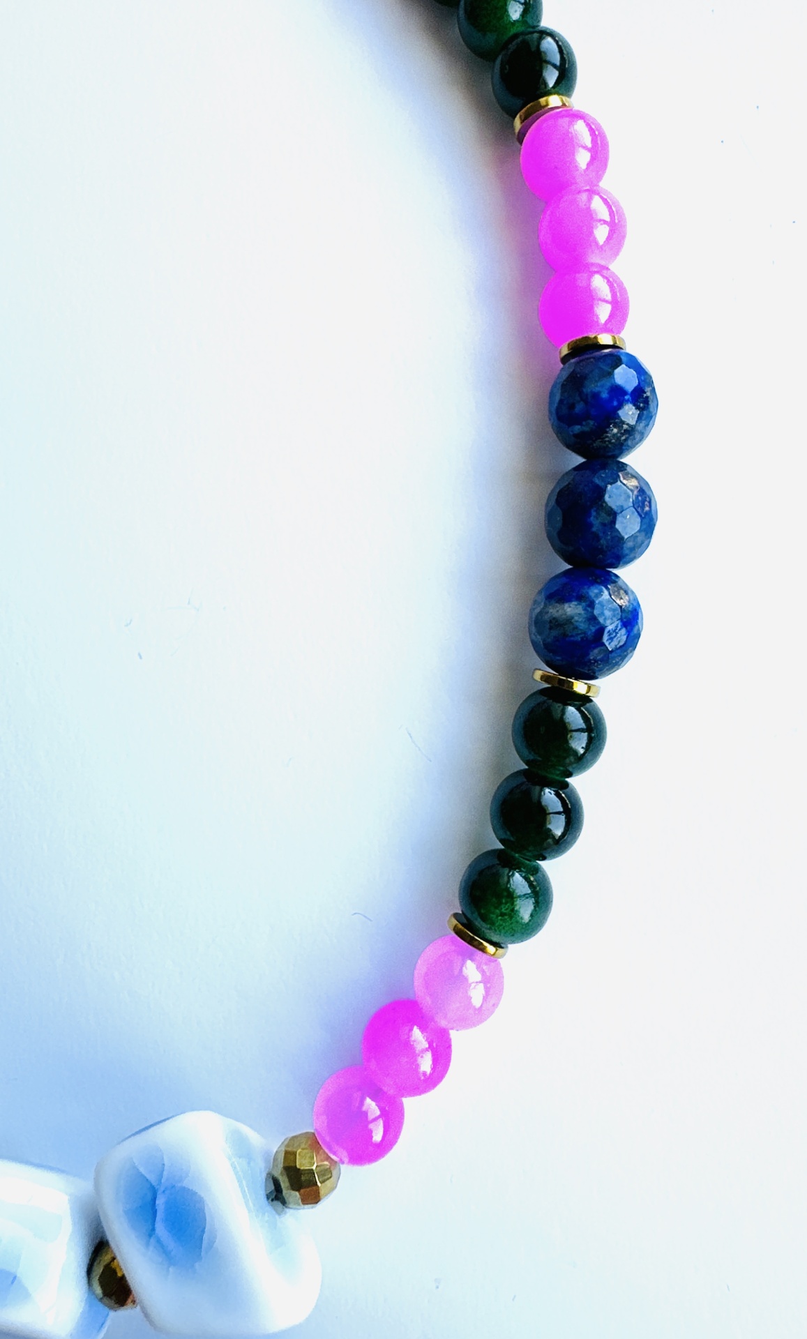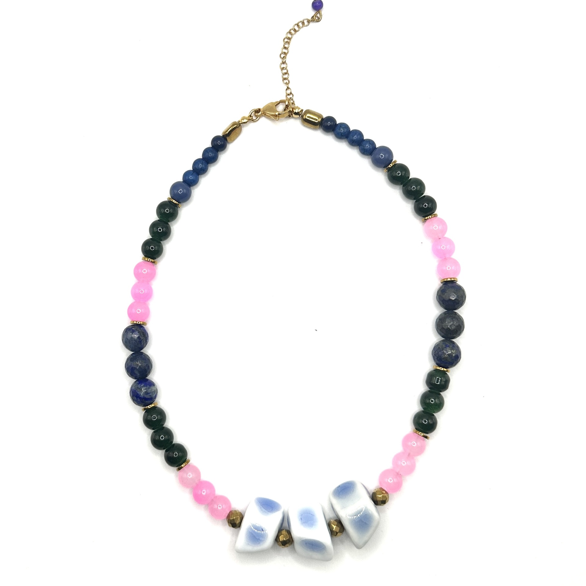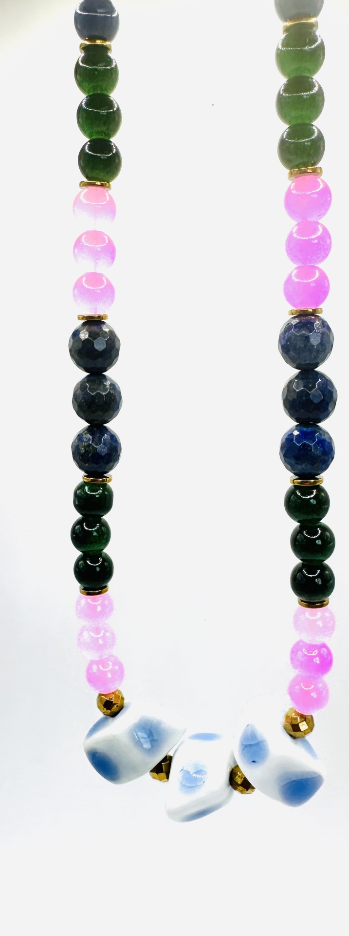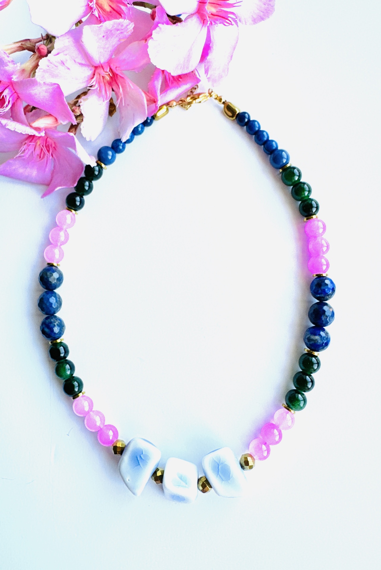Materiais Puros e Cores com Alma: Este colar é uma obra de arte meticulosamente criada, combinando pedras naturais de Jade Verde, Quartzo Rosa e Lápis-Lazúli, intercaladas com delicadas contas douradas. Cada pedra foi escolhida pela sua beleza intrínseca e pelas suas propriedades energéticas. O Jade Verde simboliza serenidade e harmonia, o Quartzo Rosa representa o amor incondicional e a compaixão, e o Lápis-Lazúli evoca sabedoria e verdade interior. Na parte central, três pedras azuis e brancas, com formato orgânico e nuances suaves, funcionam como um ponto focal hipnotizante, adicionando um toque de originalidade e fluidez.
