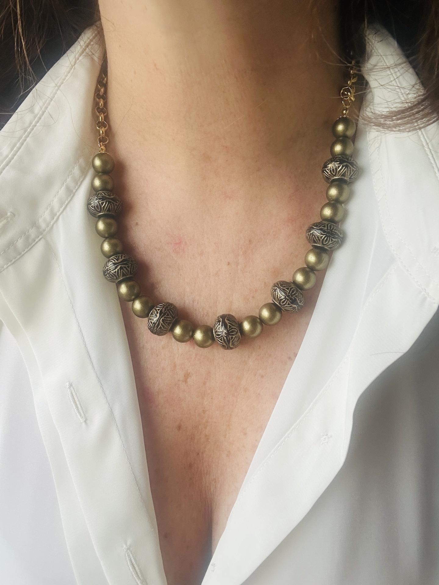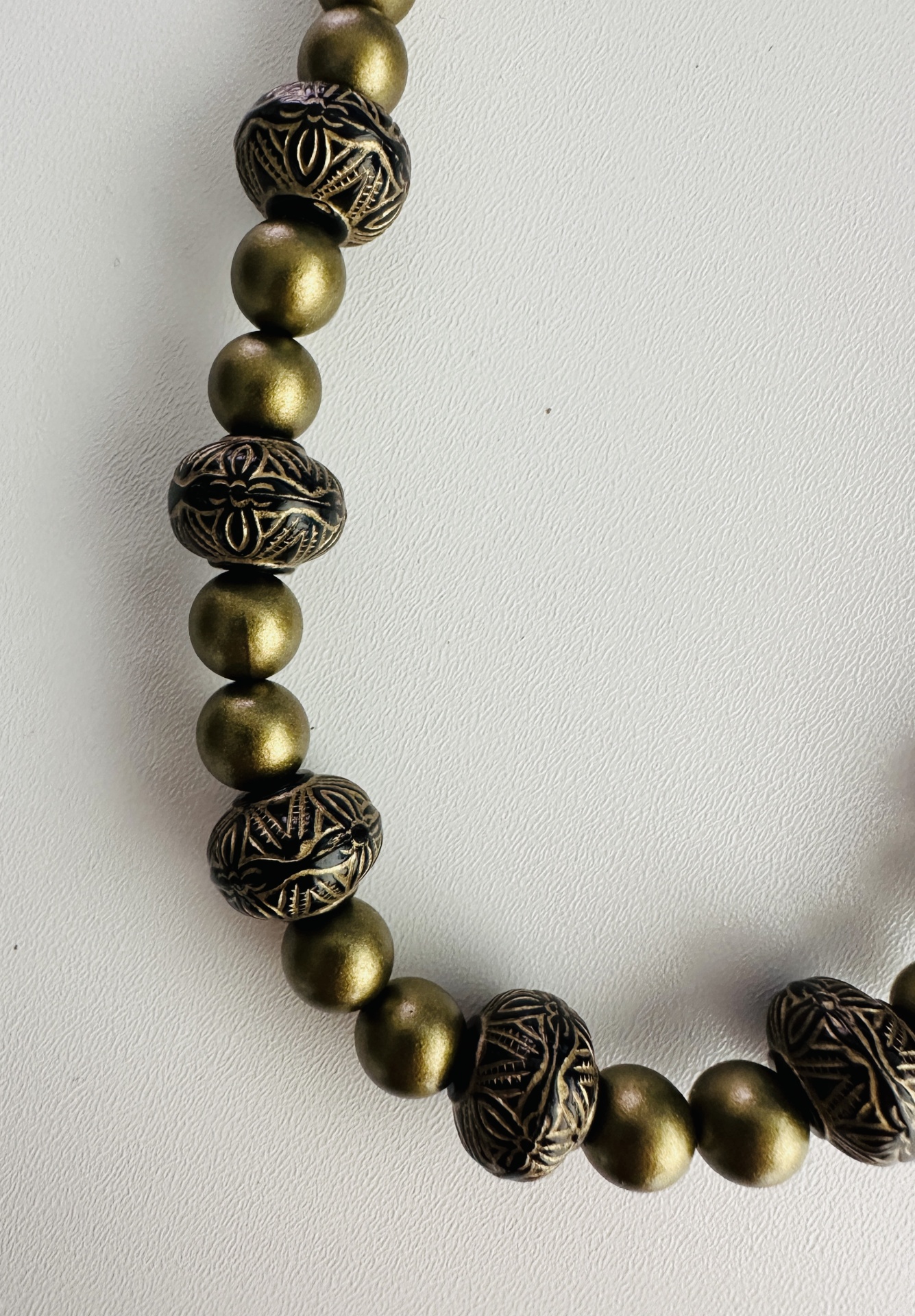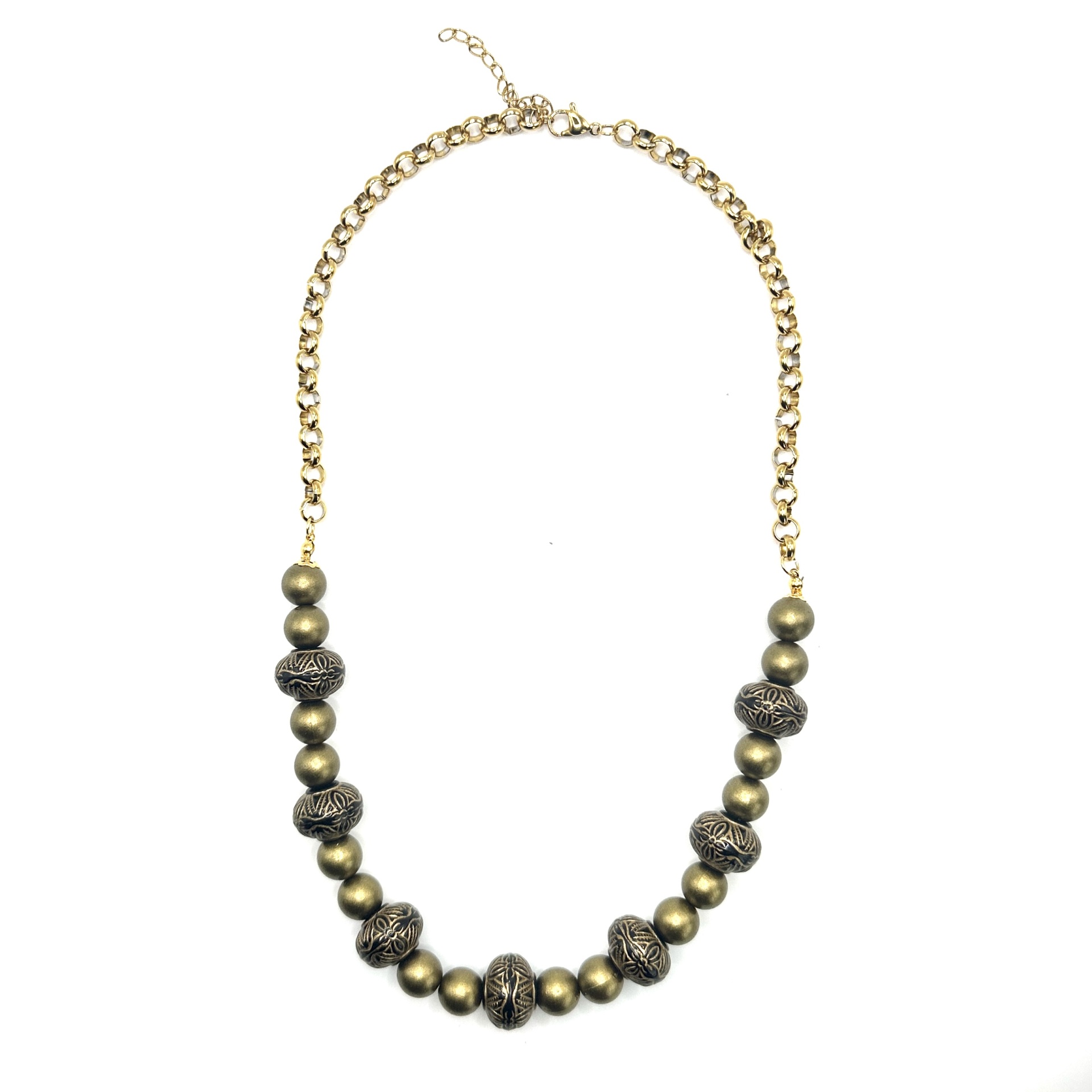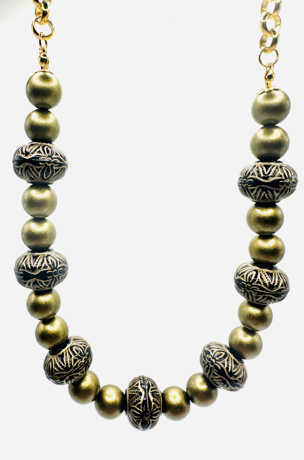 Material: Contas metálicas douradas envelhecidas e esferas esculpidas com acabamento preto e dourado.