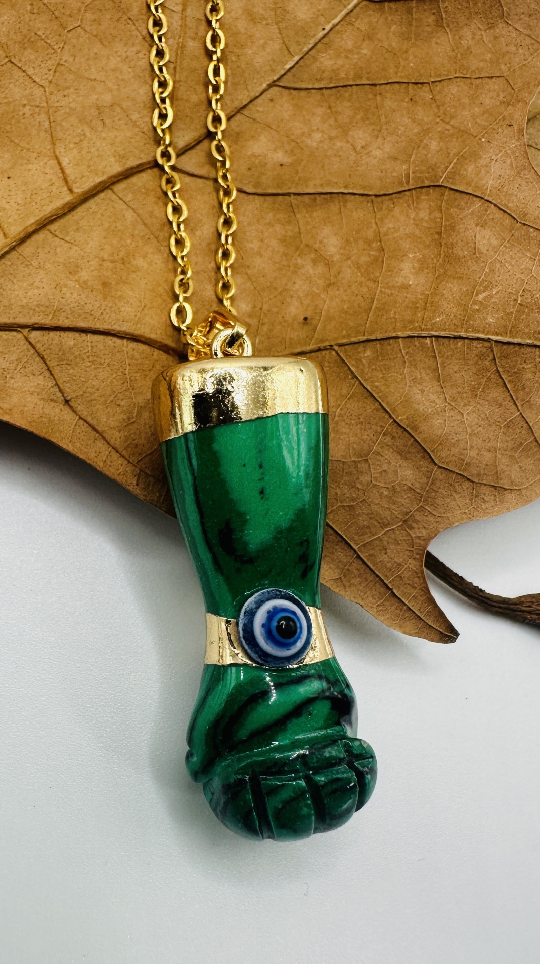 Pingente de resina marmorizada verde, com acabamento dourado e detalhe de olho grego esmaltado, feito com precisão e cuidado.
