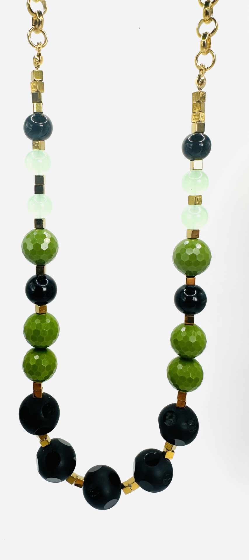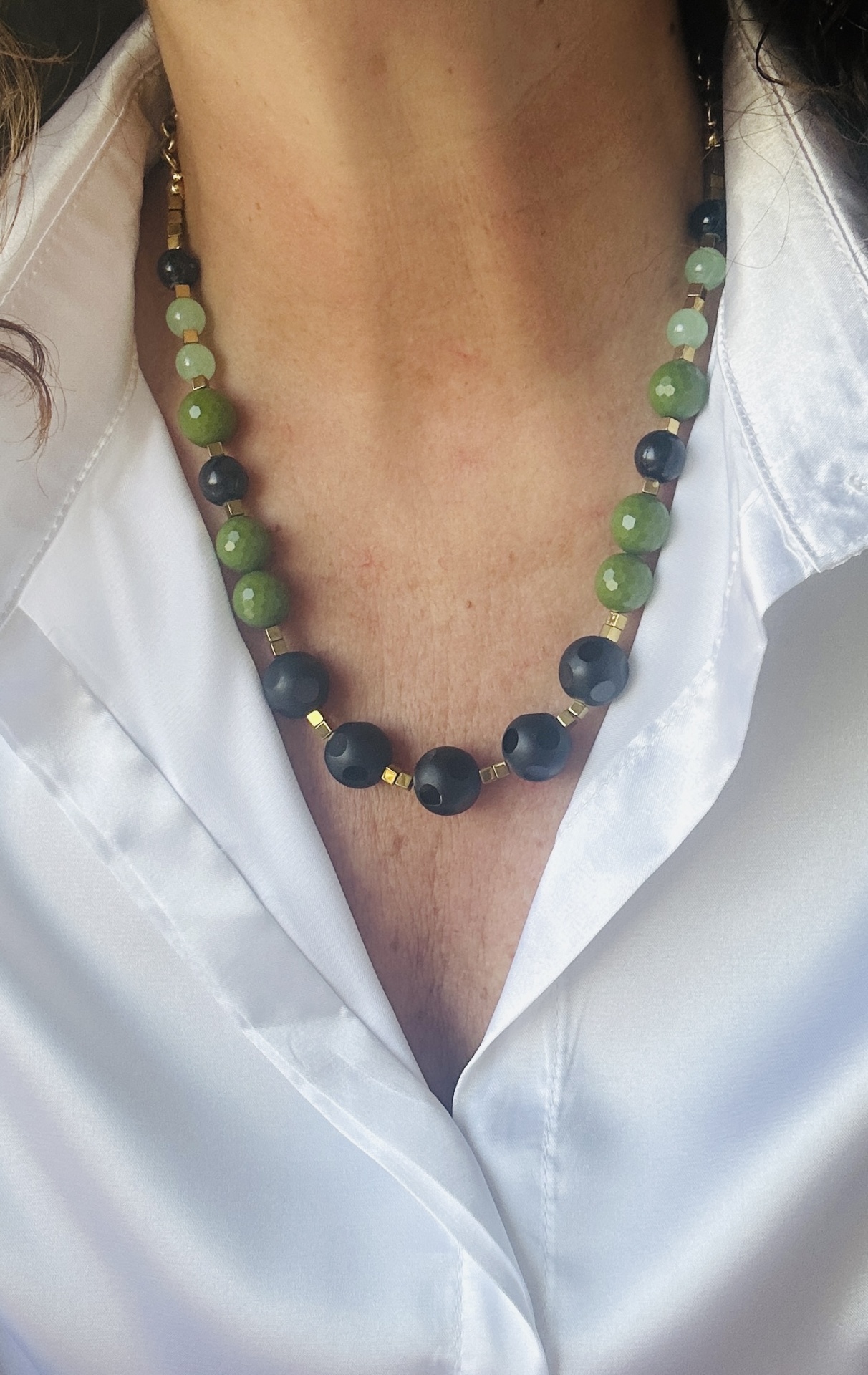Colar de pedras naturais verde, preto e dourado
