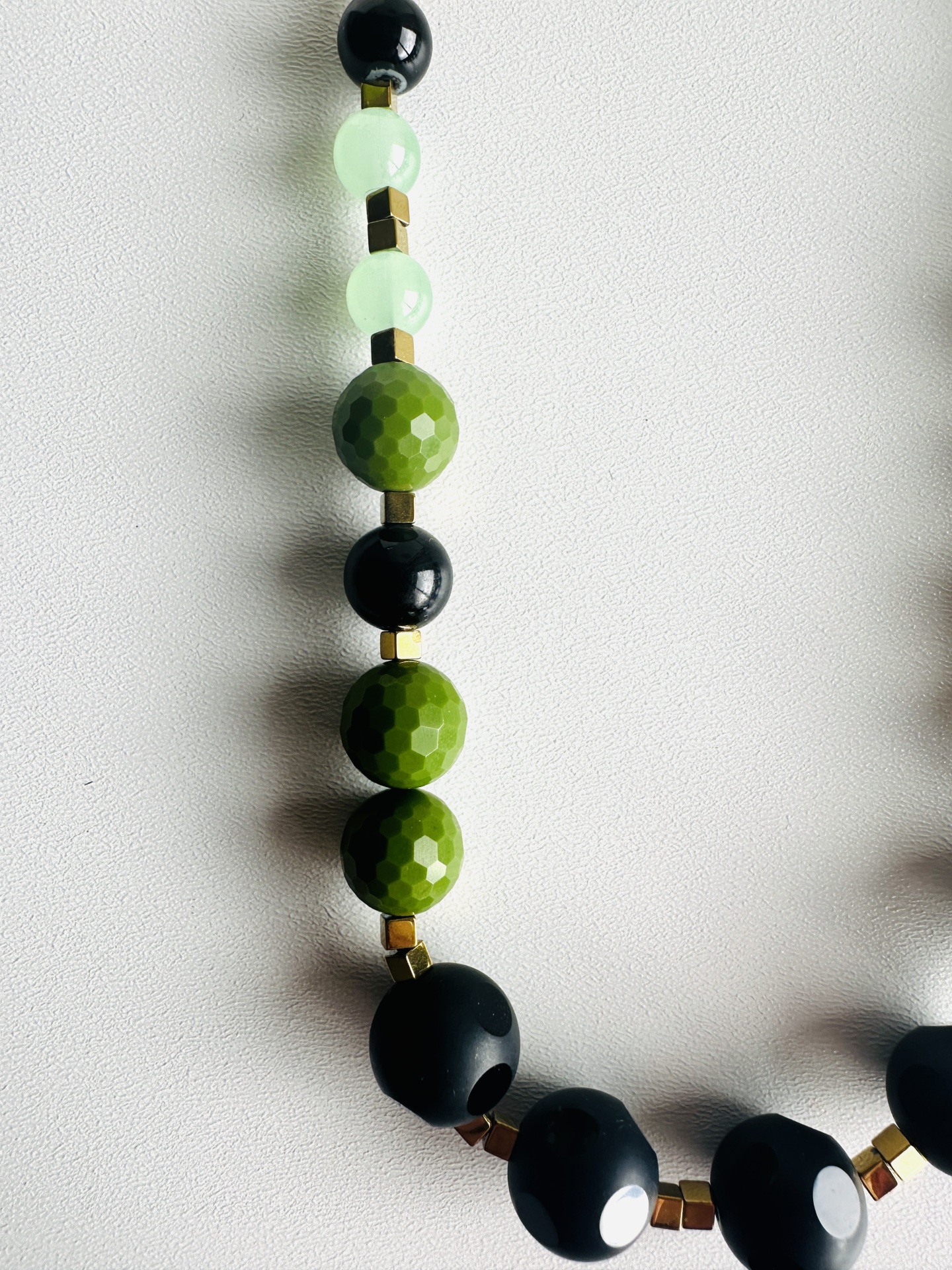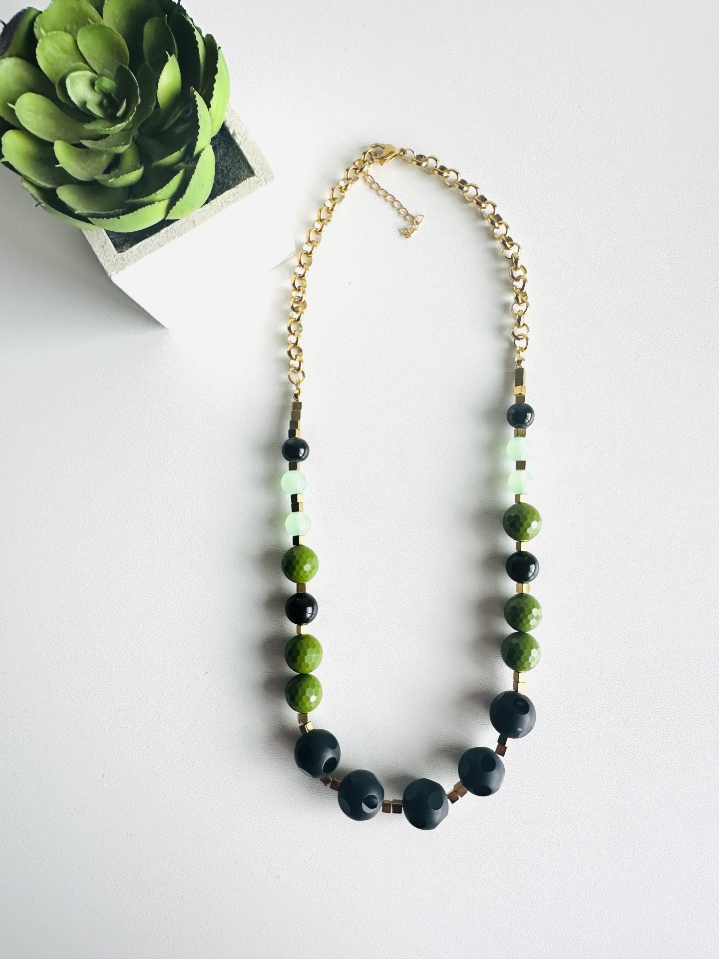 Este colar de design exclusivo da Rafi Store, é um verdadeiro ícone de elegância contemporânea, com um toque arrojado e sofisticado. Com 44 cm de comprimento + extensor de 5 cm, esta peça é feita à mão com pedras naturais facetadas em tons de verde lima, verde claro translúcido e preto, intercaladas com delicadas contas geométricas douradas, que acrescentam um brilho subtil e requintado ao visual.