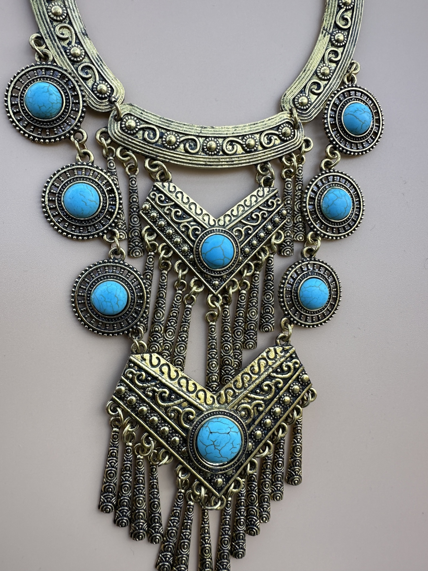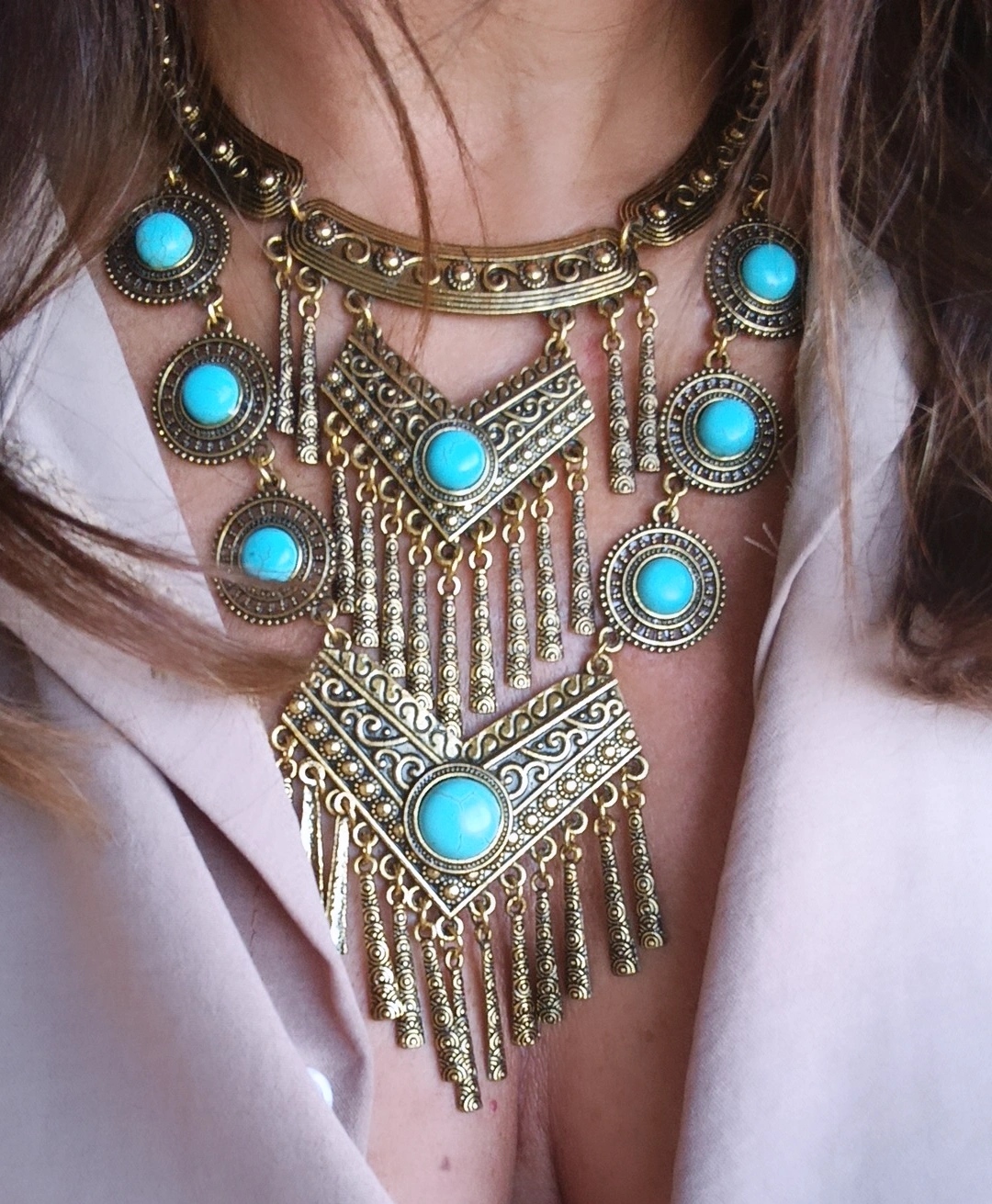Estilo Boho Chic: Com a sua combinação de tons dourados e turquesas vibrantes, este colar incorpora perfeitamente a estética descontraída e artística do estilo boho, adiciona um toque de exotismo e mistério ao seu visual.