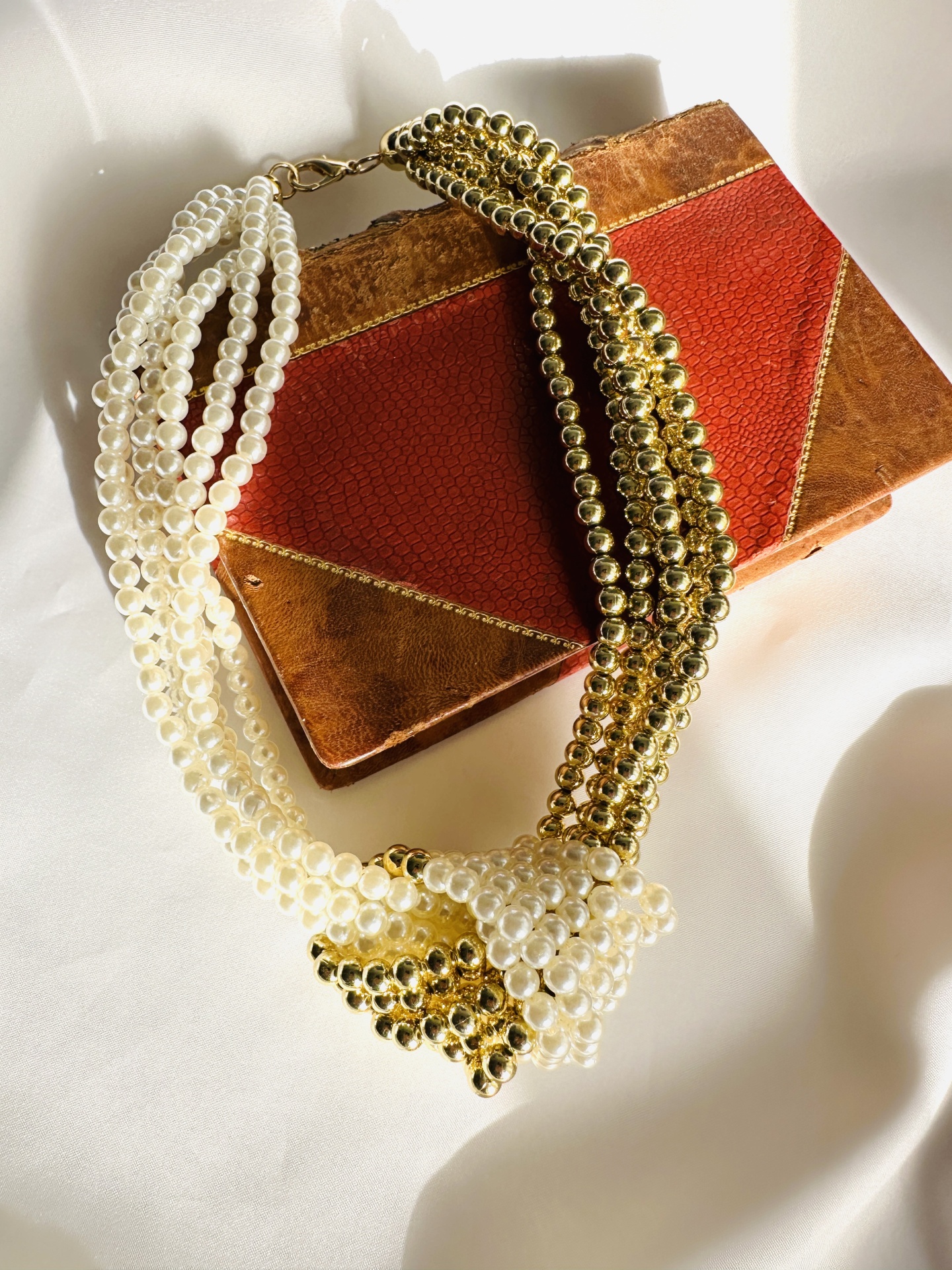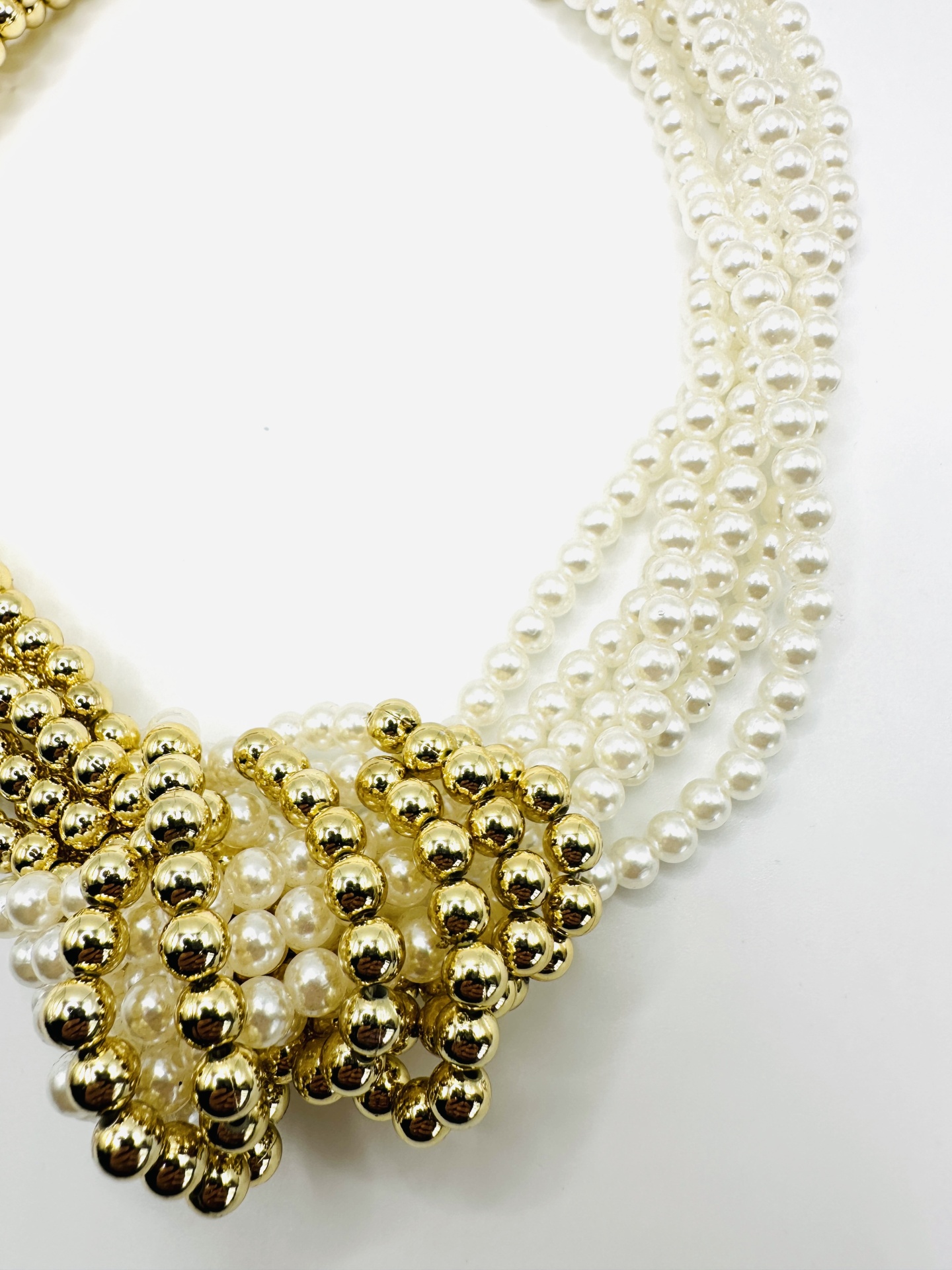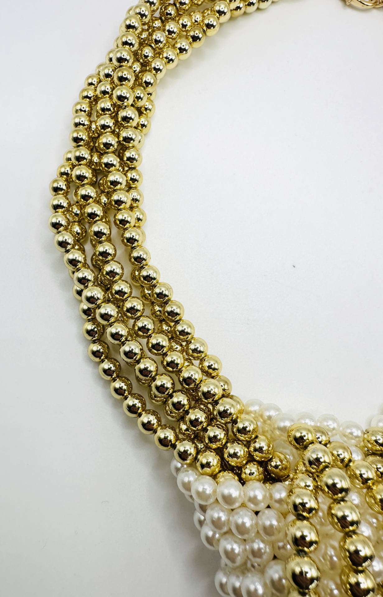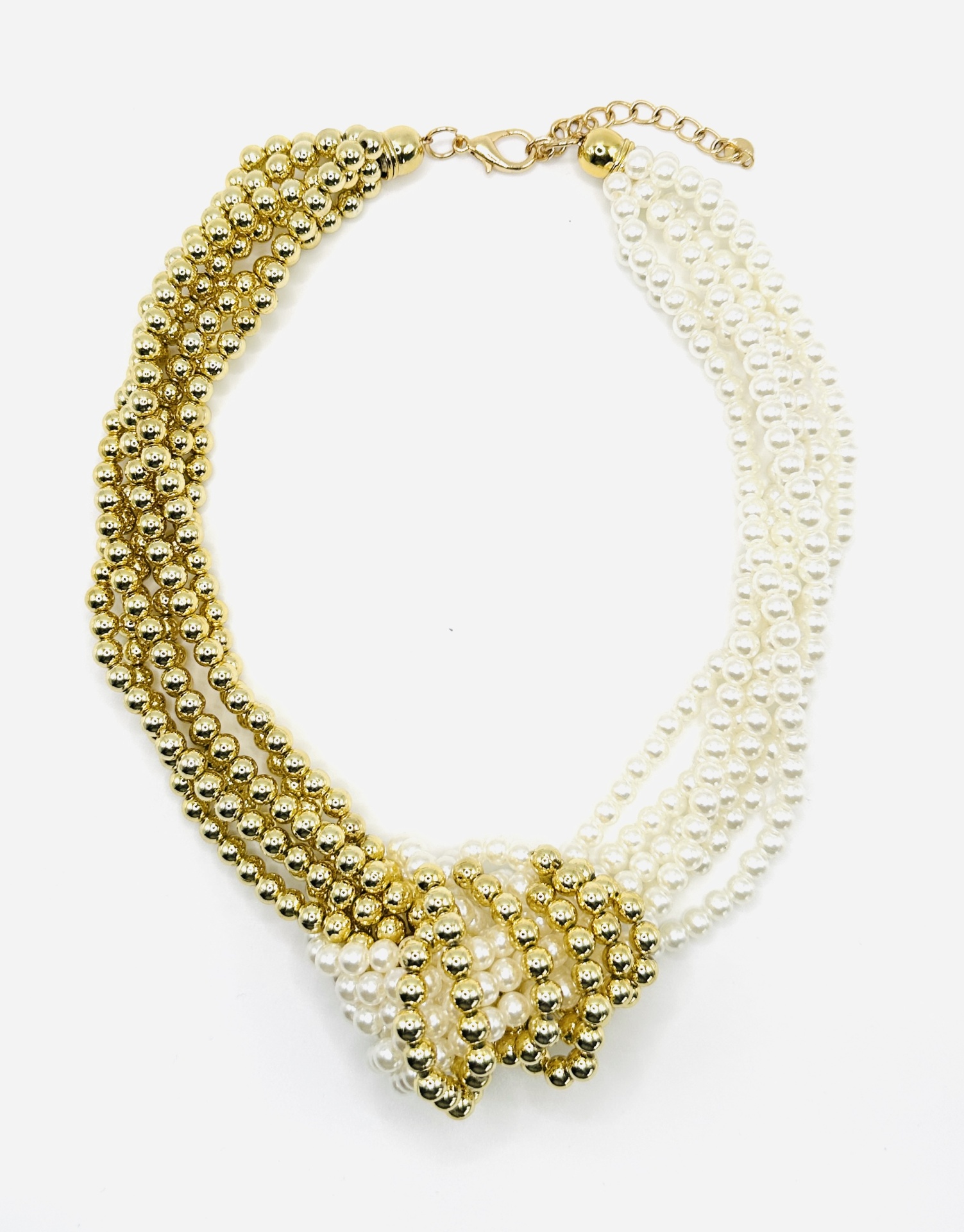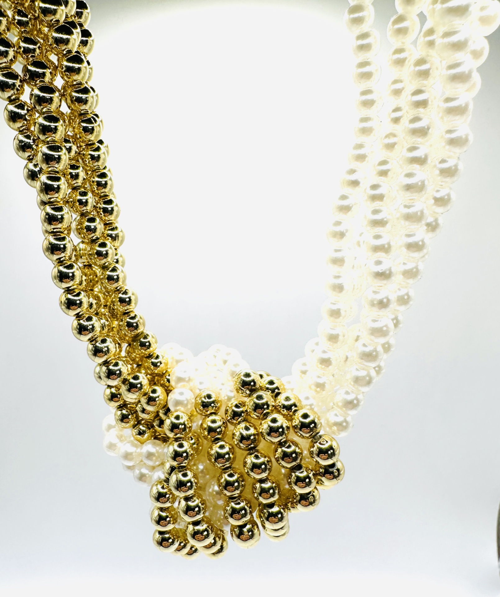 Surpreenda-se com a elegância intemporal deste magnífico colar de pérolas brancas e douradas entrelaçadas. Um verdadeiro clássico moderno, este colar é ideal para mulheres que desejam adicionar sofisticação e exclusividade a qualquer visual. O seu design entrelaçado confere volume e charme, enquanto a combinação de cores cria um contraste impecável.