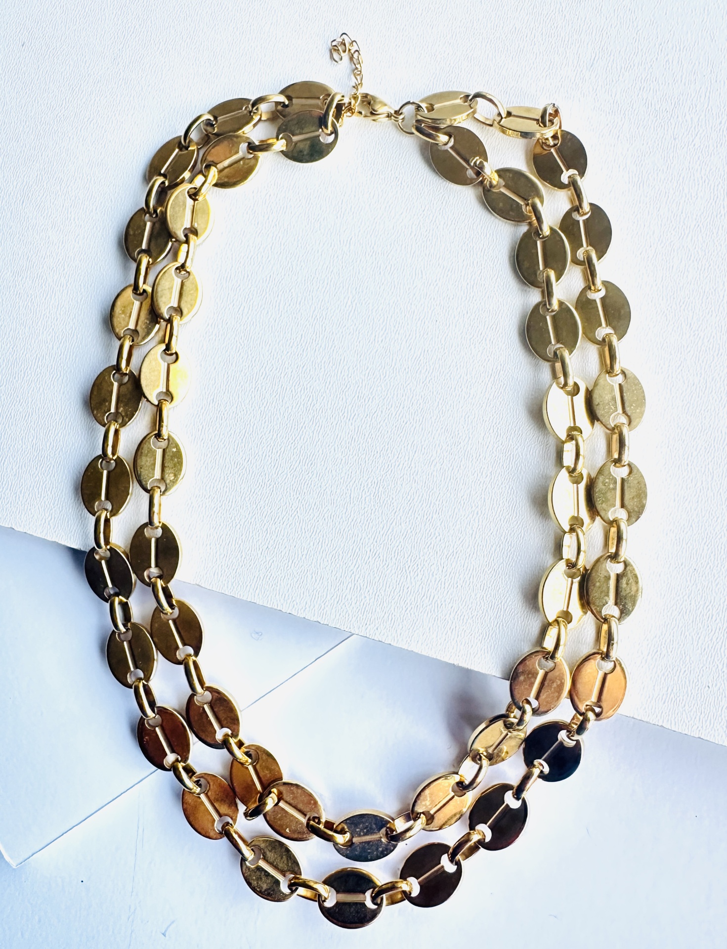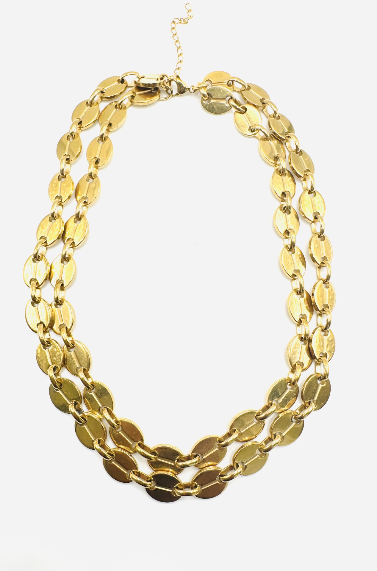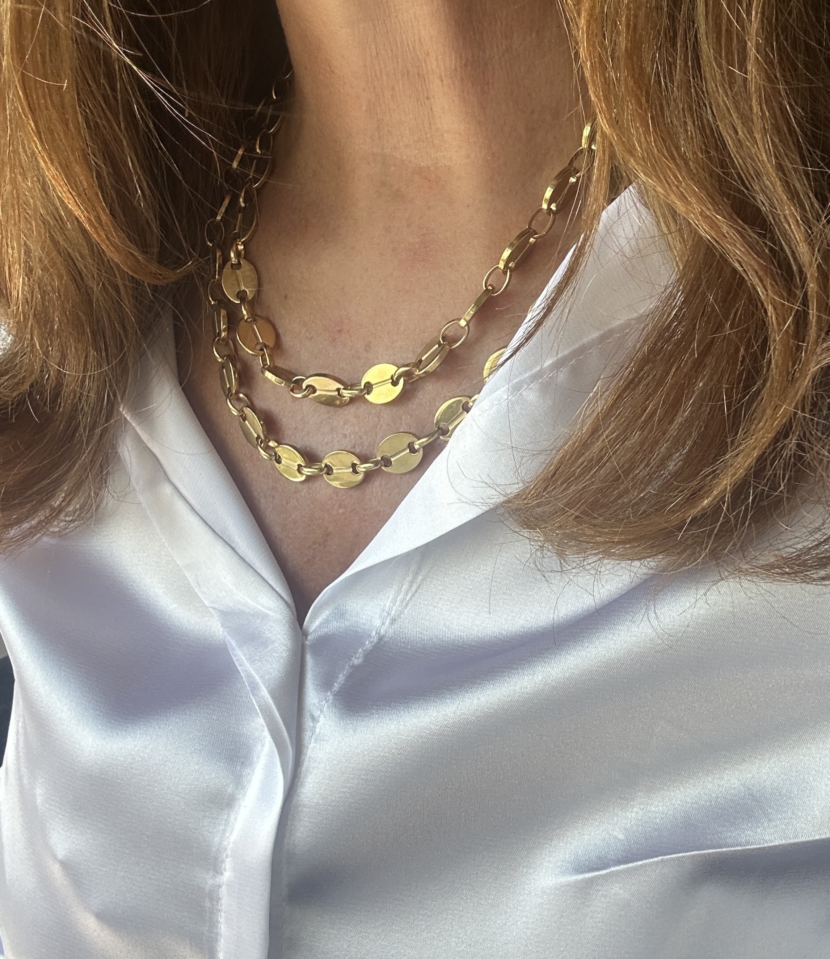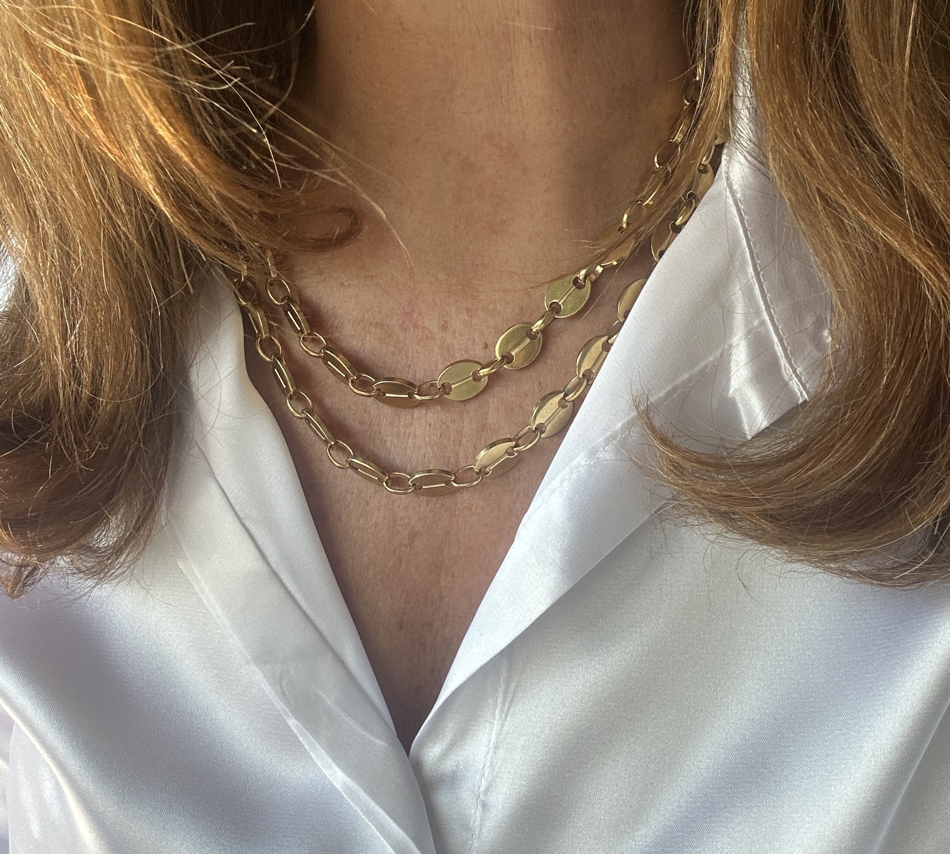 Este colar exclusivo apresenta um design de duas camadas, compostas por elos planos e ovais que se interligam de forma elegante, criando um efeito de cascata sublime. É confecionado em aço de alta qualidade com acabamento dourado, garantindo durabilidade e um brilho que perdura. O primeiro fio mede aproximadamente 40 cm e o segundo aproximadamente 45 cm, criando um efeito de camadas perfeito. O tamanho pode ser totalmente personalizado de acordo com a sua preferência; por favor, mencione o tamanho pretendido nas observações no checkout. Possui um fecho seguro e discreto. Poderá verificar-se uma ligeira variação na tonalidade do dourado devido à iluminação da fotografia.