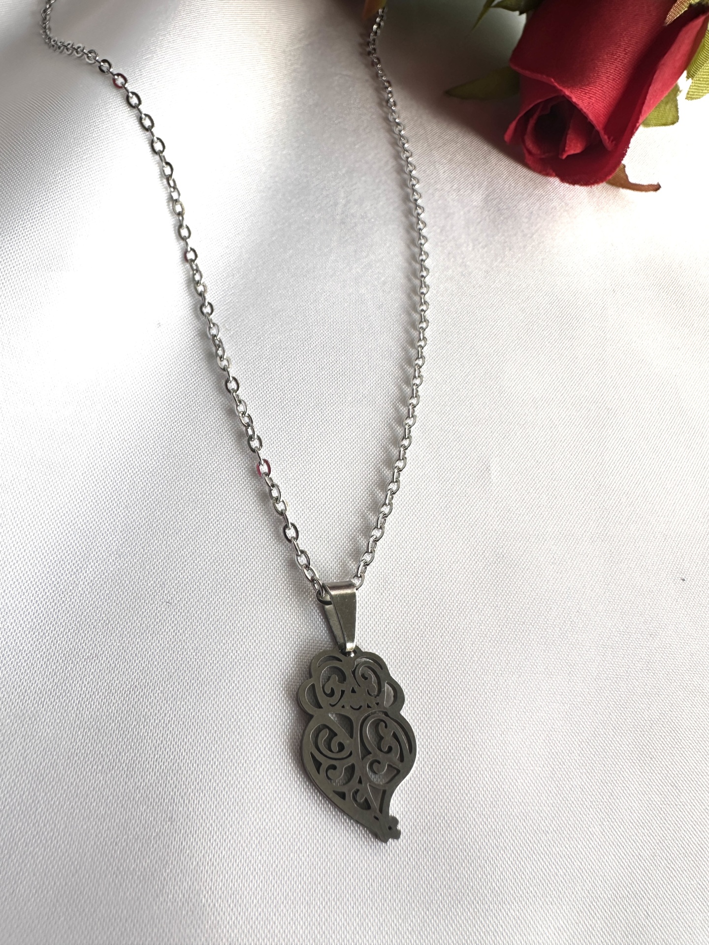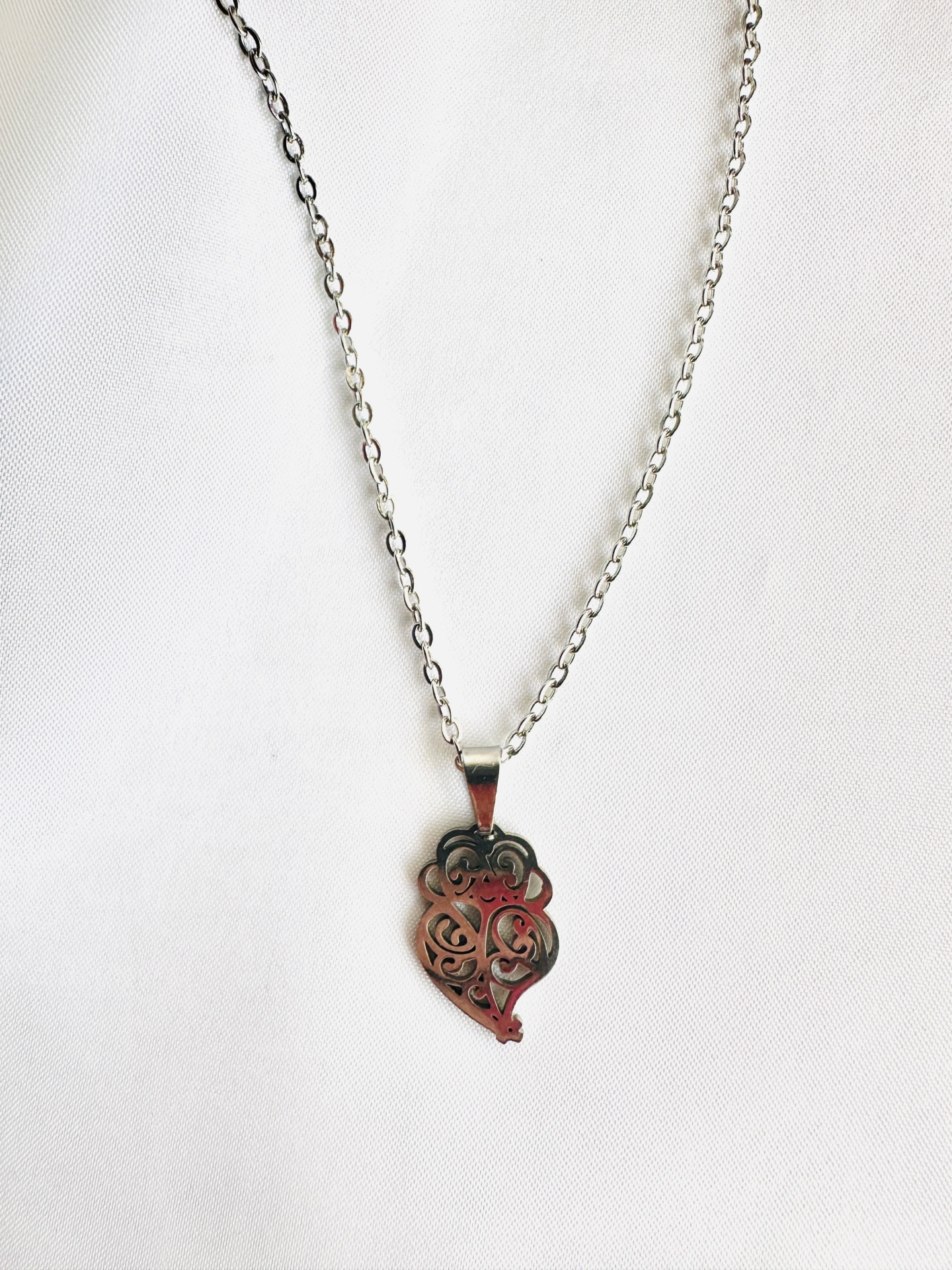 Estilo diário: Use este colar sobre uma camisola de tons neutros para que o padrão vazado do coração ganhe destaque visual.
