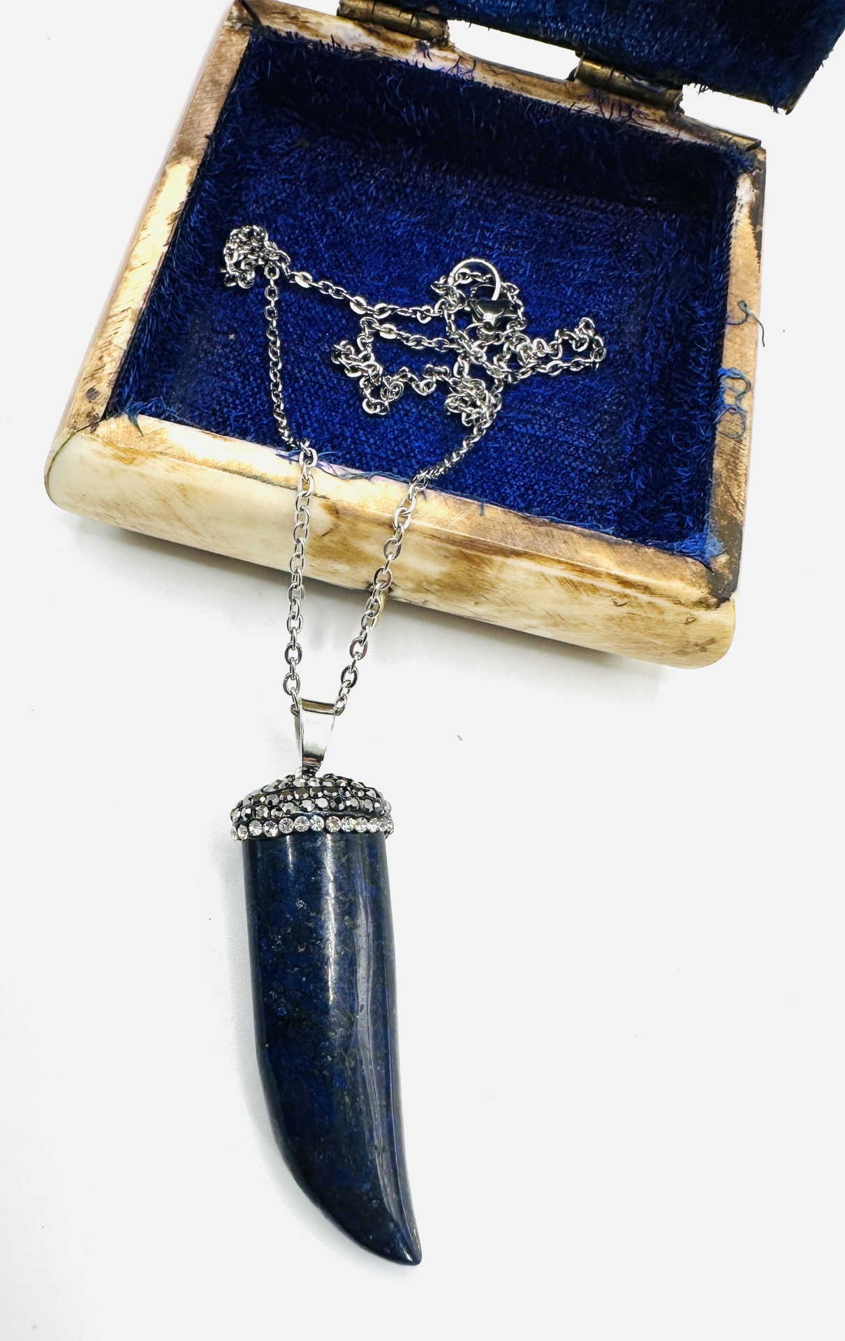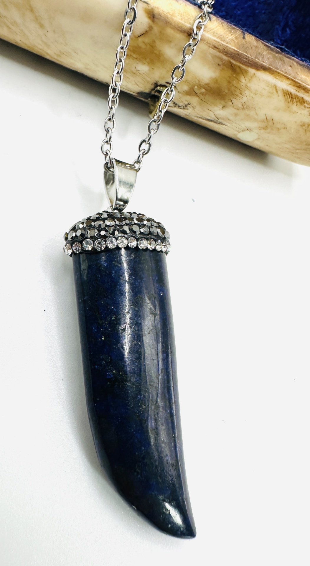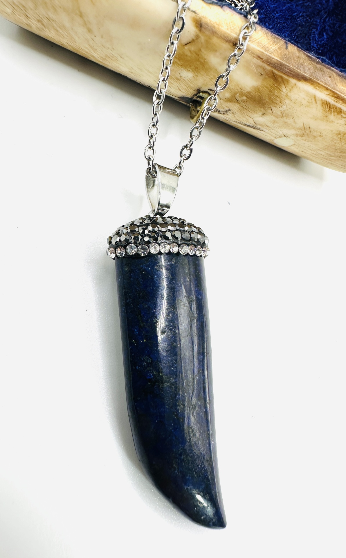 Pendente com acabamento em strass e pedra natural azul, garante brilho e exclusividade.