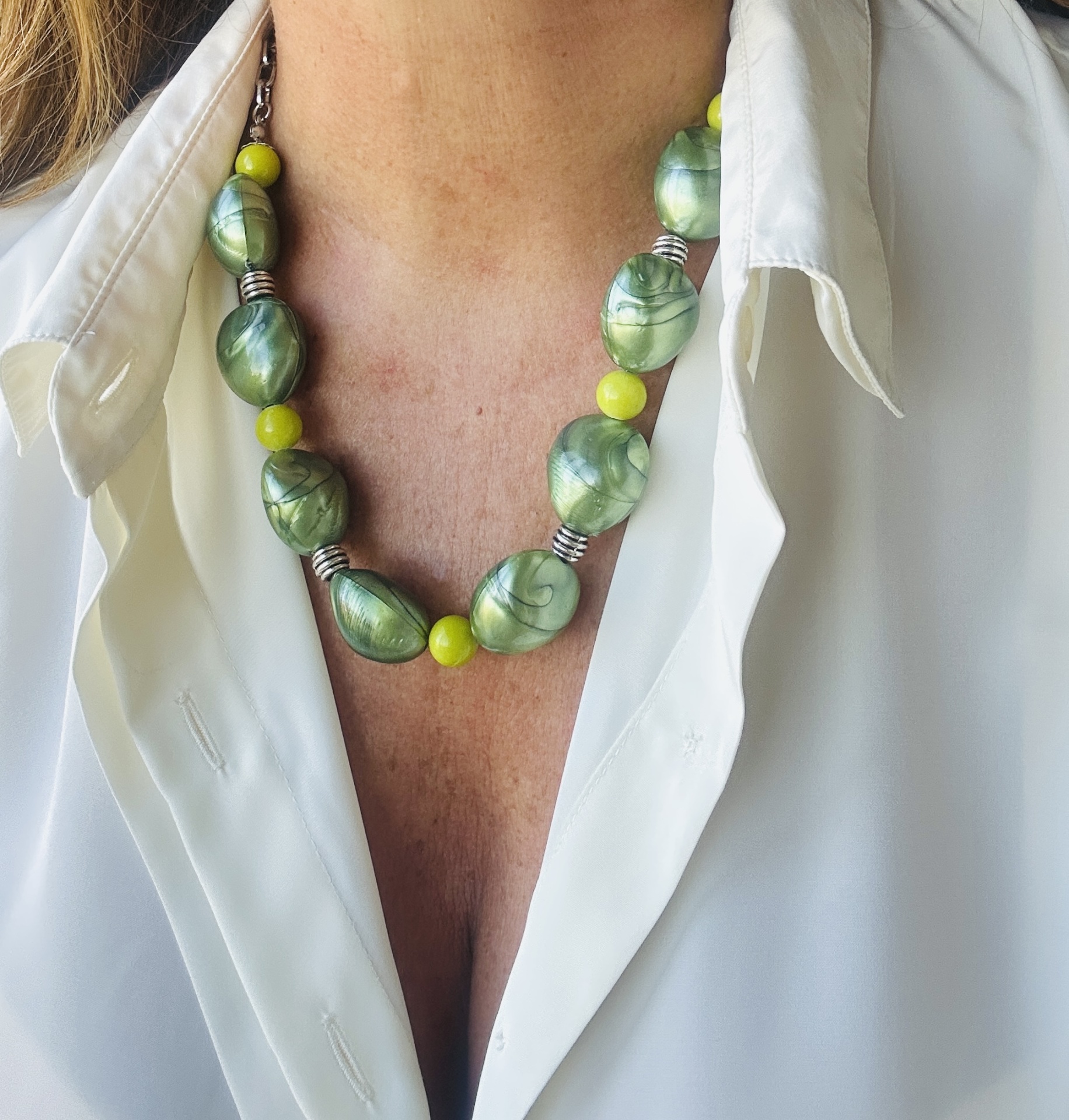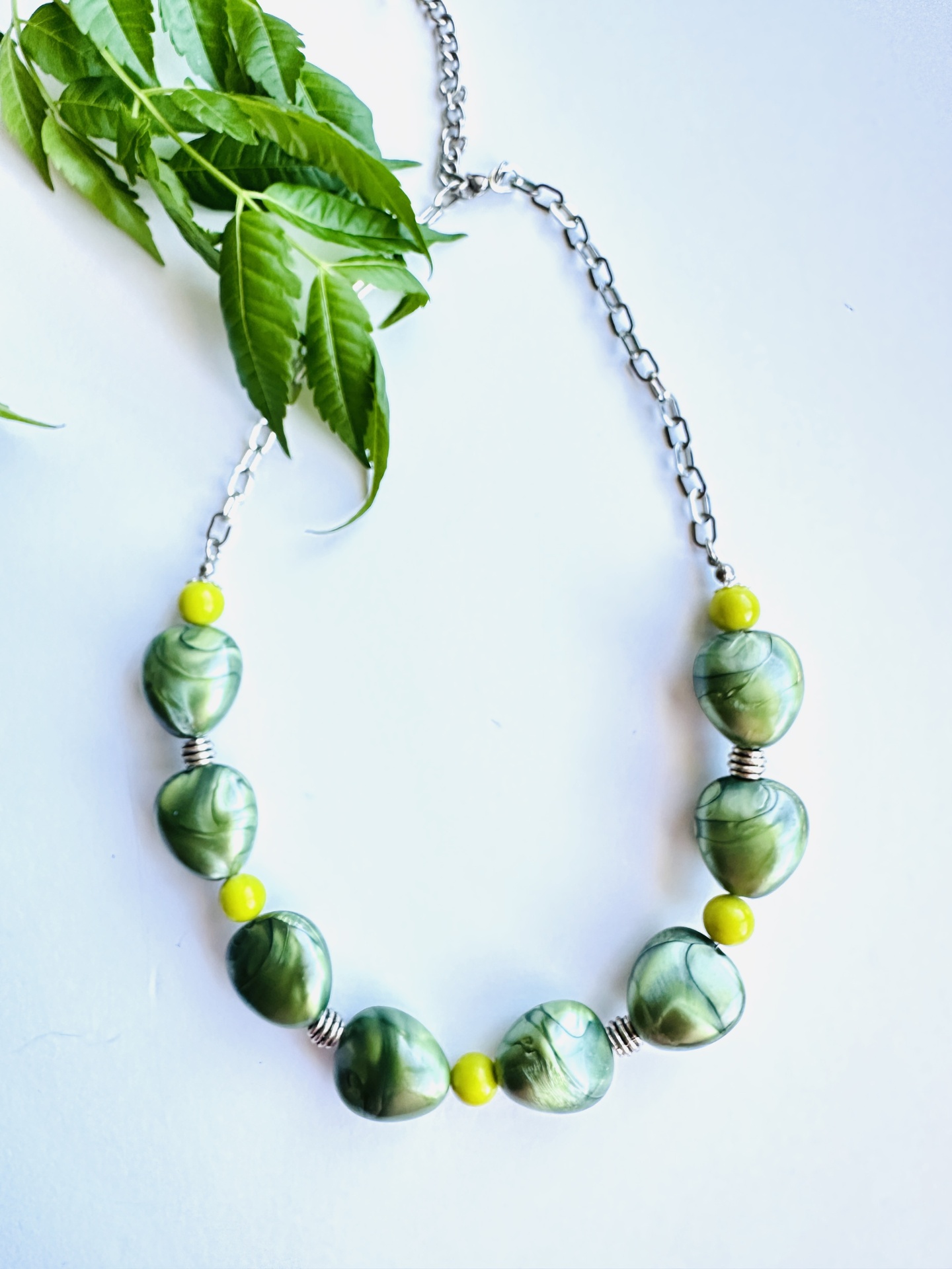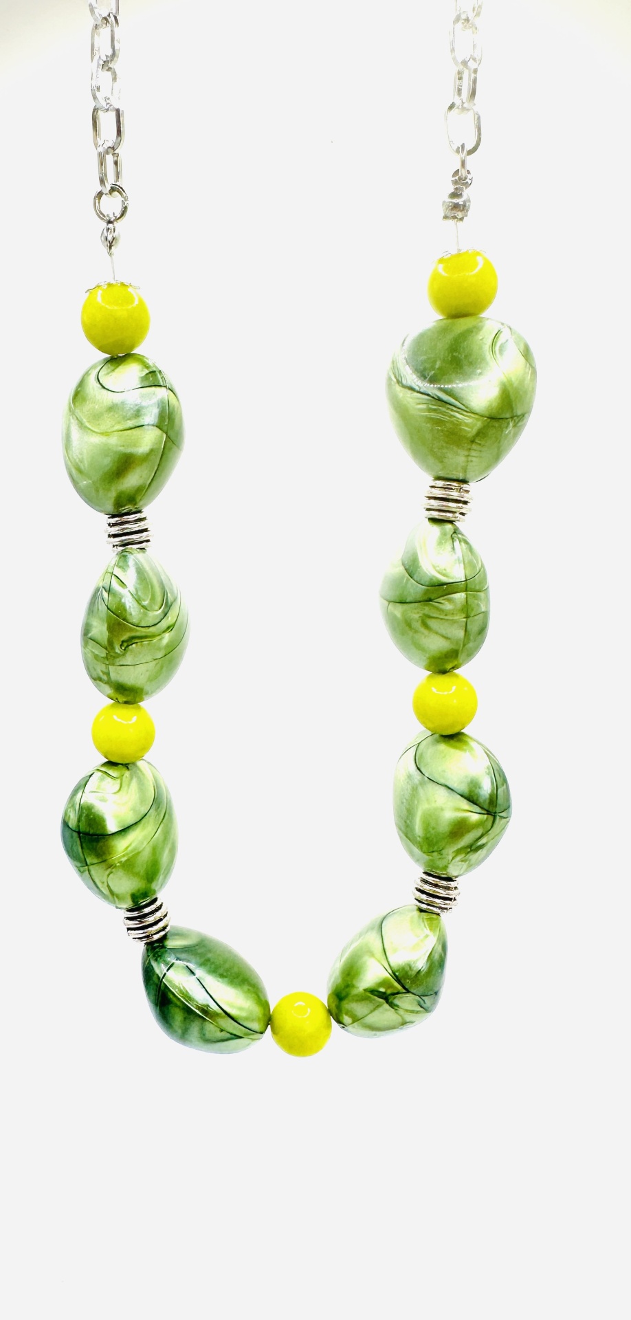 Material e Cor que Revitalizam: Este colar é uma sinfonia de tons frescos e vibrantes. Apresenta contas de resina de formato irregular, com um efeito marmoreado em diversas tonalidades de verde (desde o verde-maçã ao verde-floresta), que evocam a beleza orgânica das paisagens naturais. Estas contas são intercaladas com pequenas esferas de resina num verde vivo e luminoso, que adicionam um toque de alegria e luz. O colar é montado numa corrente de aço prateado, que proporciona um contraste moderno e elegante, realçando o brilho das contas.
