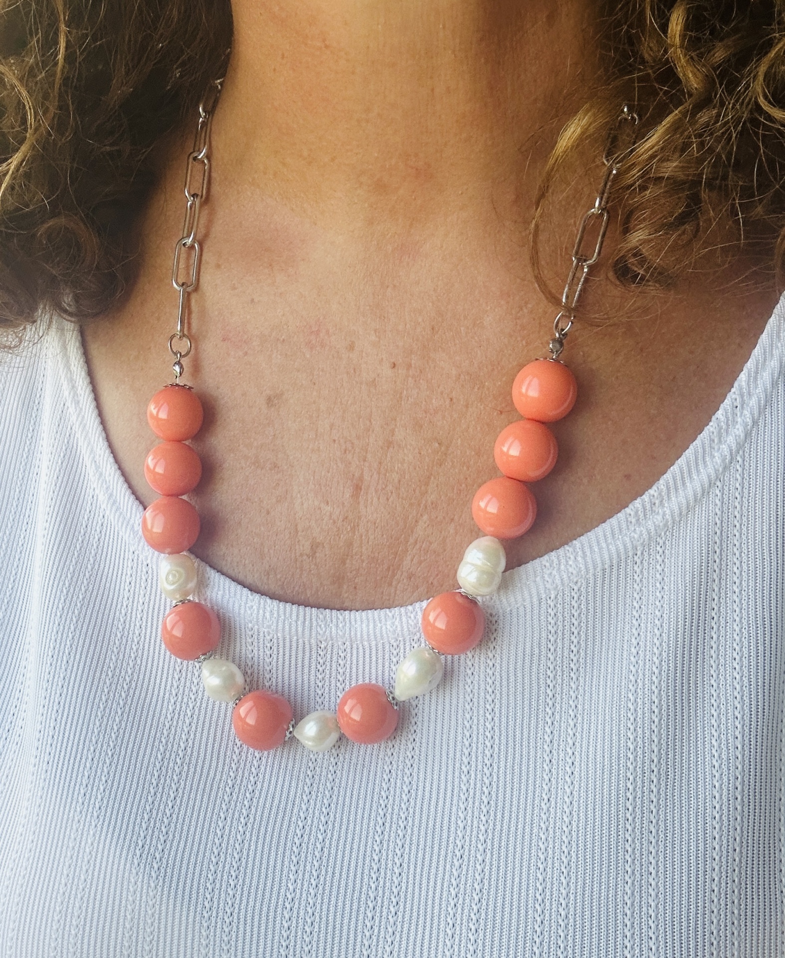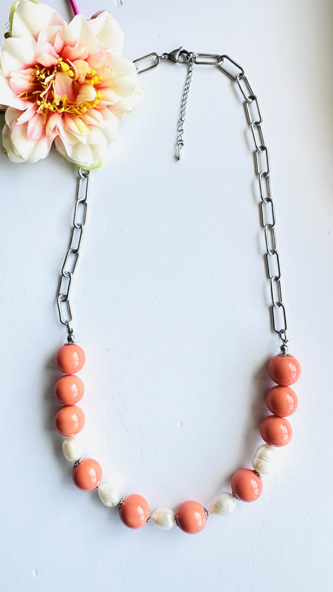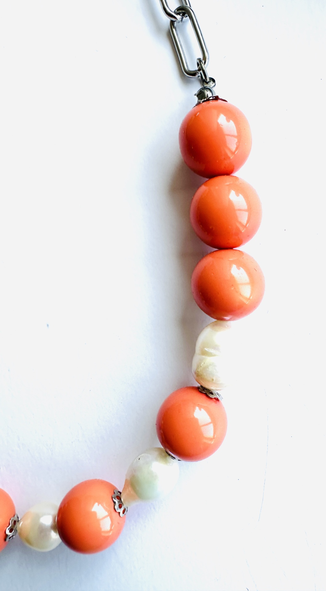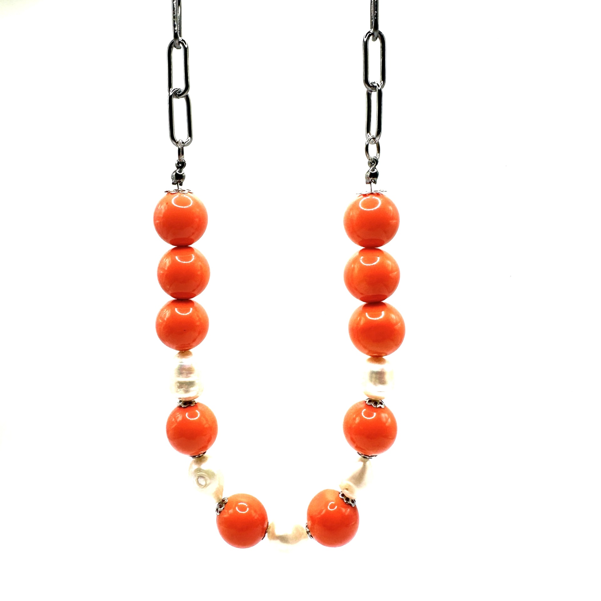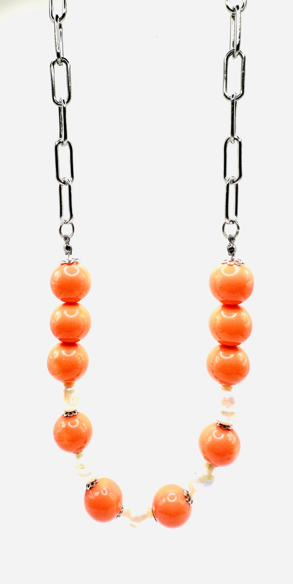 O colar apresenta grandes contas redondas em tom laranja vibrante, criando um impacto visual imediato. Estas são complementadas por pérolas irregulares e ligadas por segmentos de corrente prateada de elos grandes, conferindo um estilo arrojado e contemporâneo. Mede 56 cm de comprimento, ideal para assentar elegantemente no decote, e inclui um extensor de 4 cm para um ajuste perfeito.