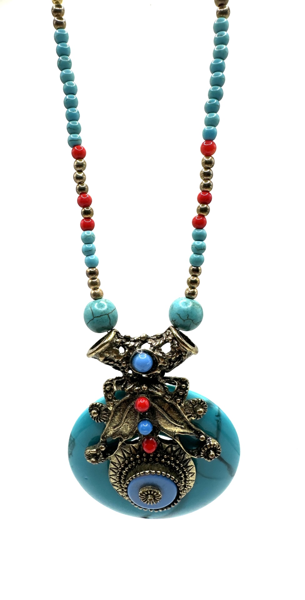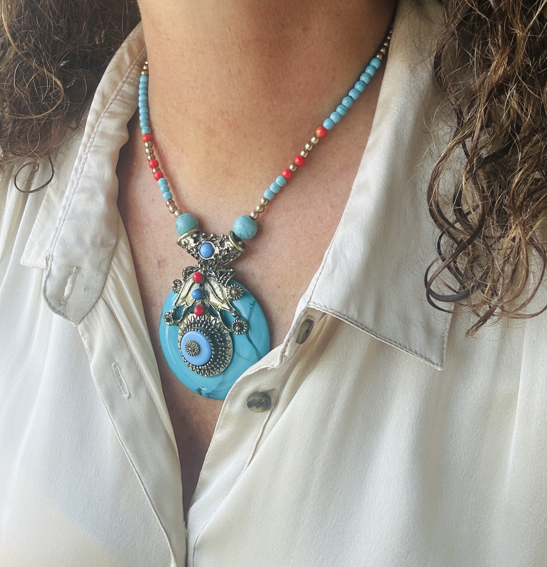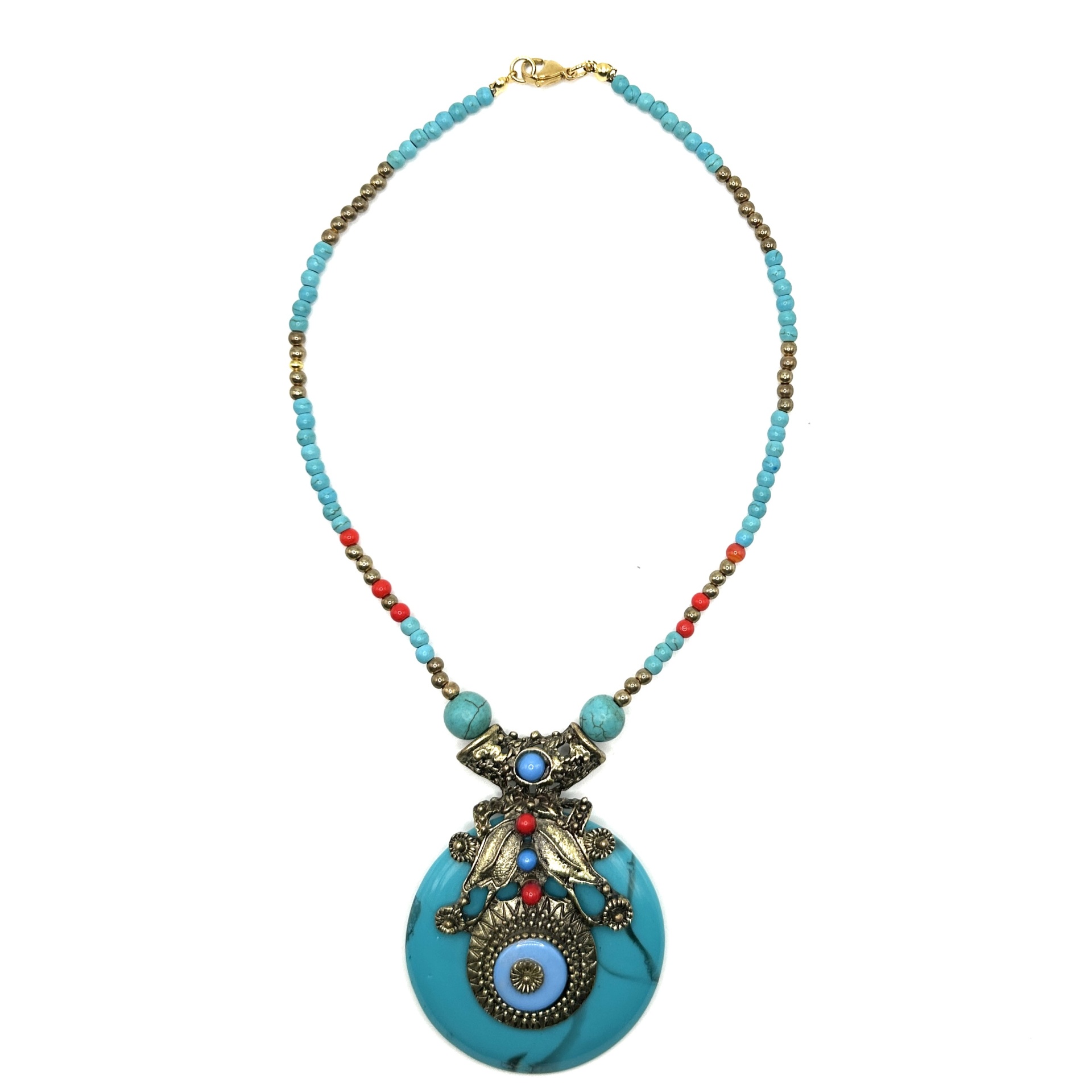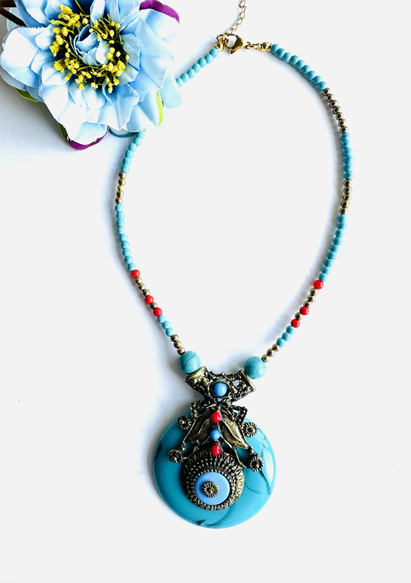 Este colar é composto por uma sequência de contas azuis em tom turquesa, intercaladas com contas douradas e pontos de cor vermelha, criando uma paleta rica e apelativa. O ponto central é um pendente ornamentado em metal de tom dourado envelhecido, com detalhes intrincados e incrustações de contas azuis e vermelhas, que evocam um design tribal ou étnico. A combinação de materiais e cores confere a este colar uma presença marcante e uma autenticidade inegável.