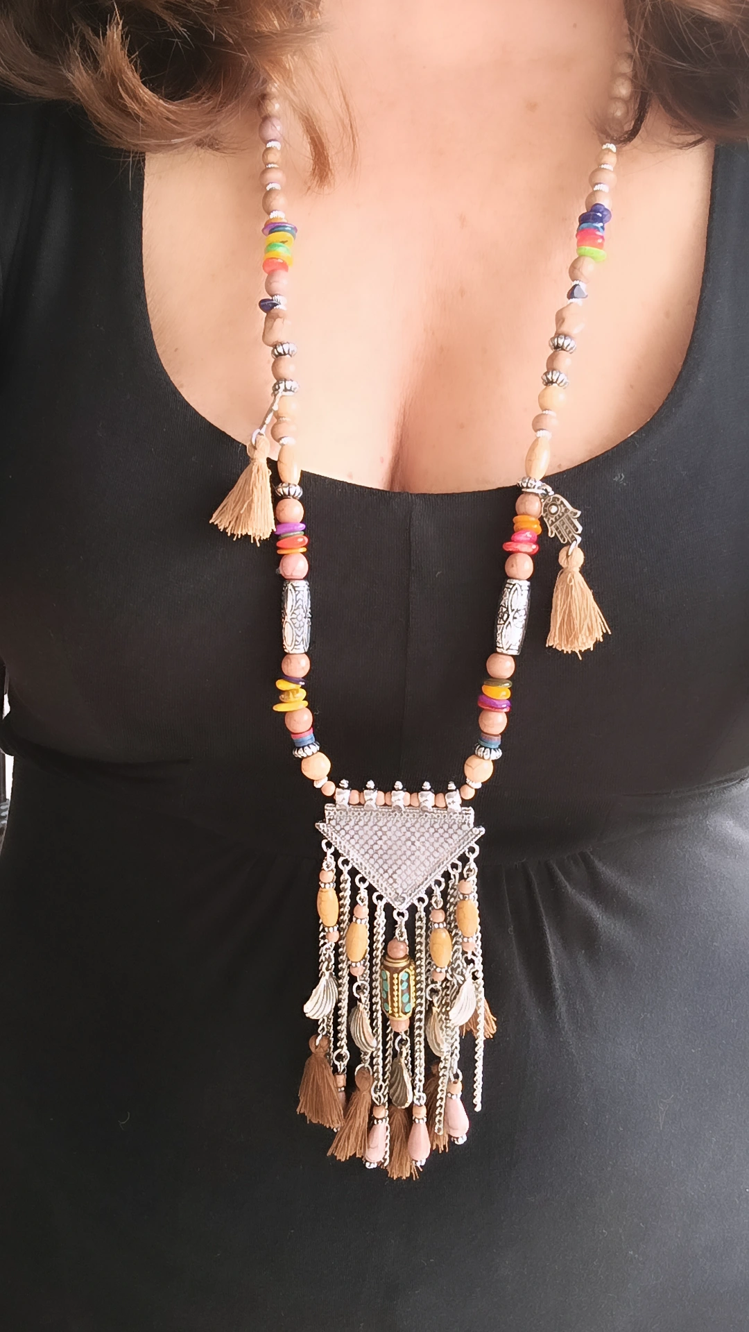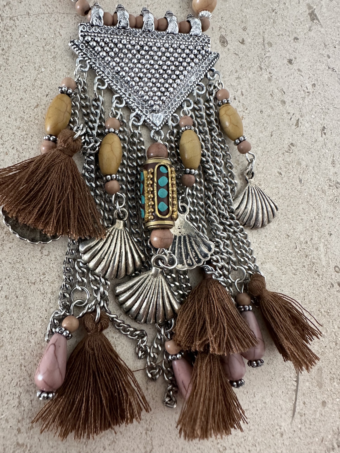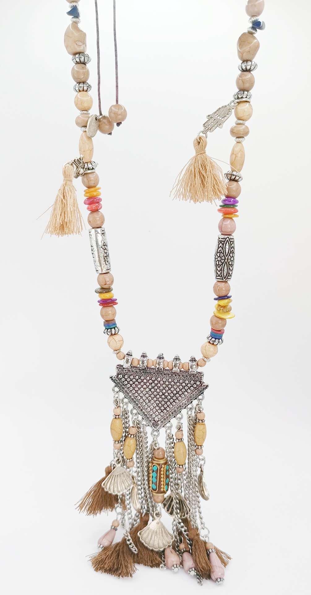 Descubra a beleza e autenticidade com o nosso colar étnico de 74 centímetros, elaborado com contas de pedra em tons de castanho, uma chapa em forma de triângulo em metal envelhecido, e pêndulos adornados com missangas, conchas, e pequenos tasséis castanhos. Este colar é a peça perfeita para quem procura um estilo único e culturalmente rico.