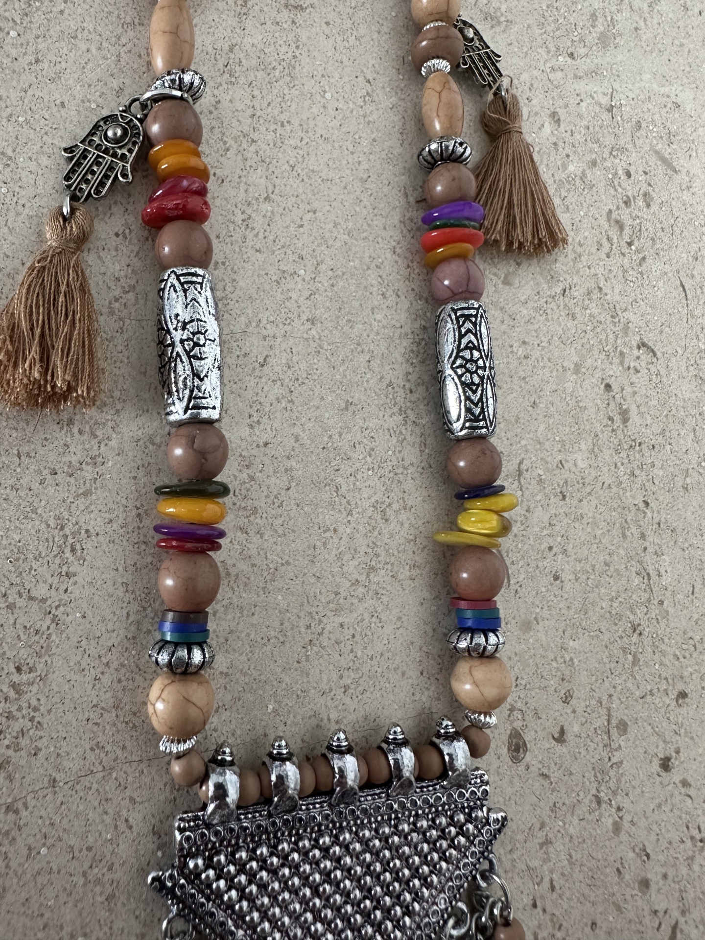Chapa Triangular em Metal Envelhecido: Peça central que destaca o estilo étnico e autêntico do colar.