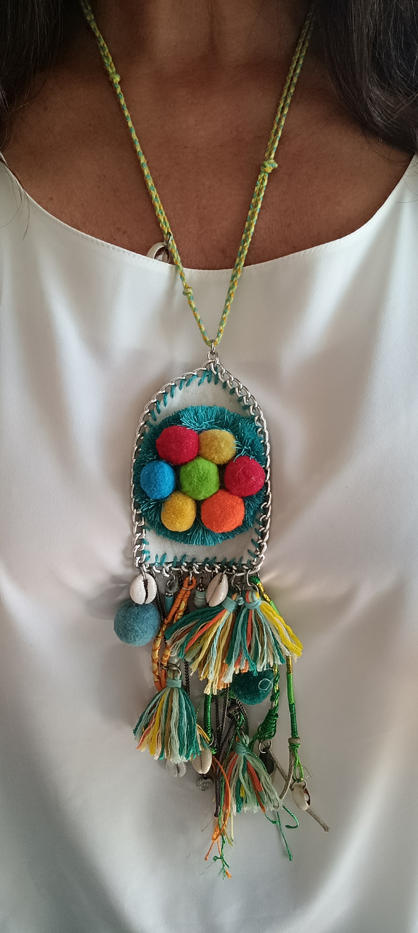 Este colar alegre em tons verdes com pêndulos de pompons, búzios e missangas é mais do que um simples acessório; é uma celebração de cor, do estilo e da alegria de viver. Adquira o seu hoje e leve uma dose de diversão e frescor ao seu dia a dia.