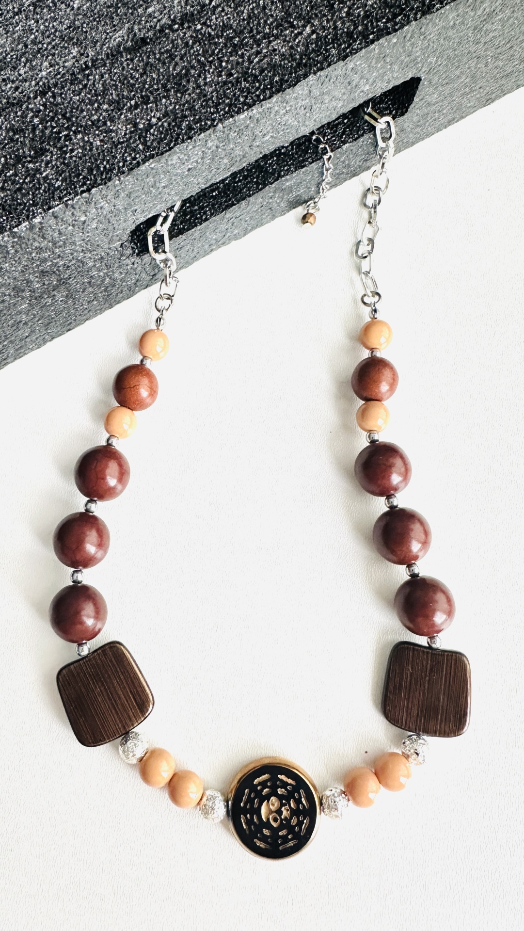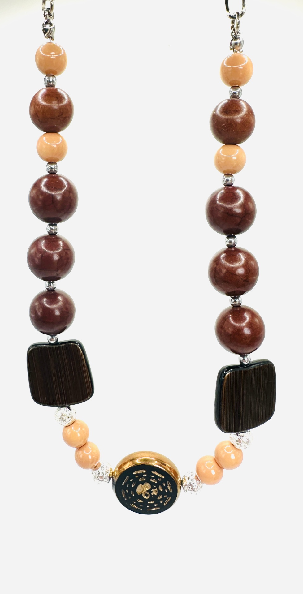 Um colar deslumbrante e de design exclusivo da Rafi Store, ideal para quem quer um acessório marcante e versátil. O contraste entre as pedras naturais avermelhadas e os tons suaves das esferas proporciona um equilíbrio perfeito entre sofisticação e modernidade. Um design exclusivo da Rafi, pensado para mulheres que apreciam acessórios distintos e de qualidade.