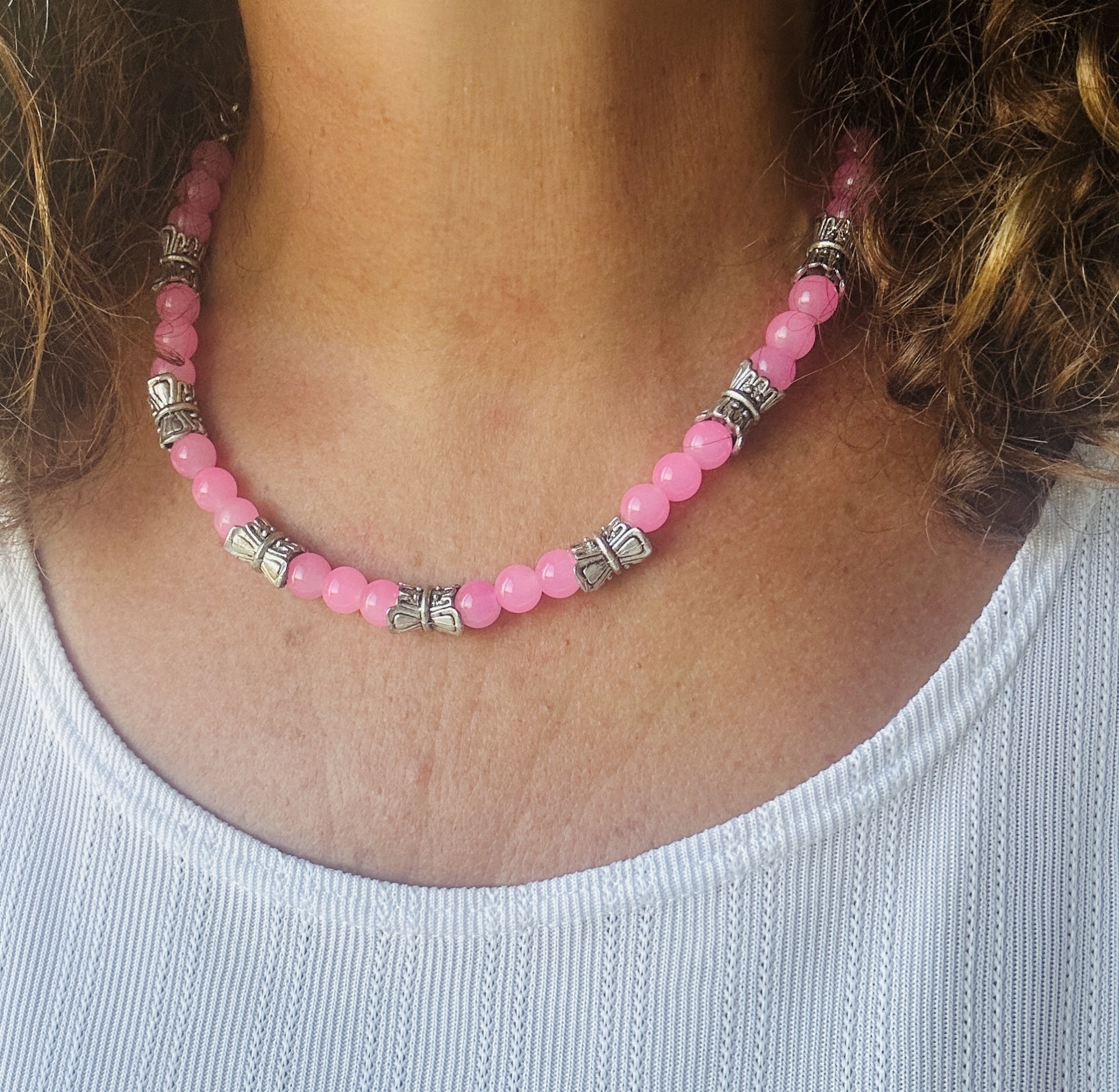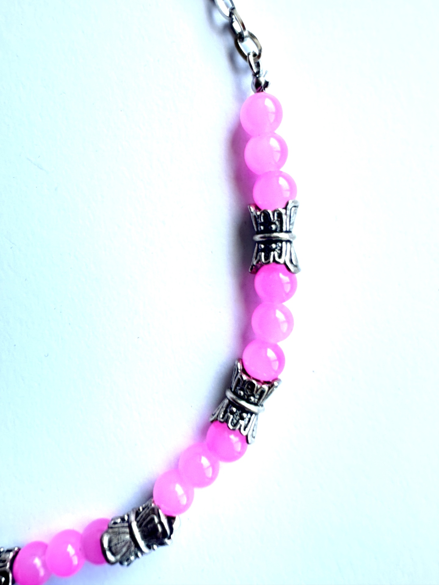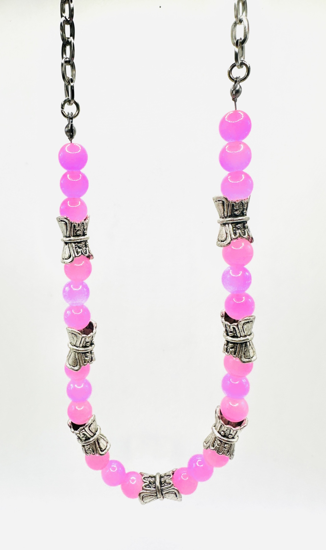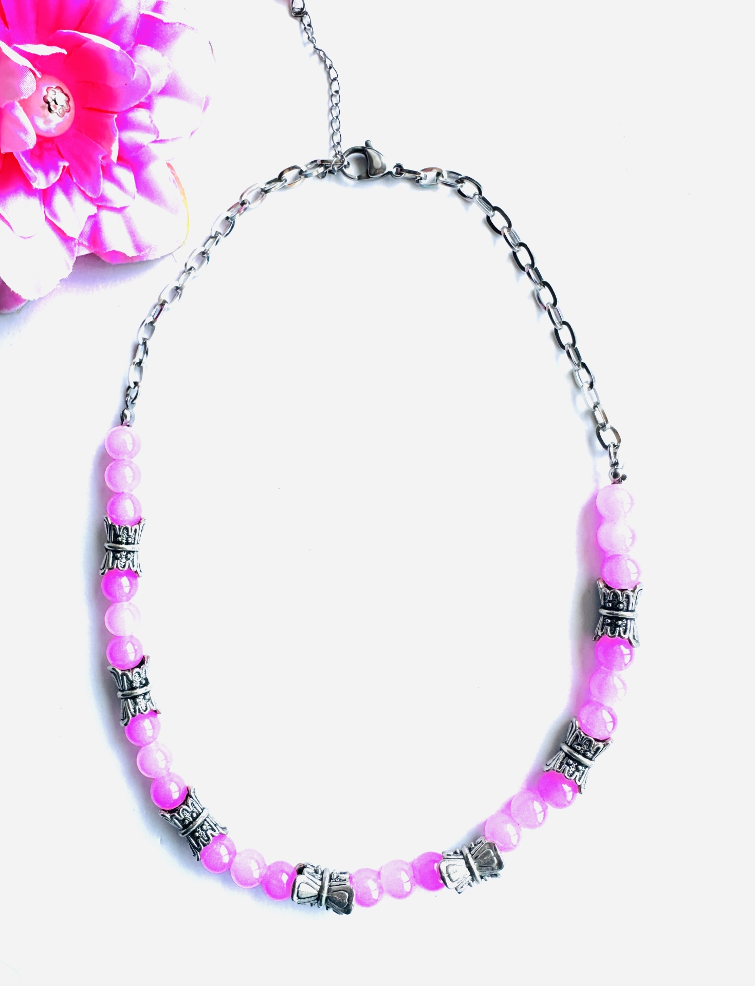 O colar apresenta contas redondas em tom rosa vibrante, intercaladas com elementos prateados ornamentados que adicionam um toque de mistério e sofisticação. Mede 40 cm de comprimento, ideal para assentar elegantemente no pescoço, e inclui um extensor de 4 cm para ajuste perfeito. Possui um fecho de mosquetão seguro e prático.