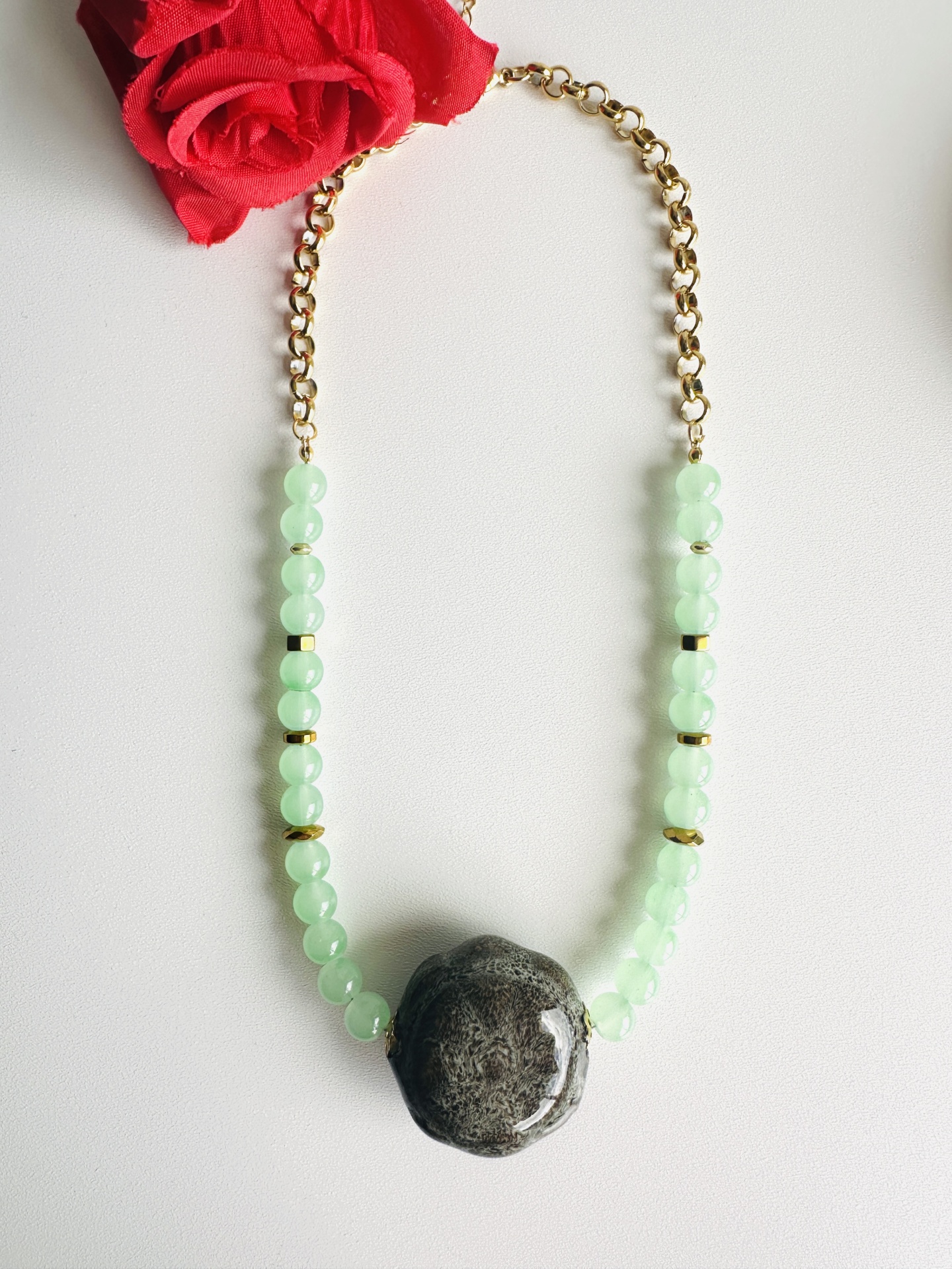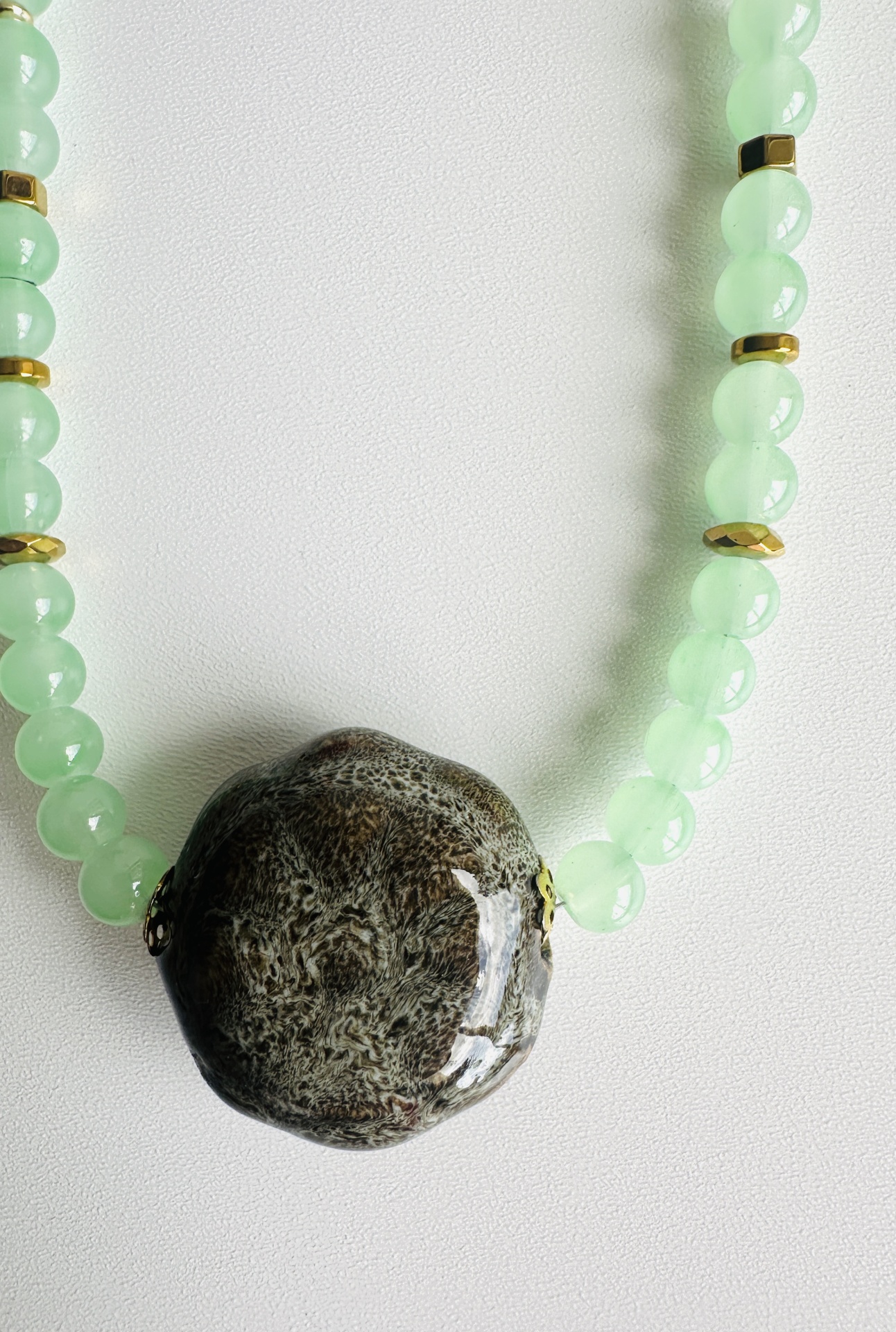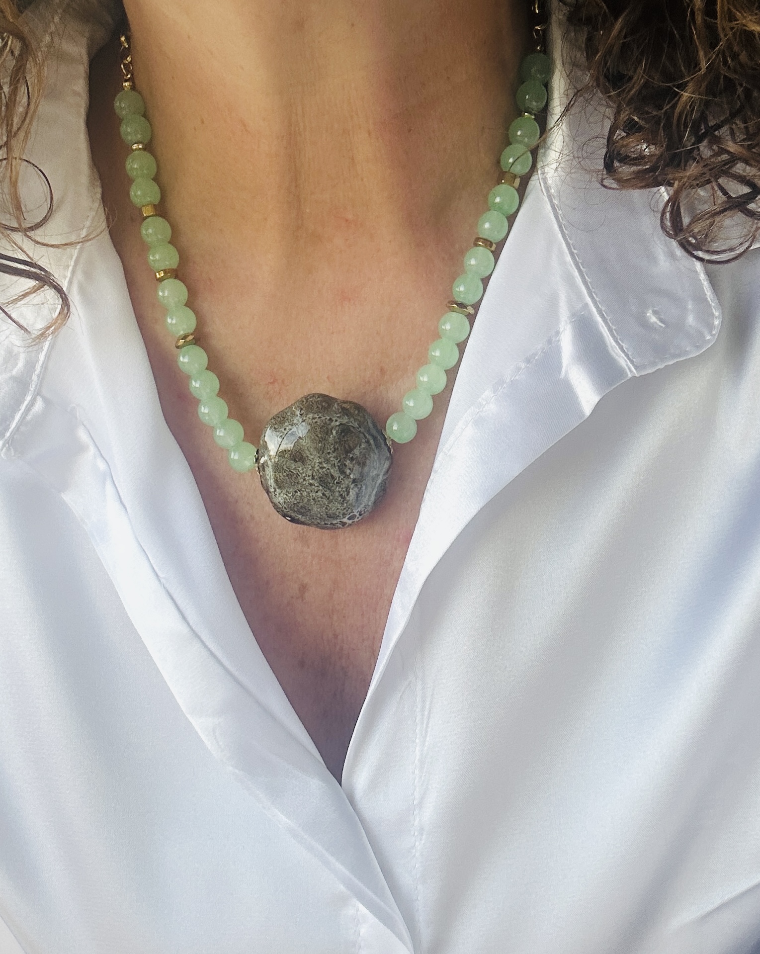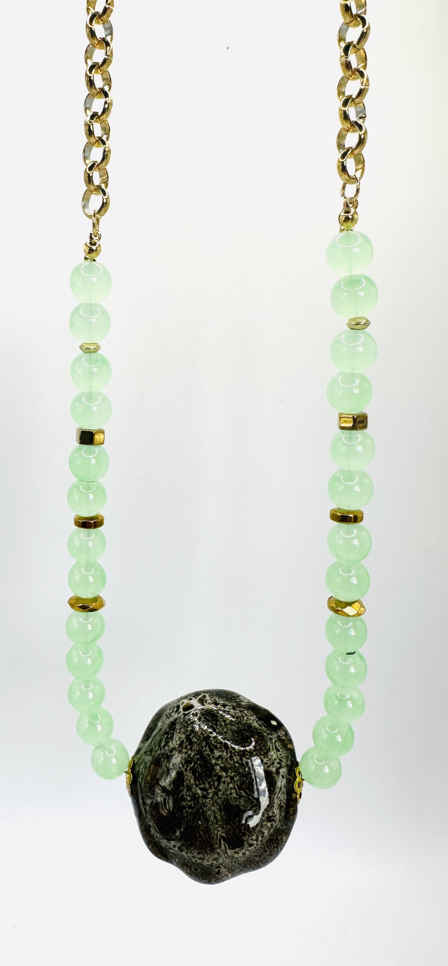 Este colar é uma expressão de originalidade e requinte, ideal para quem valoriza peças de autor e detalhes únicos. Com um comprimento de 40 cm + extensor de 5 cm, esta criação apresenta uma combinação encantadora de pedras naturais verde água translúcidas, entremeadas por pequenos elementos metálicos dourados, e um destaque central: uma pedra em cerâmica de acabamento vidrado, com textura e brilho orgânico.