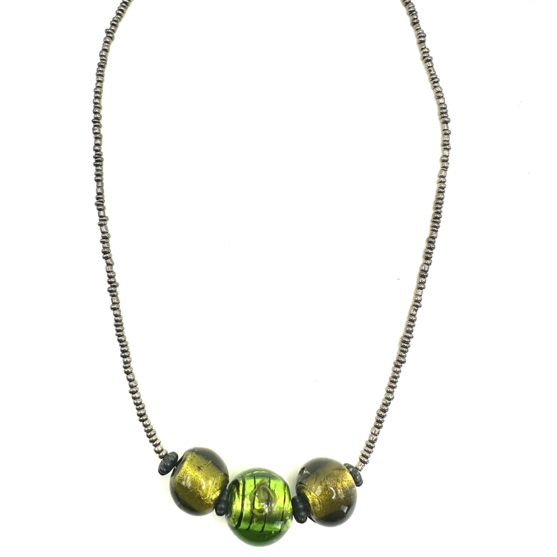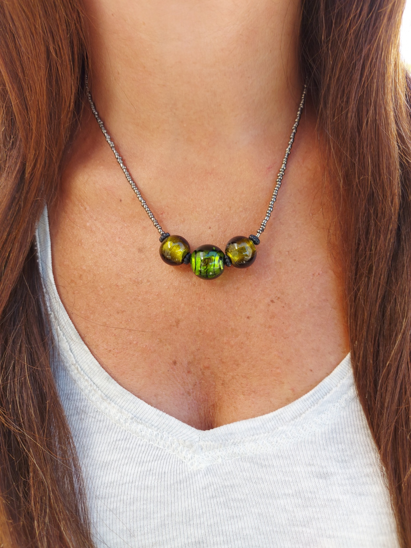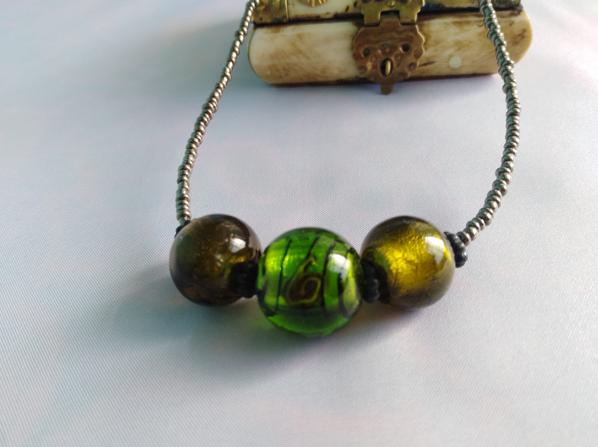 Detalhes, Material e Cor: Este adorno apresenta um fio delicado composto por pequenas missangas escuras com um brilho metálico subtil. O destaque central são três contas de vidro deslumbrantes: a conta do meio é uma esfera em autêntico vidro Murano de tom verde vibrante, que encerra no seu interior uma delicada flor desenhada, criando um efeito de profundidade único. Esta peça central é ladeada por duas contas esféricas em vidro translúcido verde-azeitona, que complementam a paleta de cores naturais.