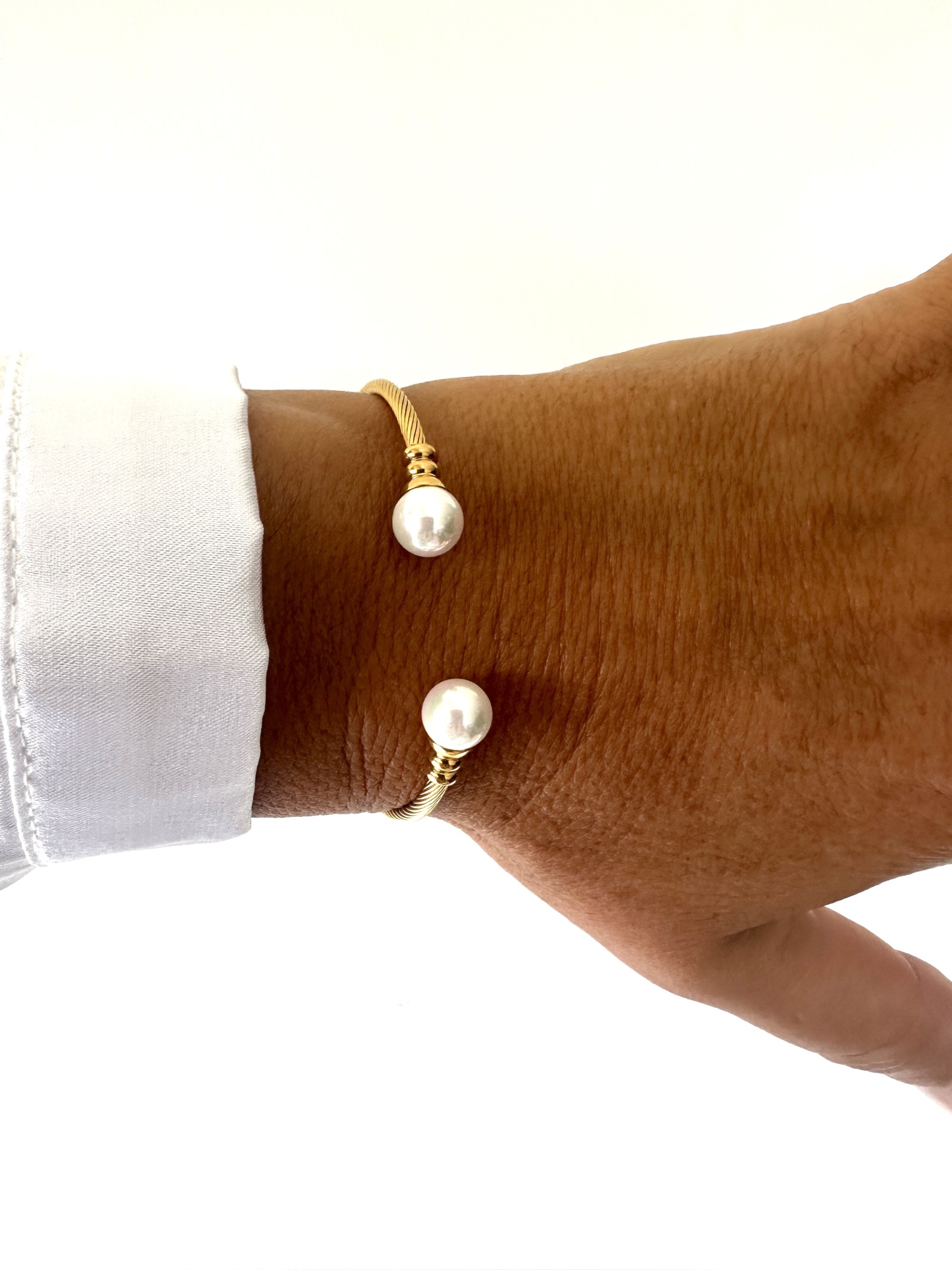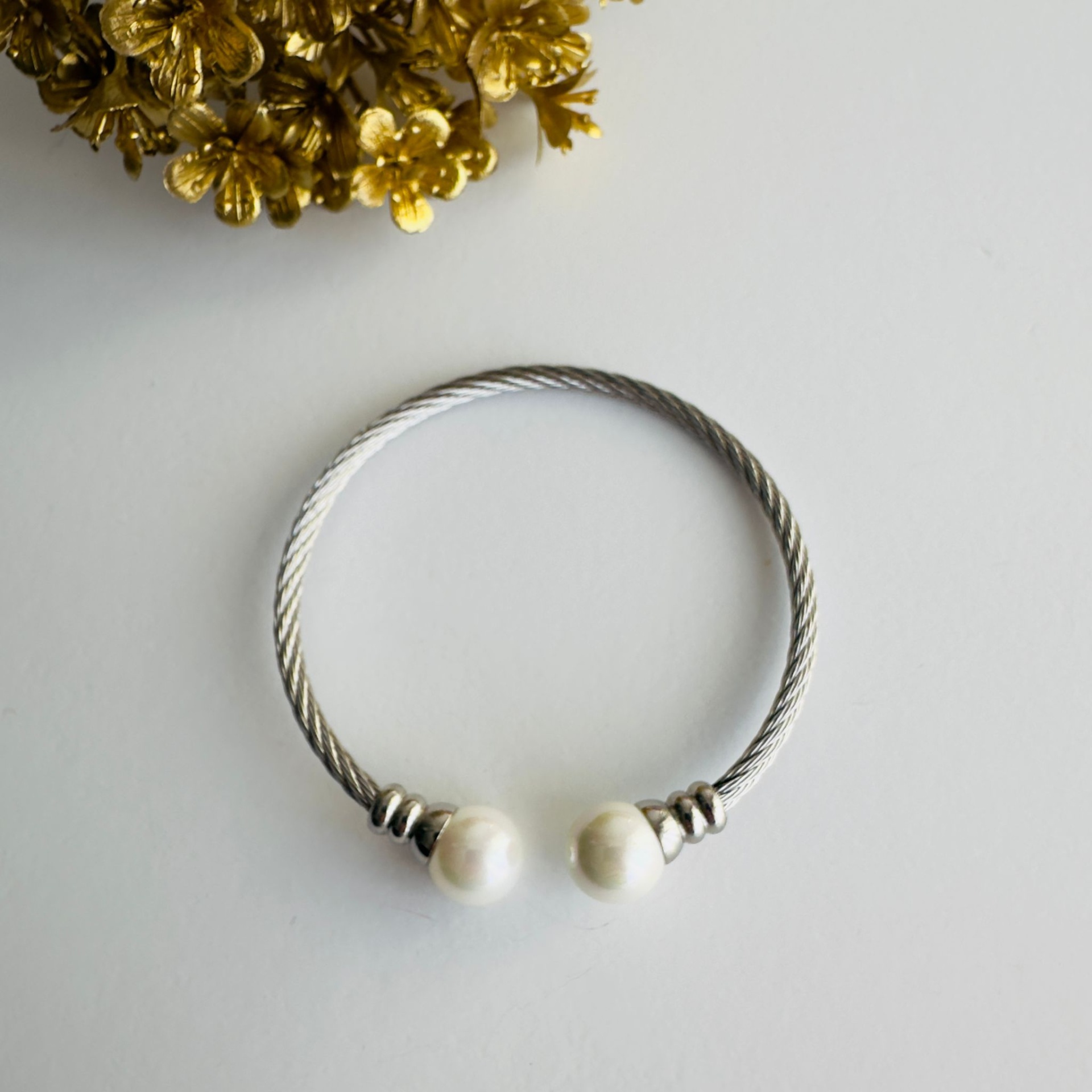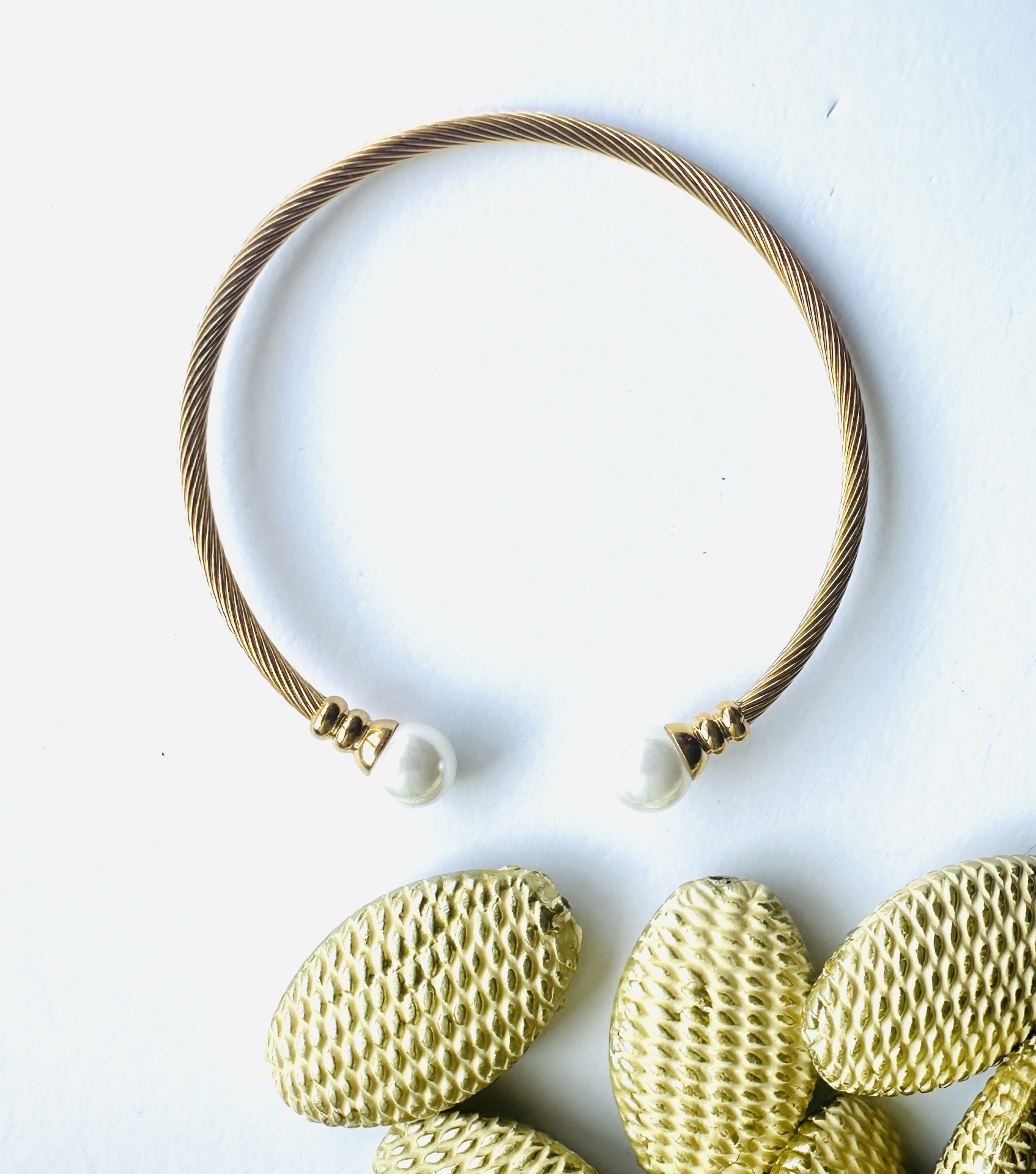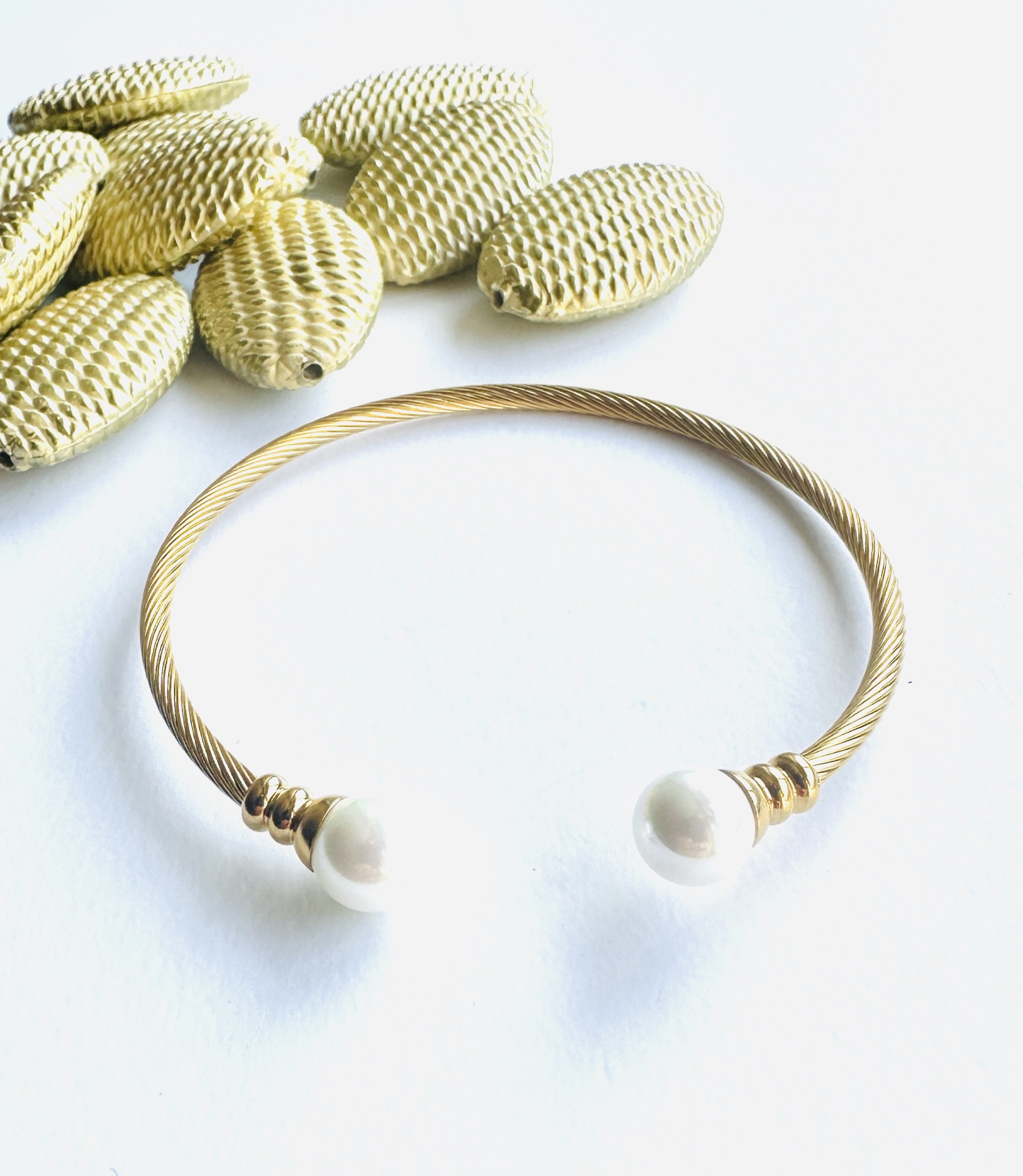 Confeccionada em aço inoxidável de alta qualidade, esta escrava apresenta um acabamento dourado vibrante e um design de cabo torcido, sinónimo de durabilidade e estilo. É adornada nas extremidades com duas magníficas pérolas de simulação, que conferem um toque de requinte clássico e uma luminosidade subtil. A robustez do aço garante que esta peça manterá o seu brilho e beleza ao longo do tempo.