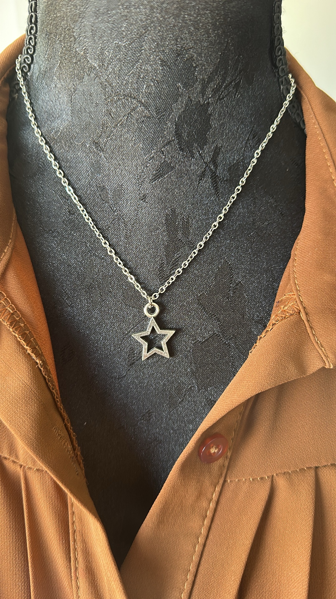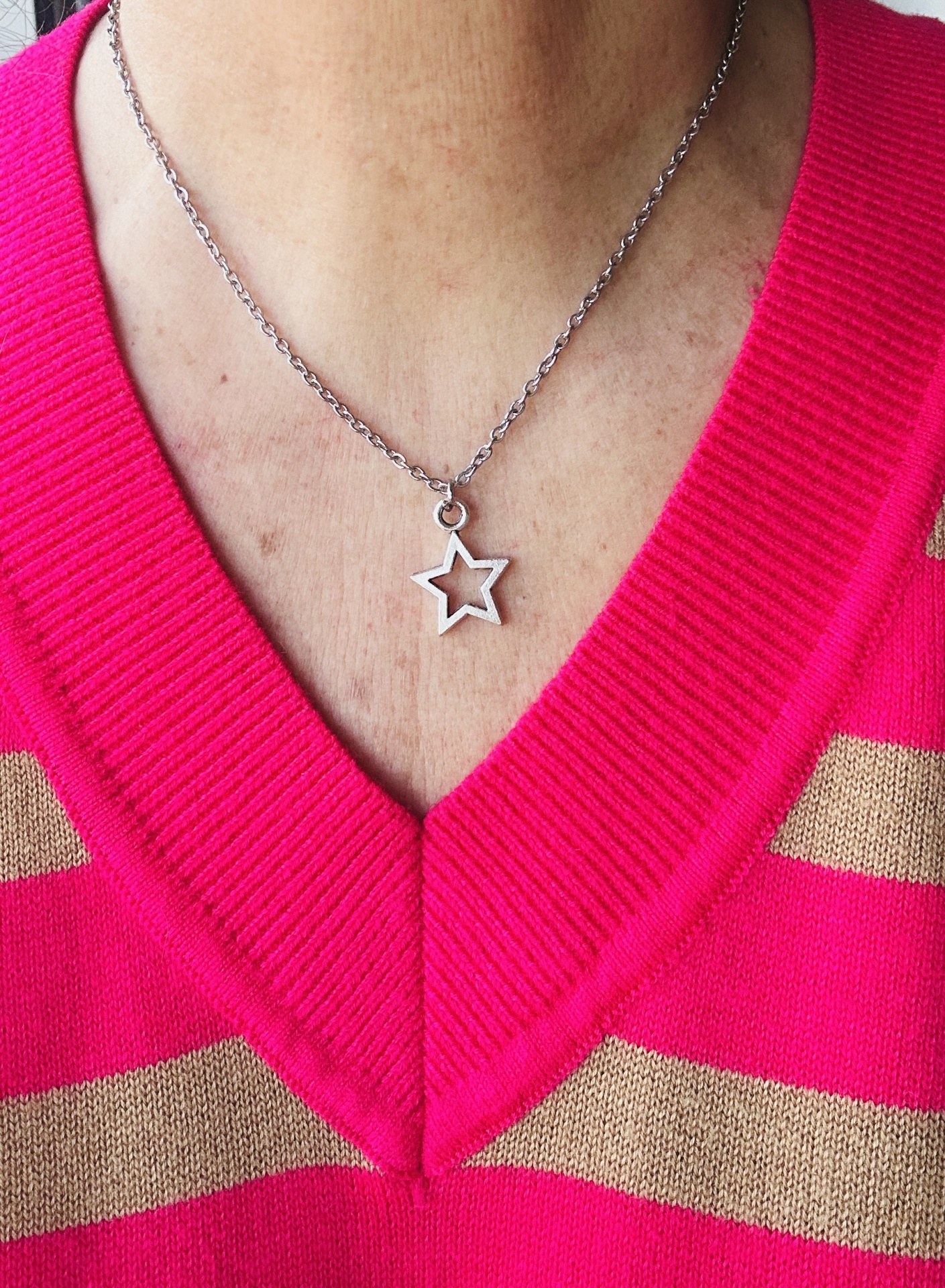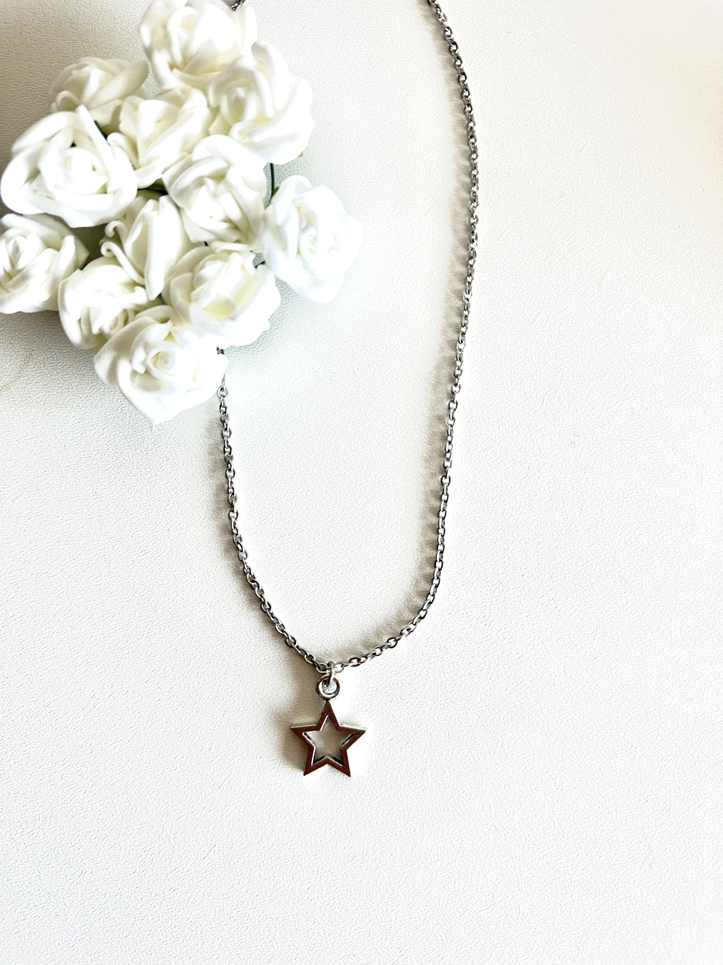 Detalhes, Material e Cor: Este elemento de distinção é fabricado em aço inoxidável de tom prateado, garantindo uma peça de alta qualidade que não escurece e mantém o seu aspeto novo durante anos. O pendente apresenta uma estrela de cinco pontas com um design vazado, proporcionando uma elegância minimalista e leve.