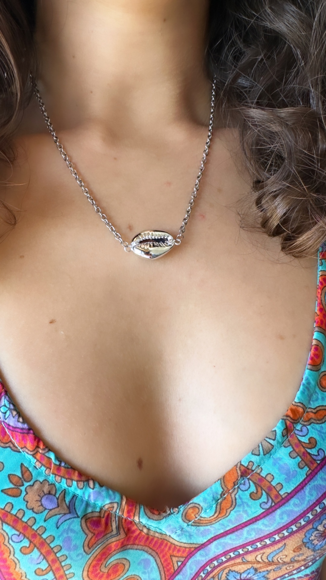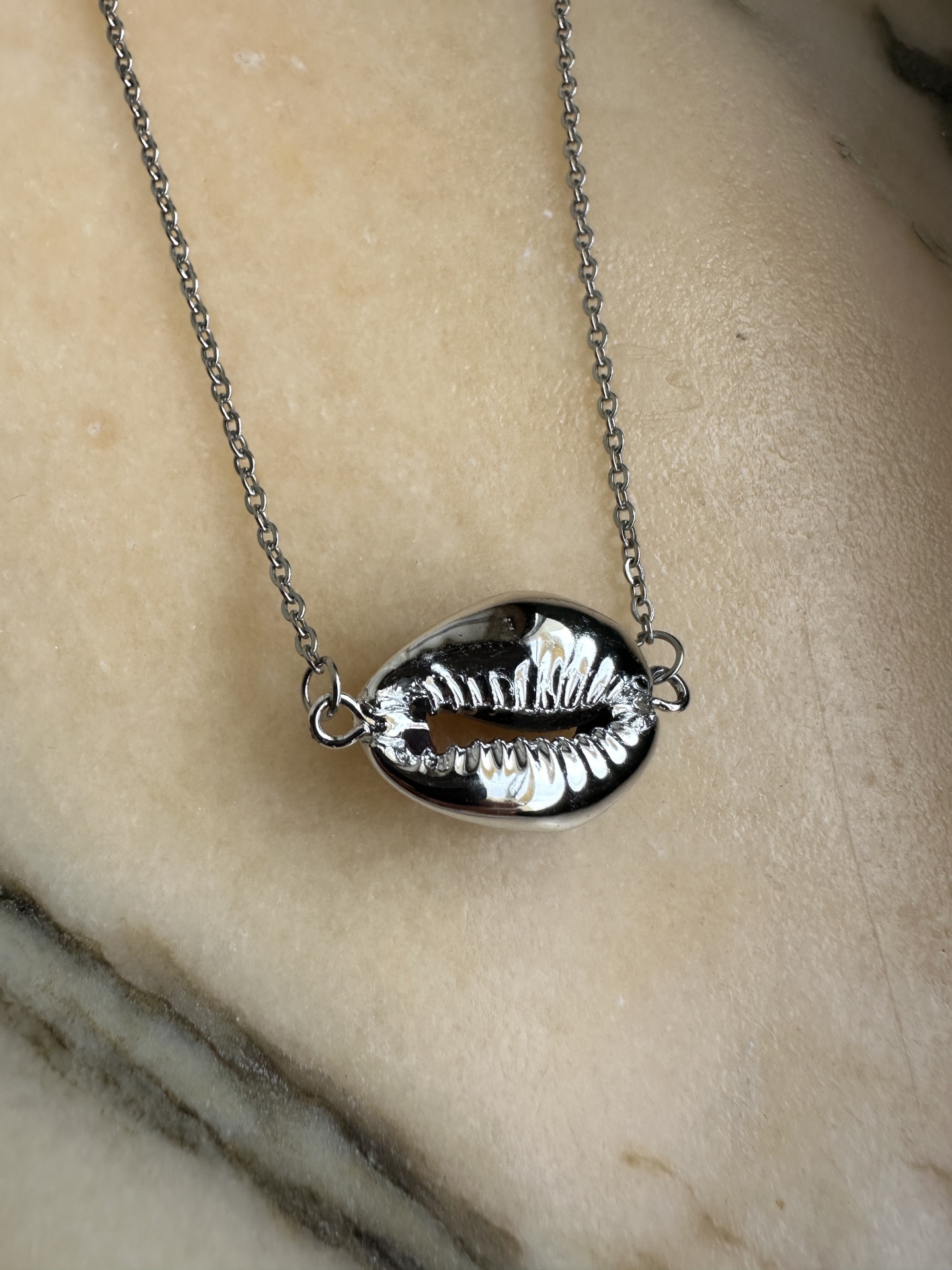 Adicione um toque de elegância minimalista ao seu estilo com este fio curto em aço com pingente de búzio prateado em metal, e sinta-se confiante e sofisticada em qualquer ocasião!