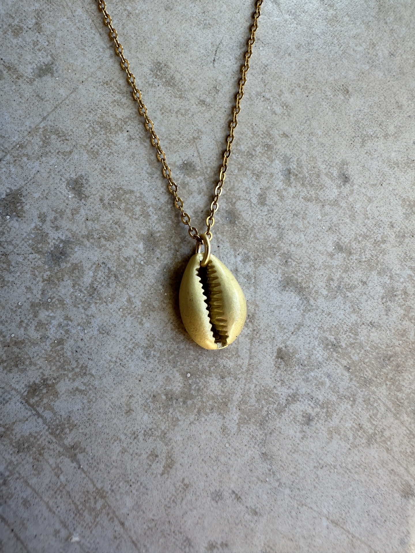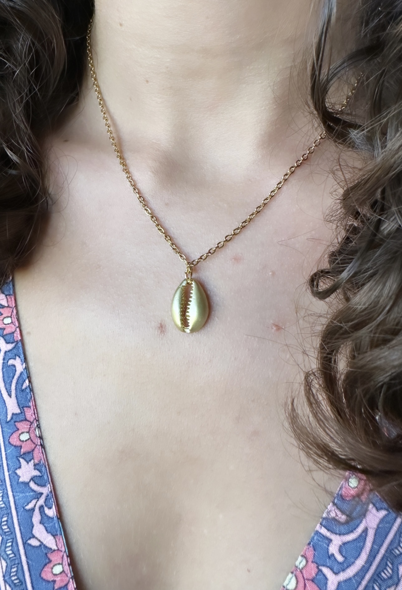 Este fio em aço dourado com um deslumbrante búzio dourado é uma peça que une a beleza natural ao estilo elegante.