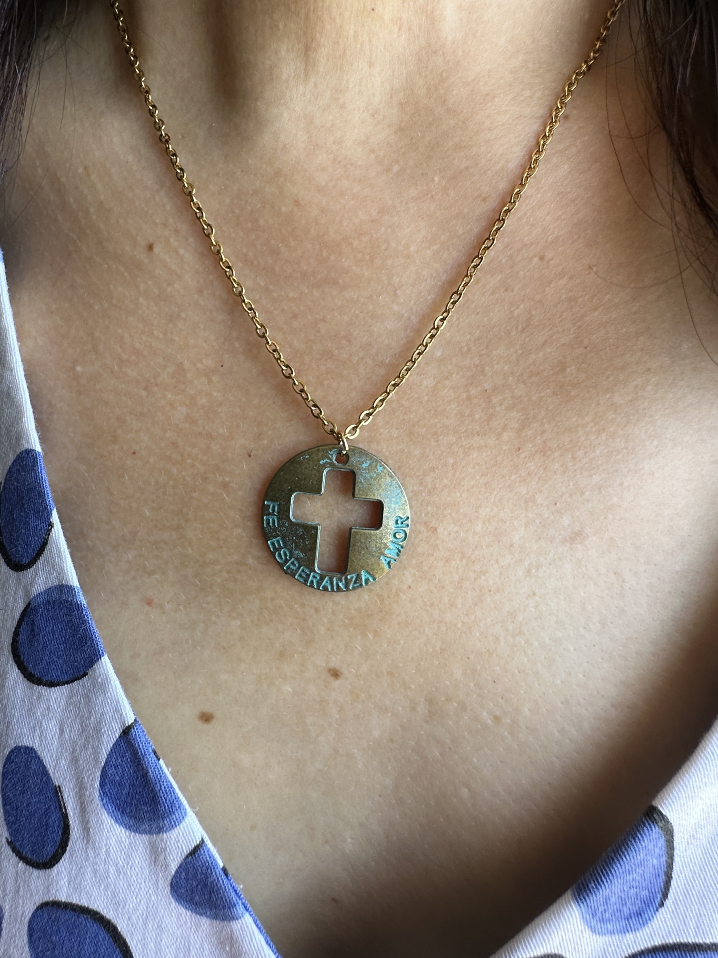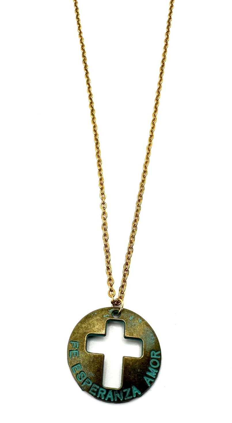 Detalhes, Material e Cor: Este mimo é fabricado em aço inoxidável com um requintado banho dourado de aspeto vintage, garantindo uma peça duradoura que mantém a sua beleza ao longo do tempo. O pendente circular apresenta um recorte central em forma de cruz e inscrições nítidas das virtudes que o definem.