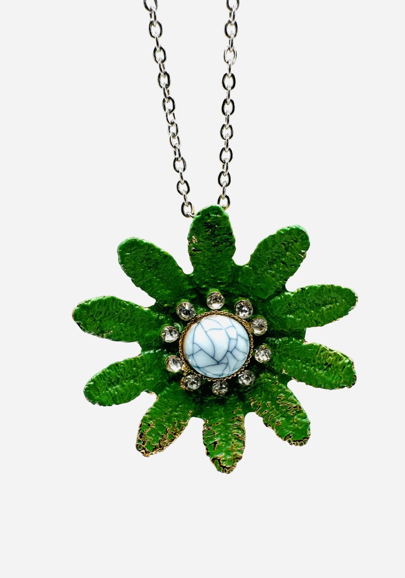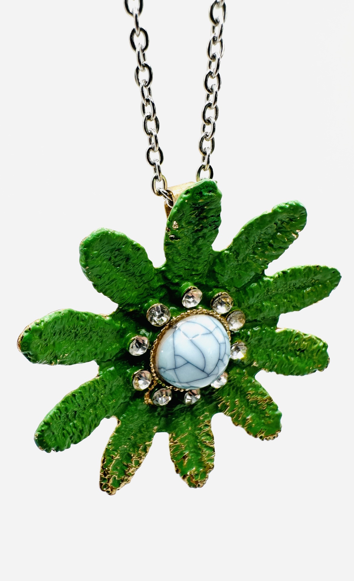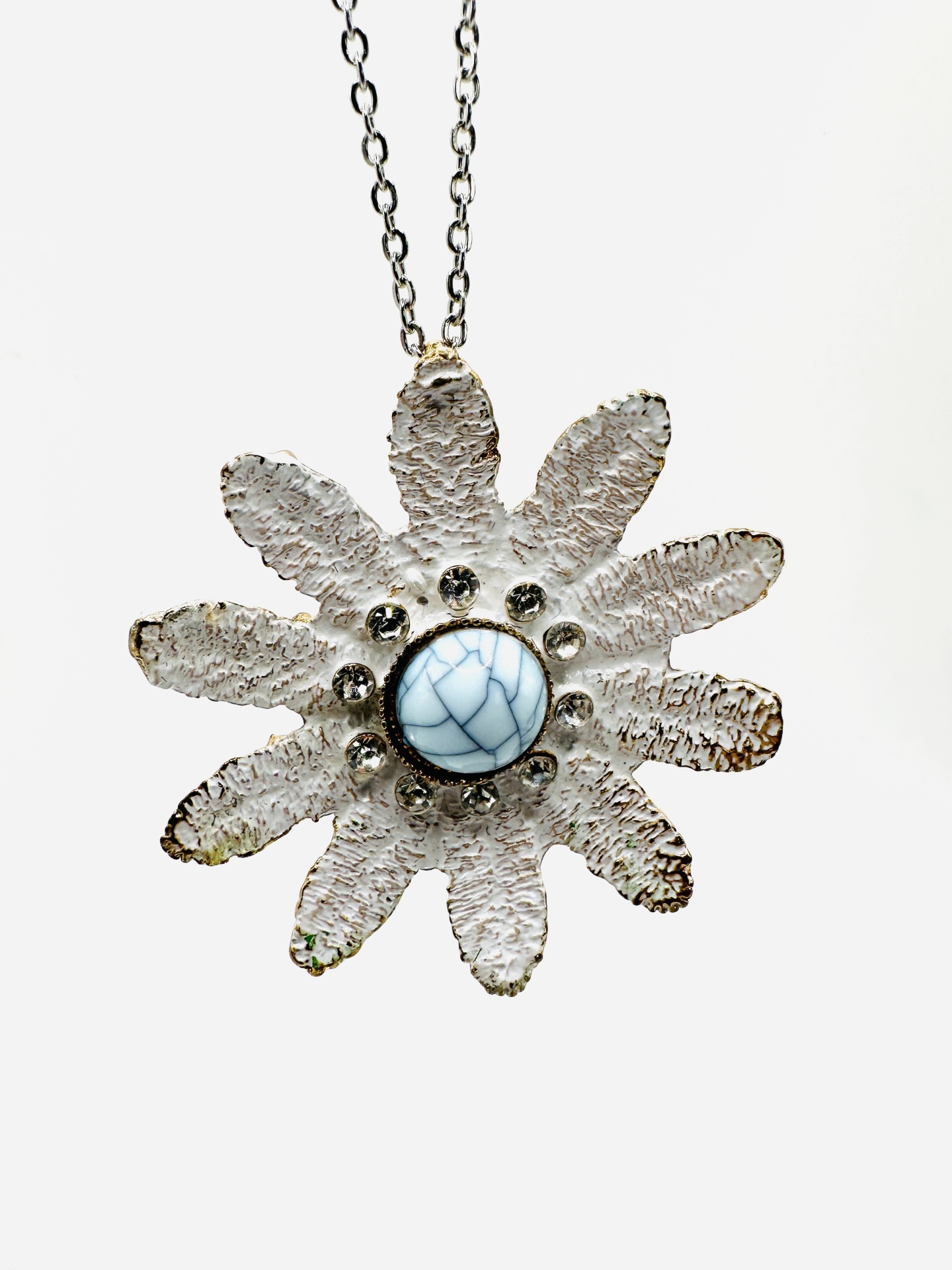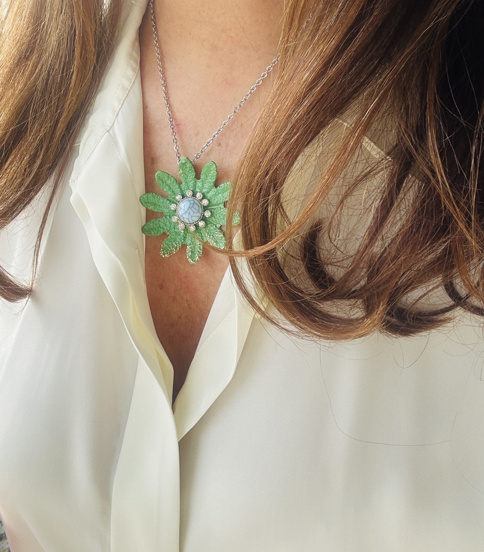 Apresentamos este colar único e vibrante, perfeito para destacar o seu estilo com elegância e personalidade. A peça central deste colar é um pingente em forma de flor, com um tom intenso e textura marcante, traz um toque artesanal e natural. O centro da flor é adornado com uma pedra azul estilo turquesa e cercado por pequenas pedras brilham