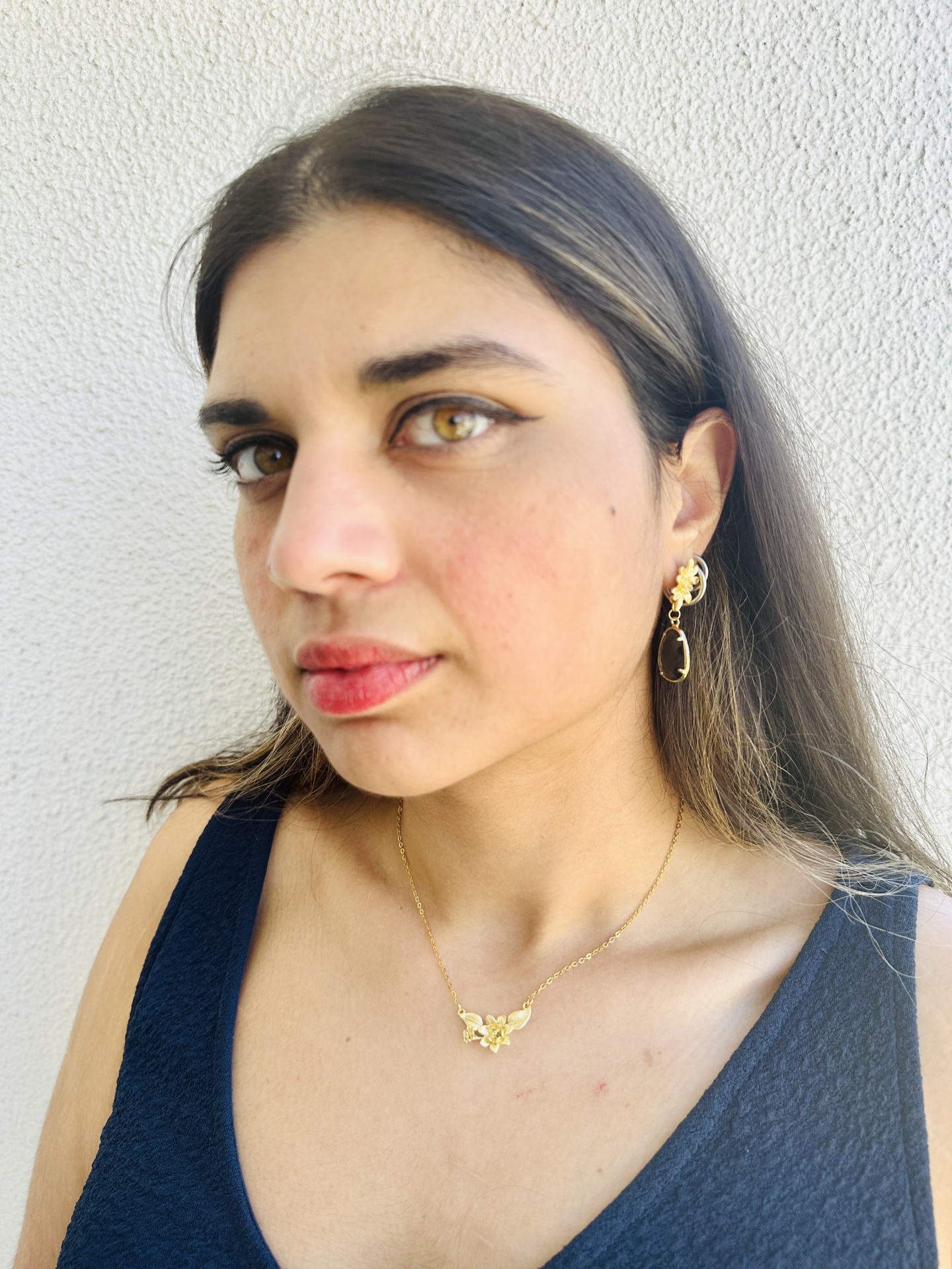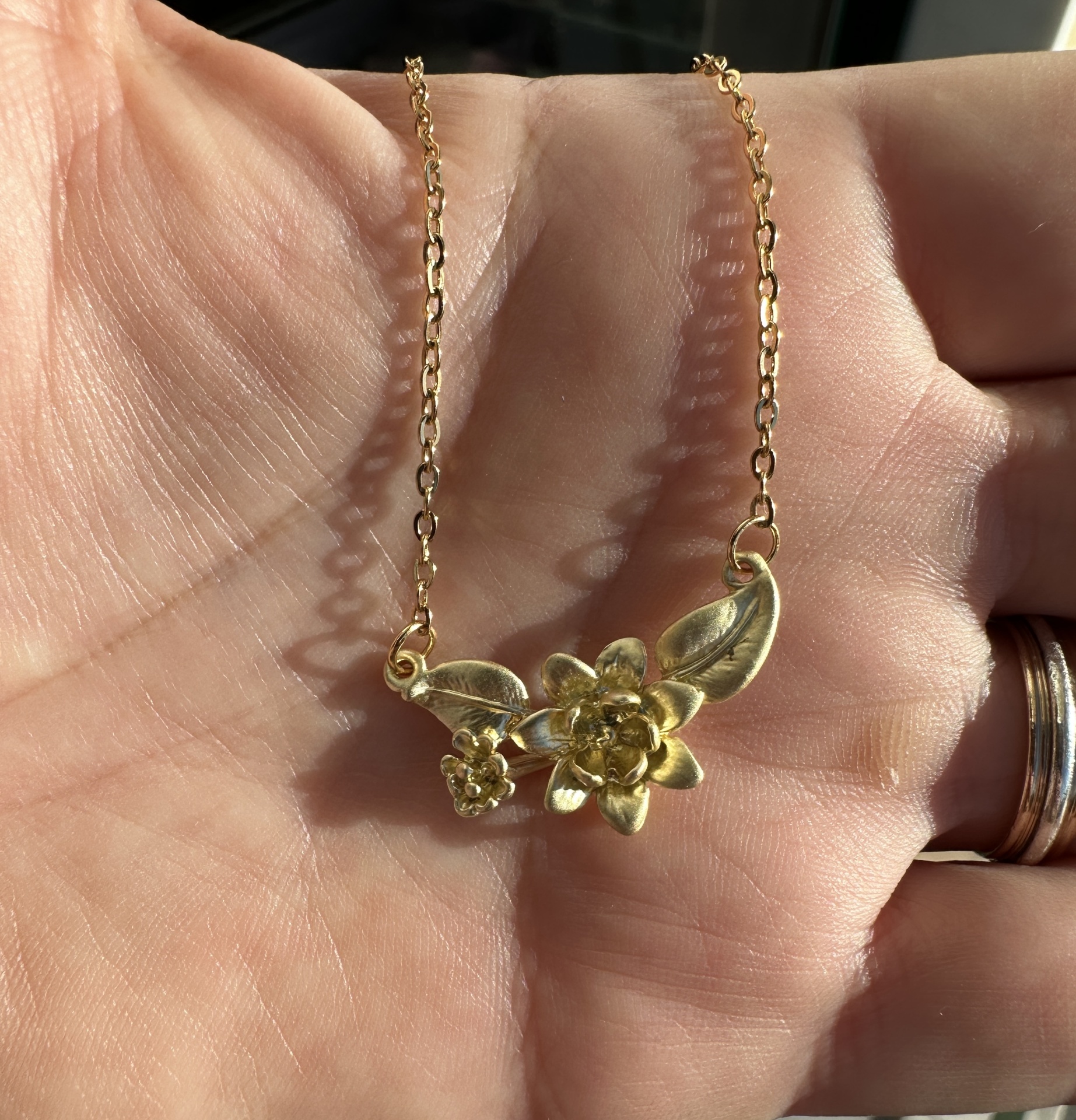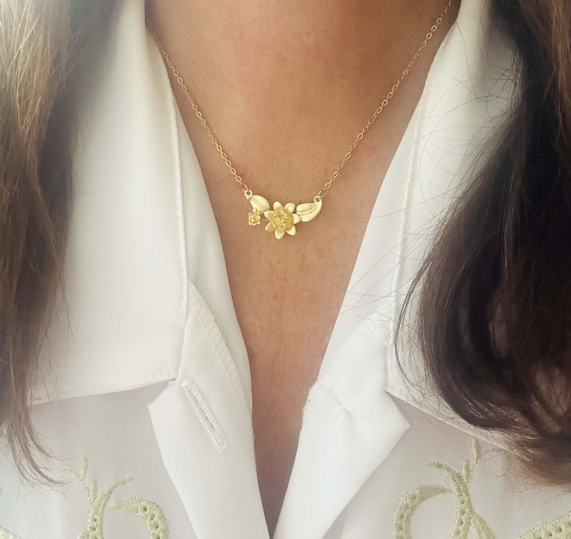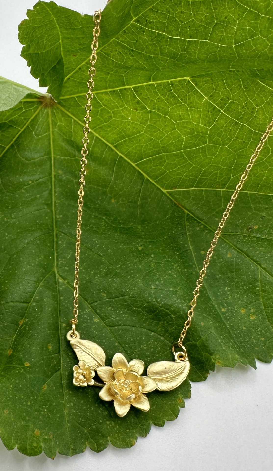 Este colar delicado, com 40 cm e extensor de 4 cm, é uma peça encantadora que apresenta um pendente floral em tons dourados, transmite elegância e feminilidade. O pendente é detalhadamente esculpido em forma de flor, com pétalas e folhas cuidadosamente moldadas, cria um visual natural e atraente. A corrente fina e discreta complementa perfeitamente o pendente, mantêm o foco no detalhe floral. Este colar é ideal para quem aprecia joias com um toque de natureza e um design intemporal.