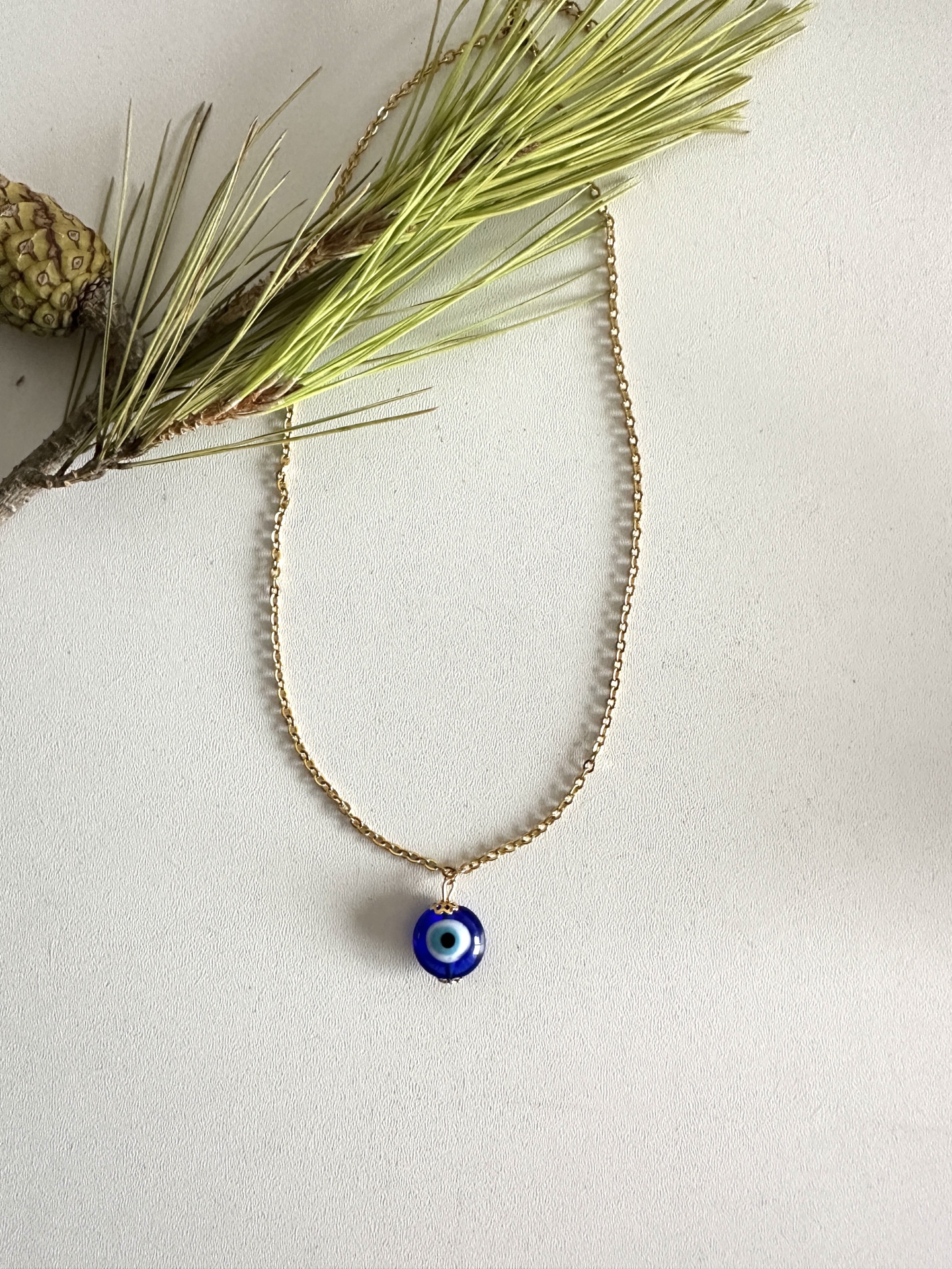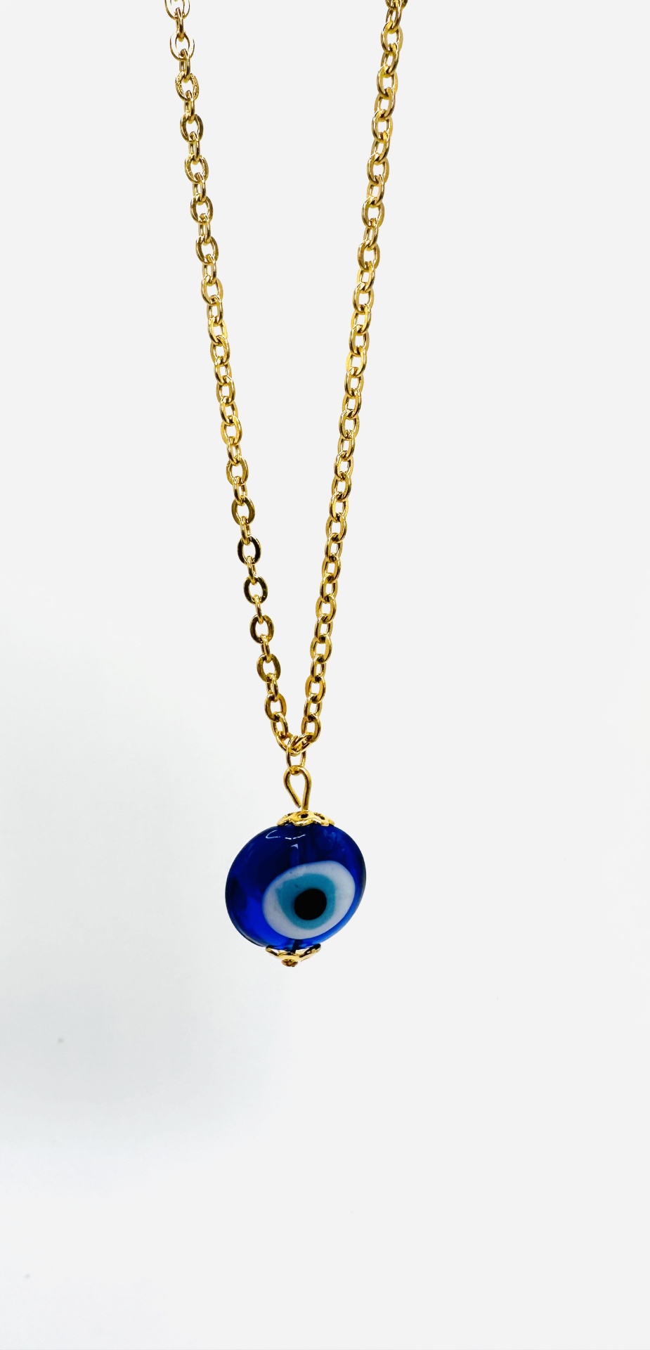Invista na sua paz e brilho com o nosso deslumbrante Fio em Aço Dourado com 42 cm e extensor de 4 cm e Pendente de Olho Grego em Vidro Murano com 1.5cm. Este acessório é mais do que beleza; é a sua auto-recompensa e o seu símbolo de empoderamento, que carrega consigo um significado emocional de segurança e bem-estar.