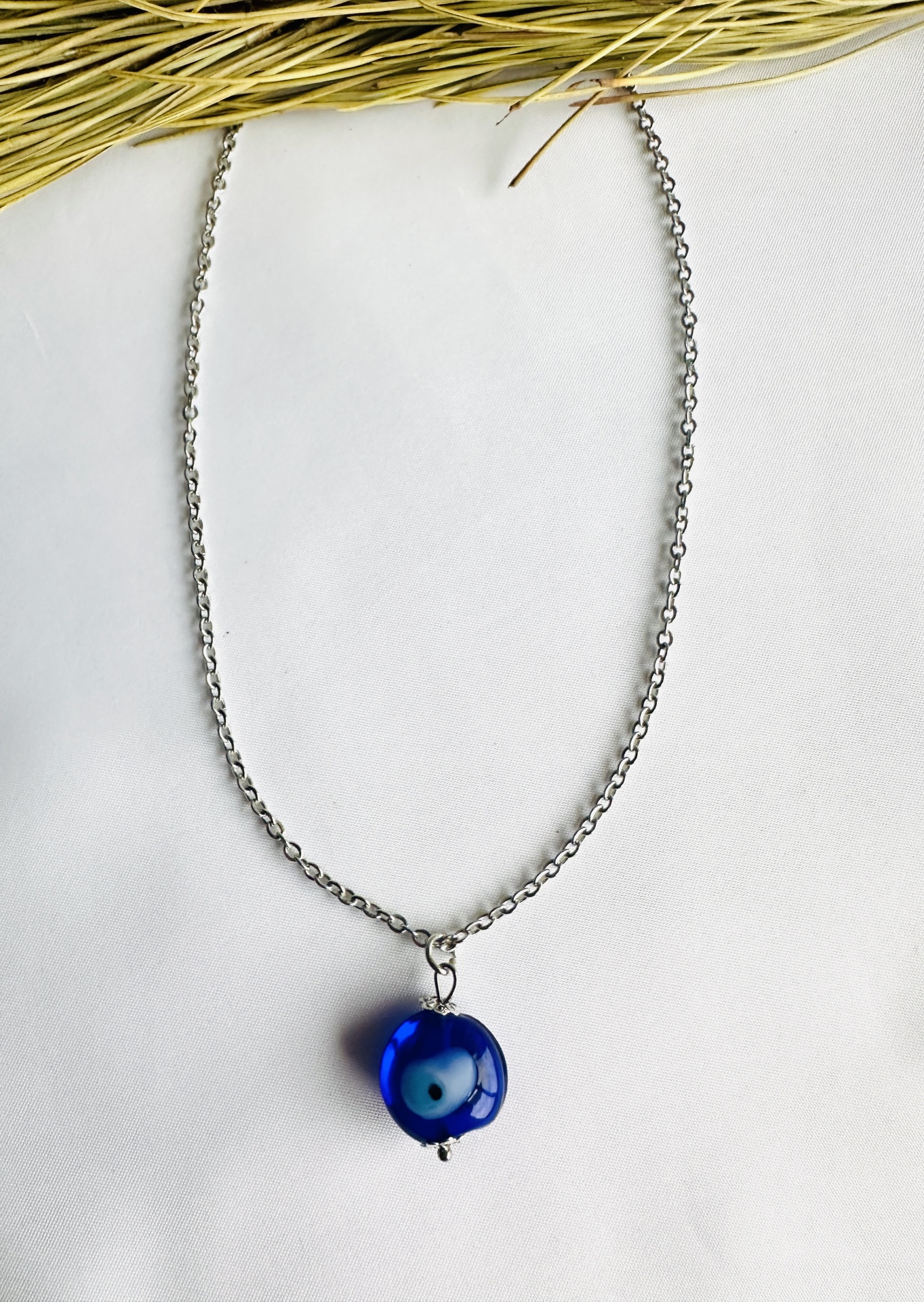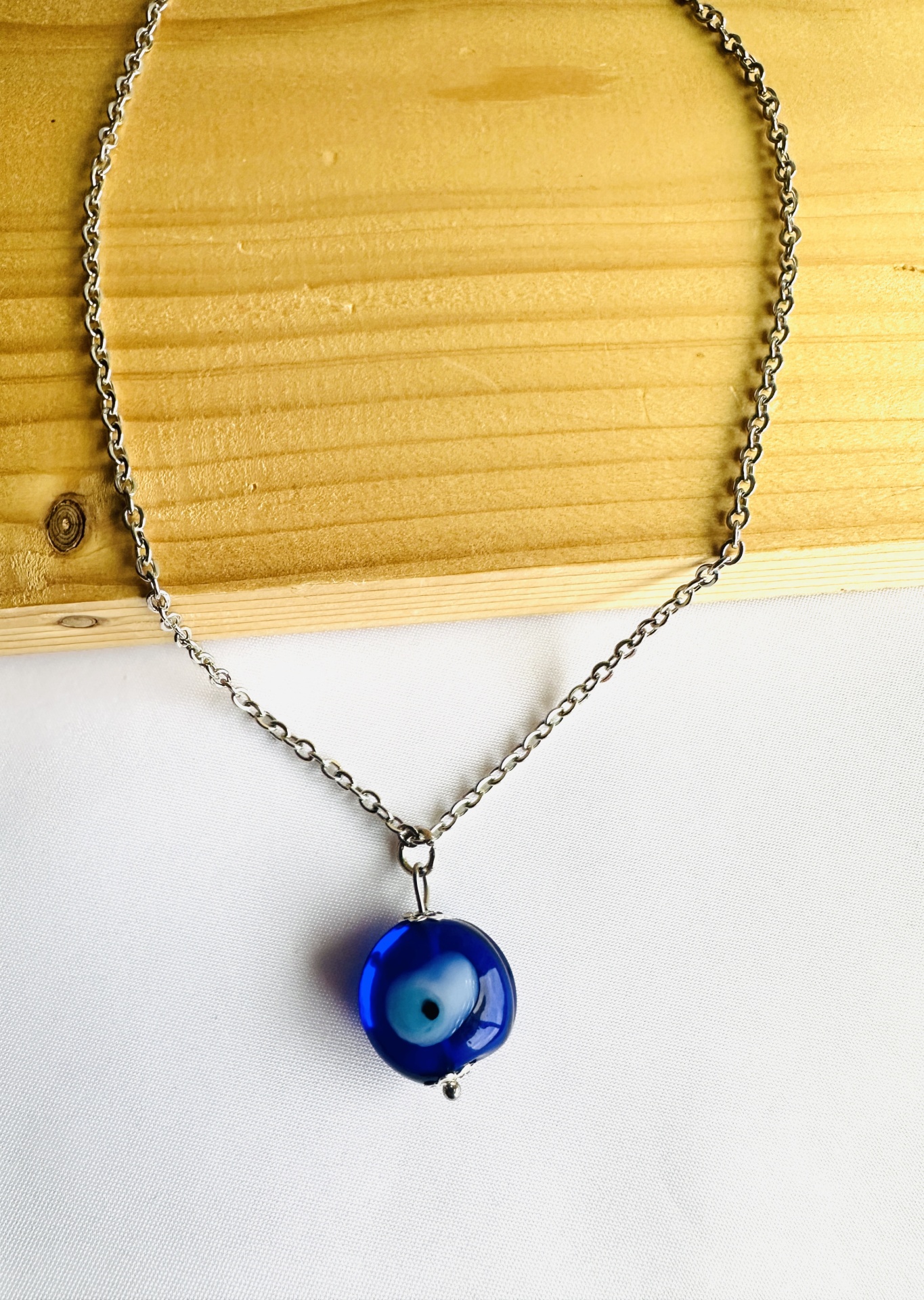 Detalhes, Material e Cor: Este fio apresenta uma delicada corrente em aço, que realça a beleza do pendente. O elemento central é o Olho Grego, numa esfera em vidro Murano, com as suas concêntricas cores azul-escuro, branco e preto, conferindo-lhe uma profundidade visual inigualável. O fio é fabricado em aço, conhecido pela sua resistência e durabilidade, garantindo que o seu amuleto a acompanha por muito tempo.