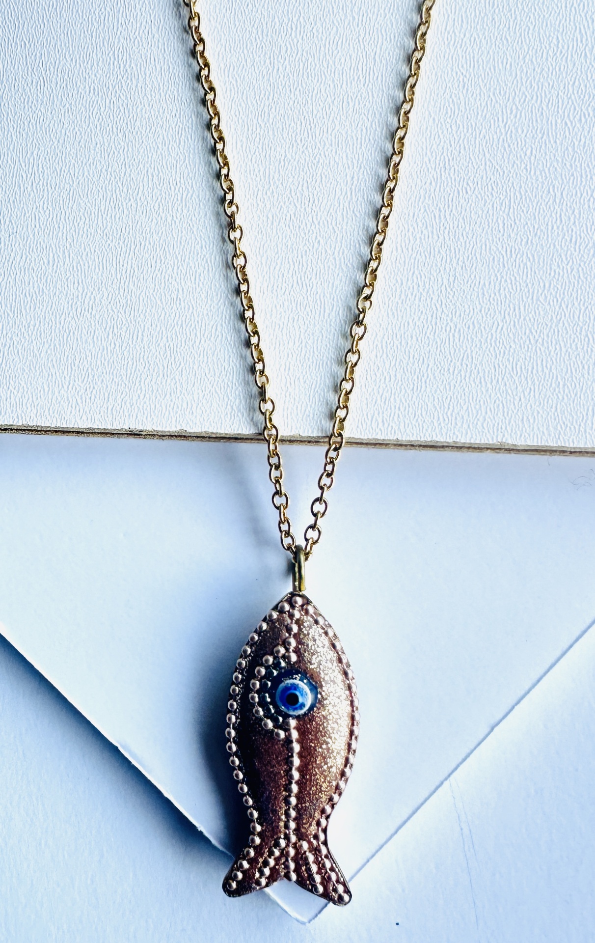 O destaque deste colar em aço dourado é o pendente em forma de peixe, com um acabamento iridescente que reflete uma paleta de cores vibrantes, captando a luz de forma mágica. No seu olho, integra-se um Olho Grego, um poderoso talismã de proteção conhecido por afastar o mau-olhado e as energias negativas, trazendo sorte e serenidade. O pendente de peixe mede aproximadamente 4 cm de altura e 1.8 cm de largura máxima. O fio é em aço dourado, com um comprimento de 42 cm e um extensor adicional de 5 cm, permitindo um ajuste perfeito ao seu decote. Possui um fecho prático e seguro. Poderá verificar-se uma ligeira variação na tonalidade das cores devido à iluminação da fotografia.