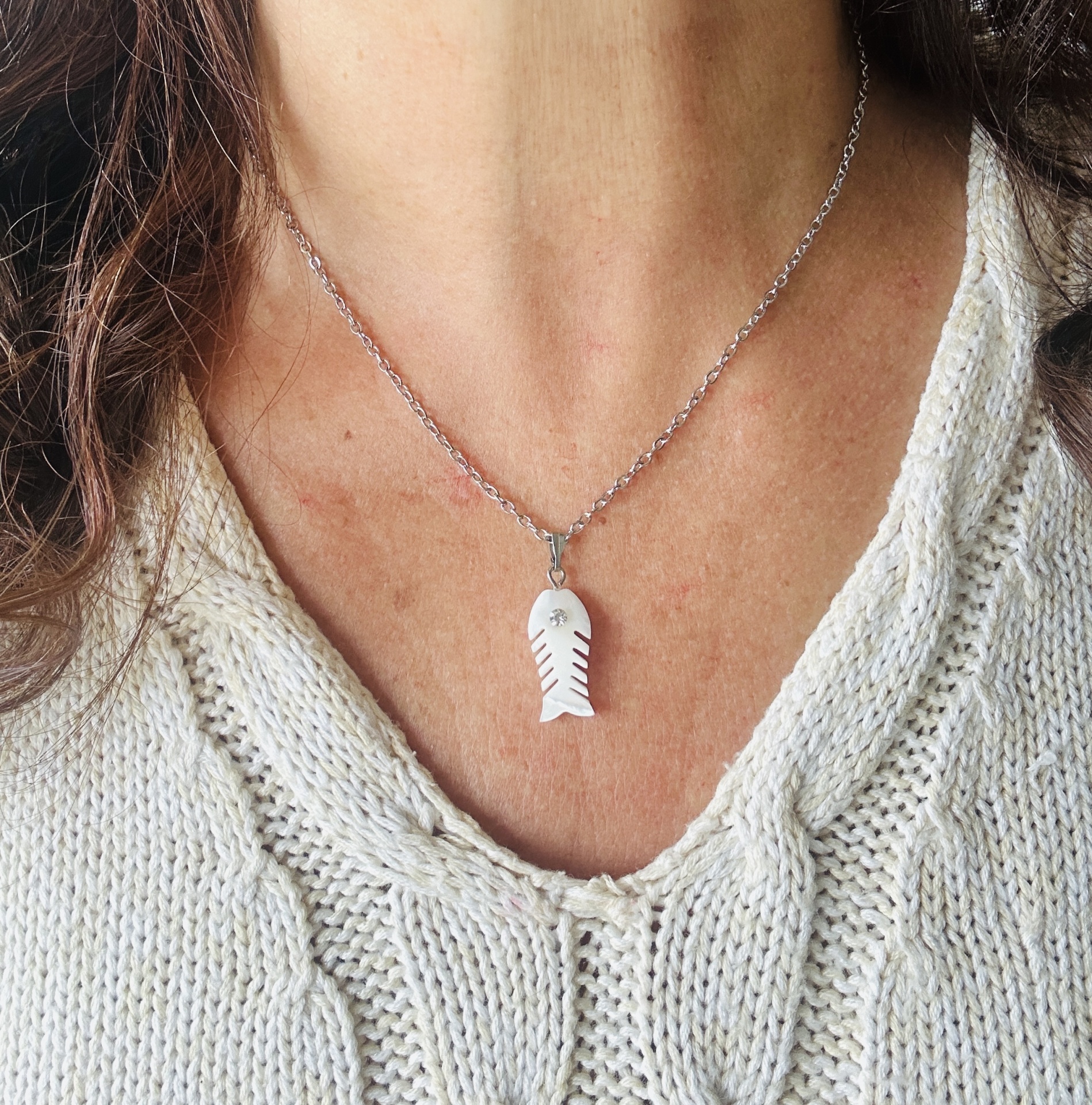 Design Único: O destaque deste fio é um pendente de peixe branco em madrepérola, que confere uma aparência fresca e moderna, evoca a tranquilidade e a beleza do mar.