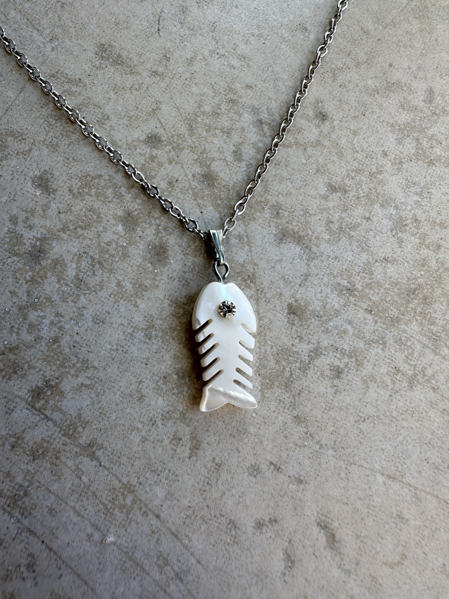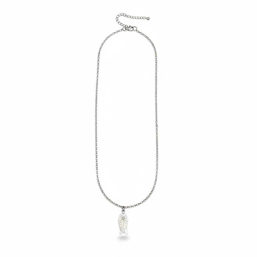 Explore a beleza do oceano com este fio em aço adornado com um delicado peixe branco. Esta peça única é ideal para quem deseja adicionar um toque náutico e contemporâneo ao seu estilo.