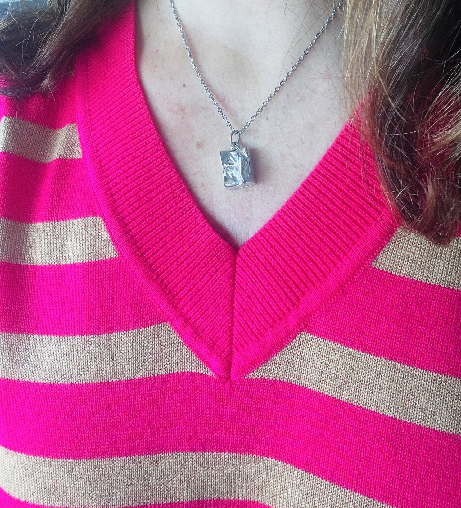 Pendurado delicadamente neste fio está um pingente retangular, que adiciona uma dose de sofisticação moderna à peça. O design minimalista e refinado deste colar torna-o uma escolha versátil para complementar qualquer conjunto, seja para ocasiões formais ou para adicionar um toque de glamour ao seu visual do dia a dia.