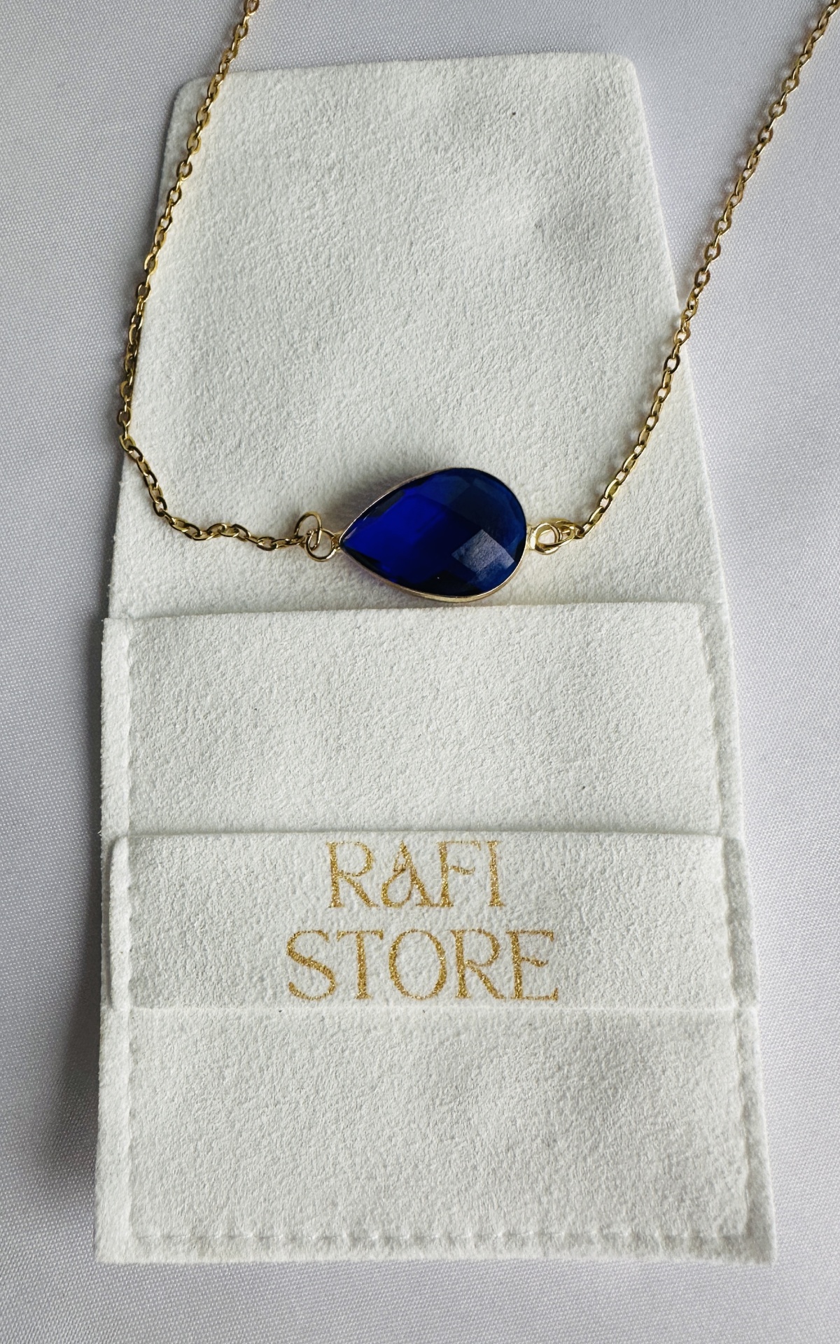 Este colar em aço dourado e cristal azul tem uma forma e estilo único. Este colar pode ser usado como um presente ou para si mesmo.