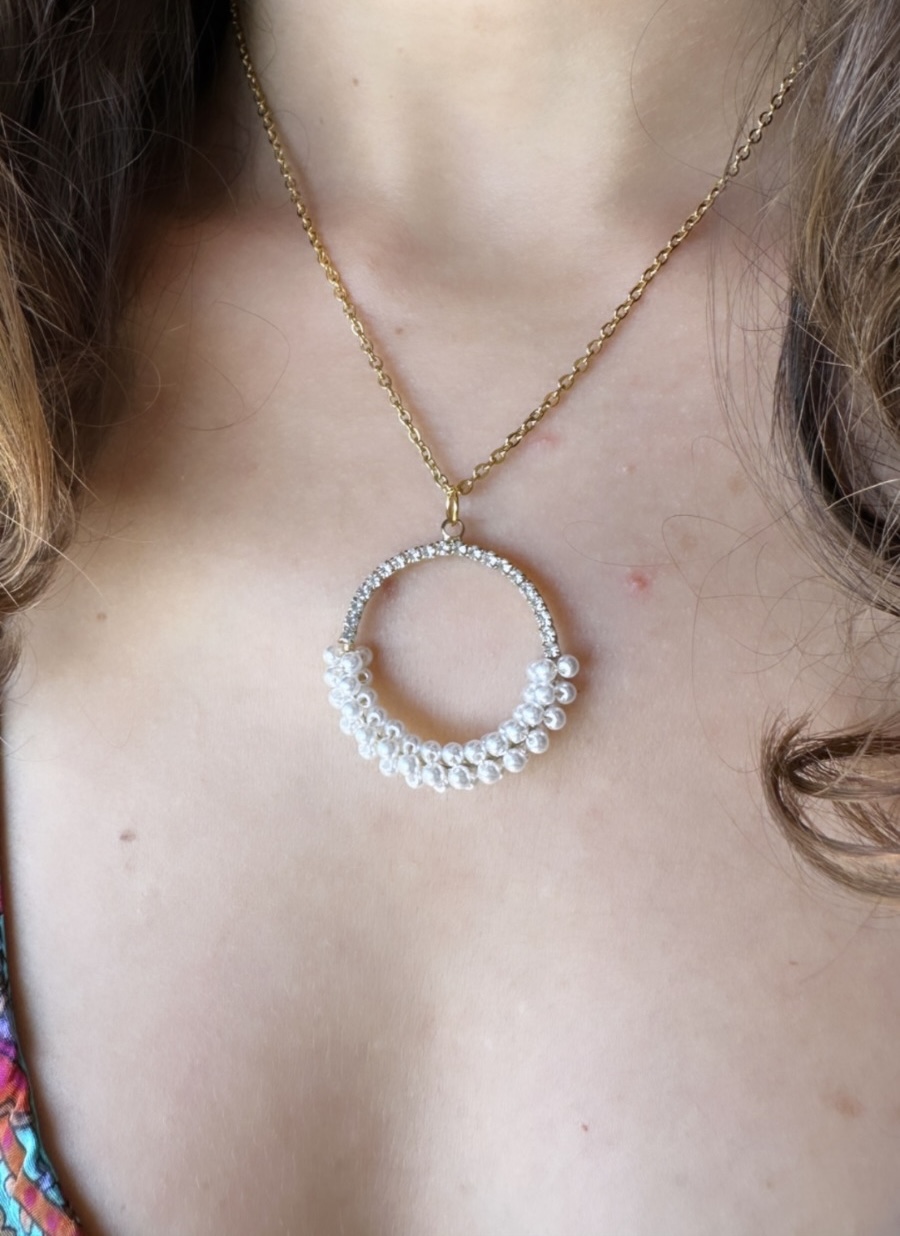 Design Exclusivo: O pêndulo em forma de aro com 3 centímetros de diâmetro, decorado com pérolas mini e zircónias, acrescenta um toque de elegância e brilho ao colar.