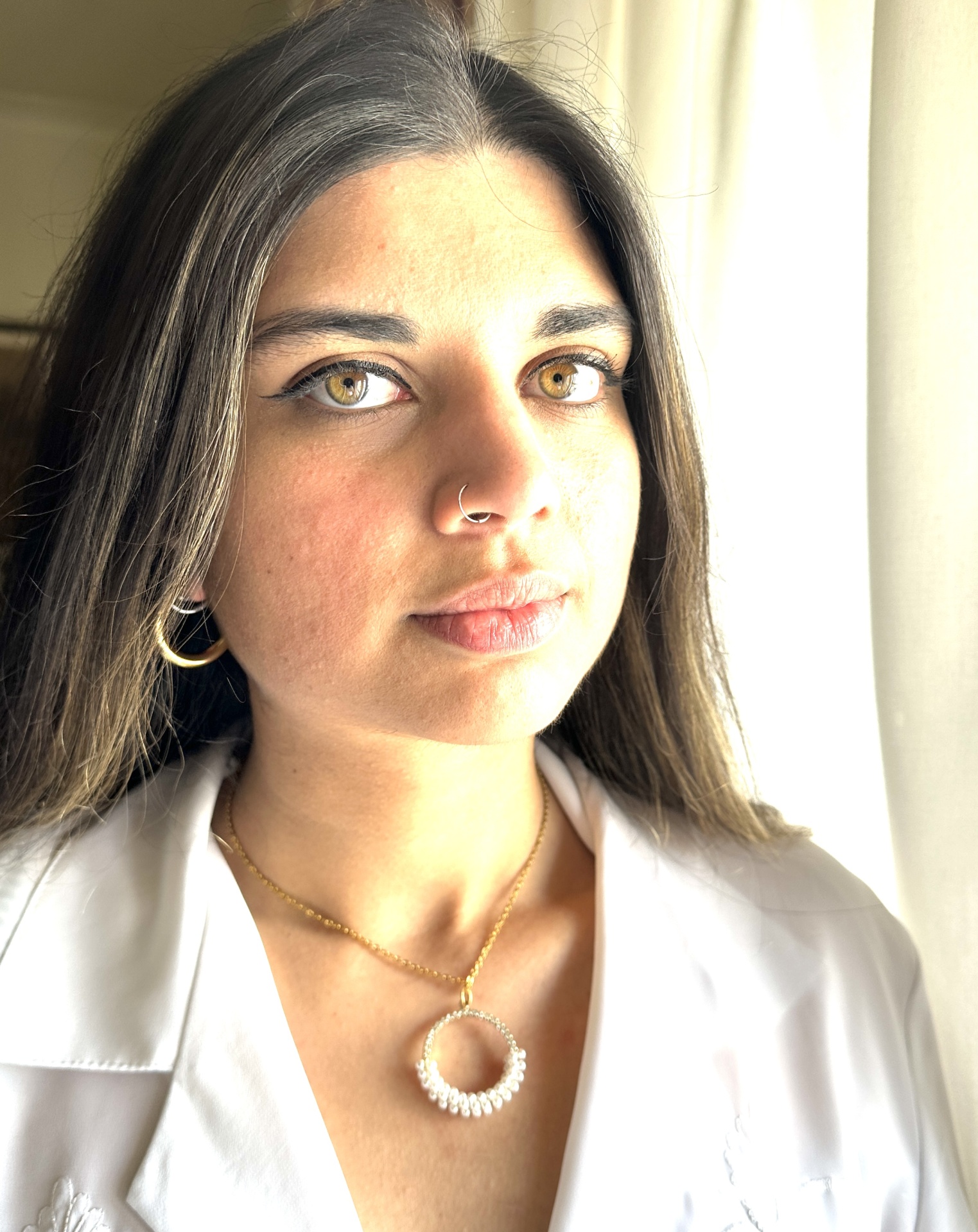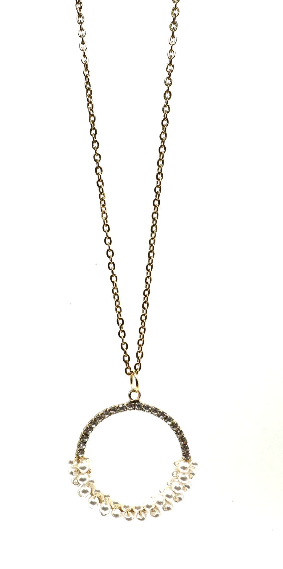 Adquira agora o nosso fio em aço dourado com pêndulo em forma de aro, pérolas mini e zircônias, e adicione um toque de elegância e brilho a qualquer visual. Este colar versátil e deslumbrante é perfeito para todas as ocasiões.