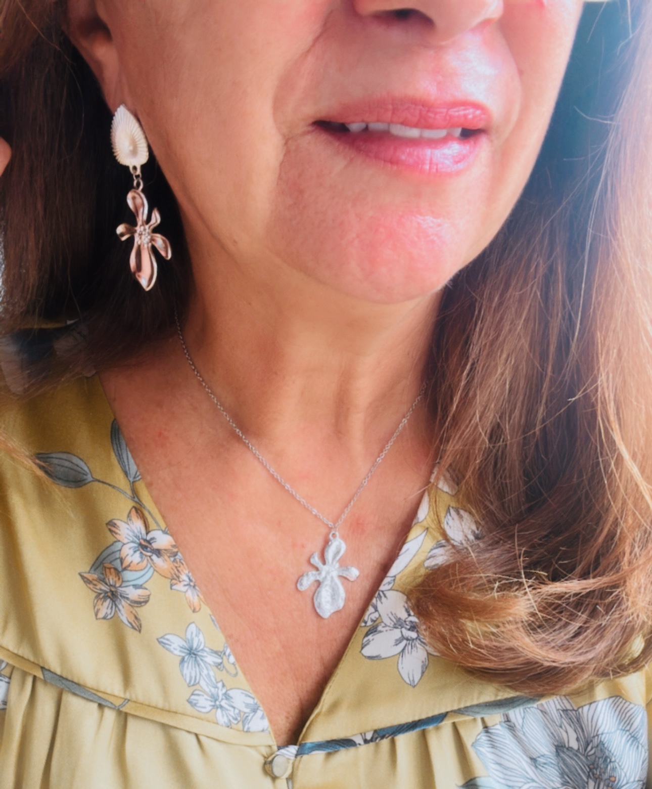 Formato: Gota texturizada na parte superior e pingente de flor estilizada.